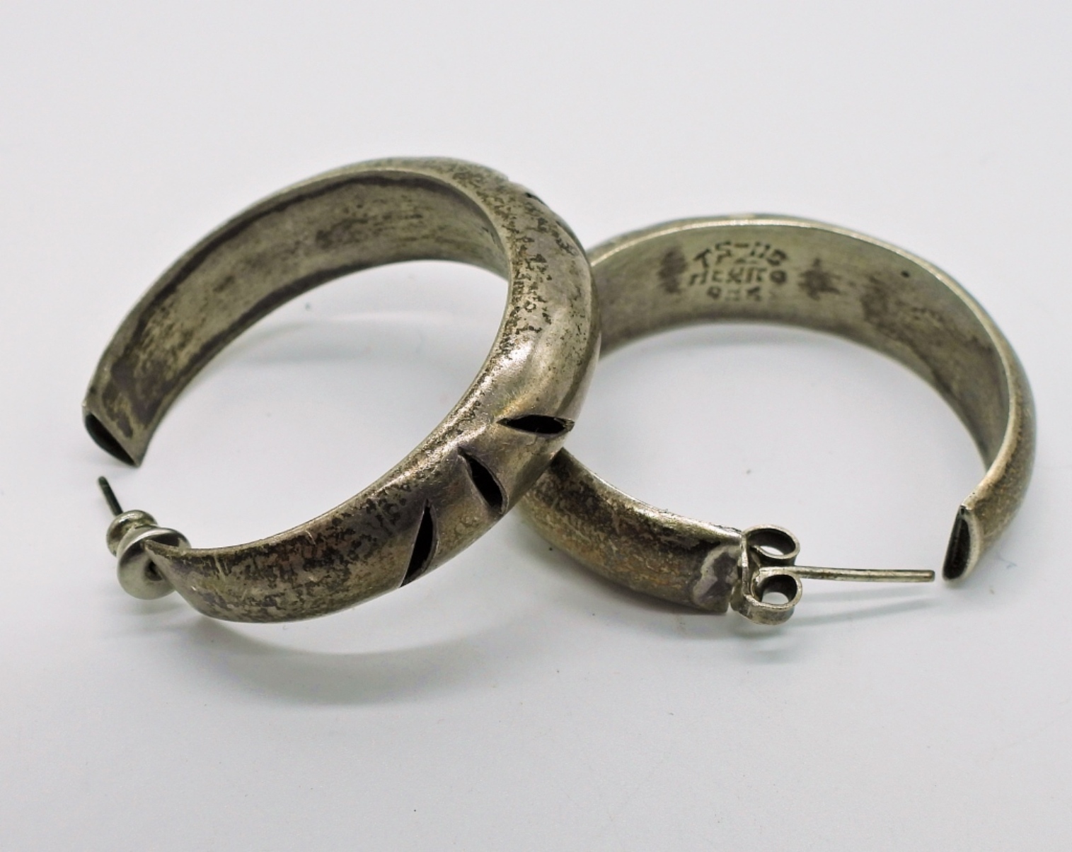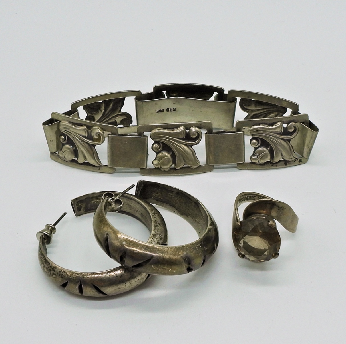 VINTAGE MEXICAN STERLING SMOKEY QUARTZ SIZE 7.5 RING, 7″ BRACELET & MEXICAN STERLING HOOP EARRINGS. 26.6 DWT