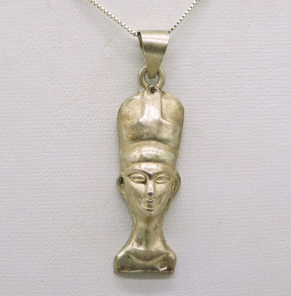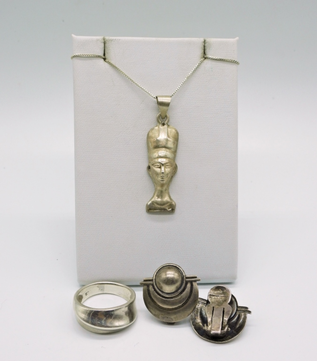 18″ STERLING NECKLACE WITH EGYPTIAN PENDANT. SIZE 8 STERLING RING. VINTAGE STERLING CLIP ON EARRINGS. 12.3 DWT