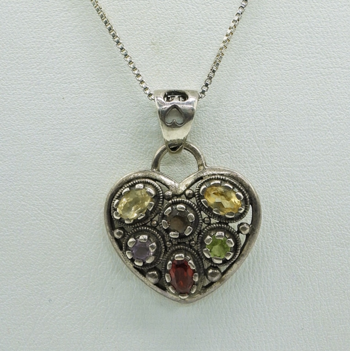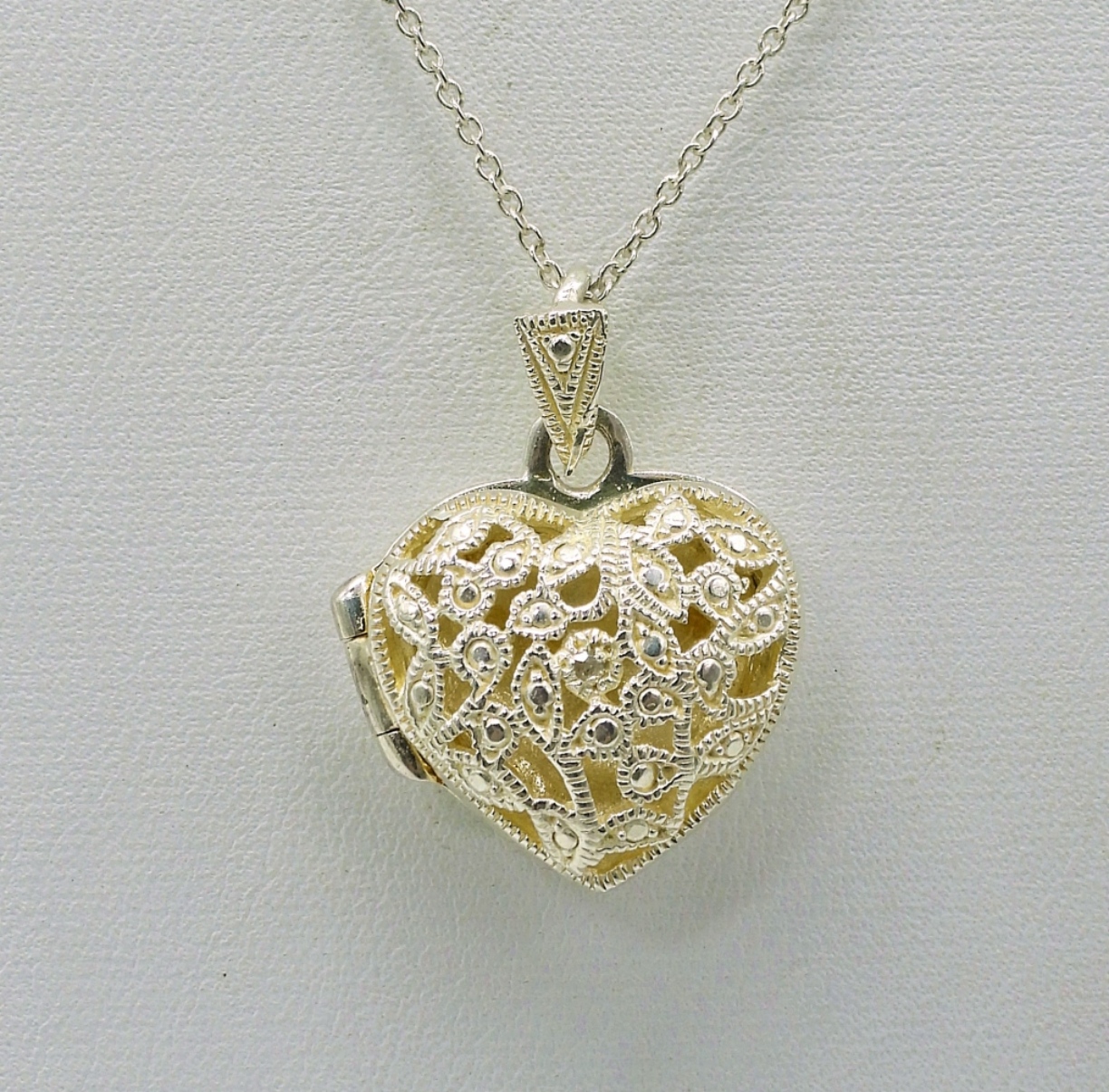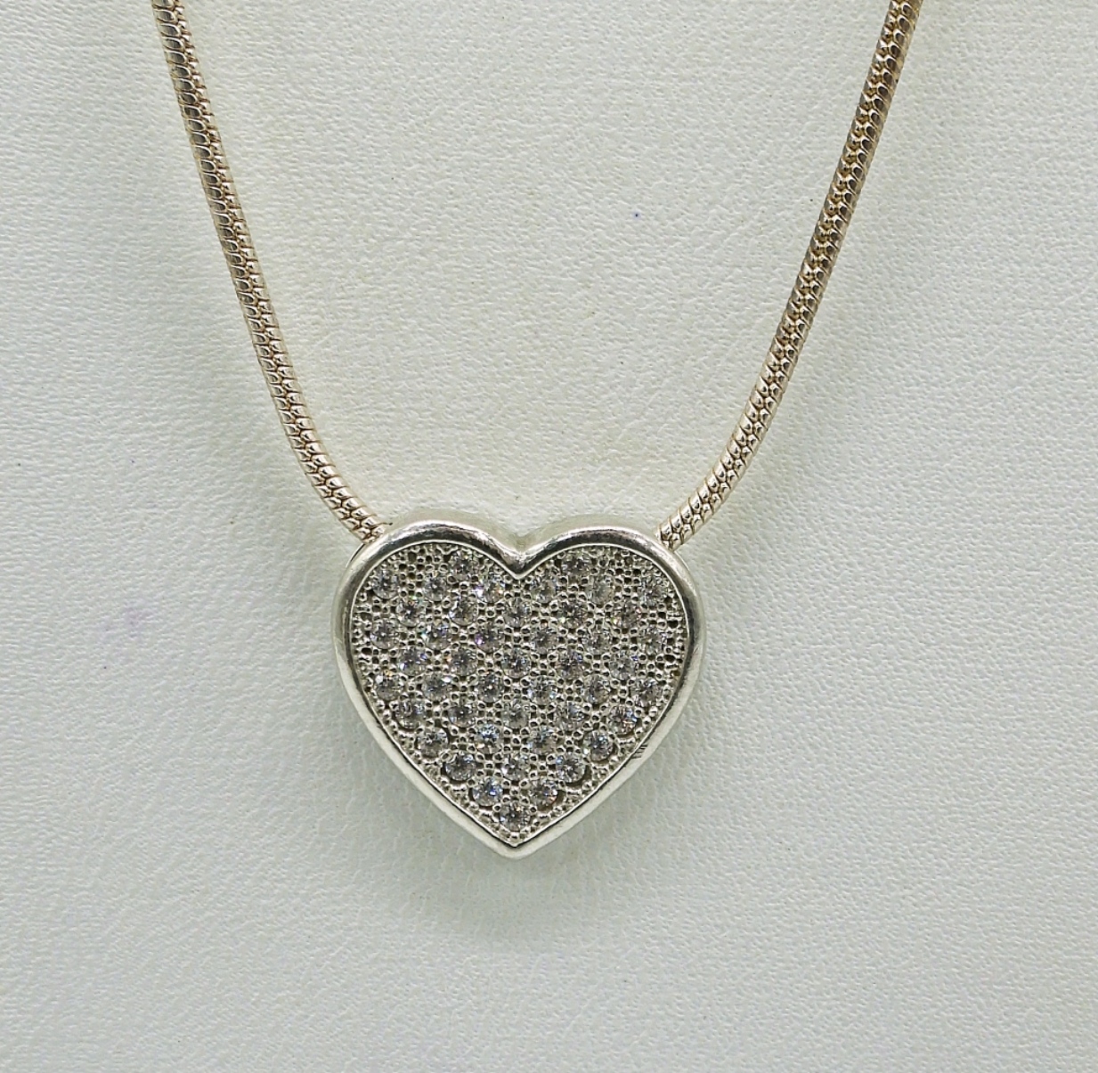 3 STERLING HEART SHAPED PENDANTS ON STERLING CHAINS. 22″ PAVE STYLE, 18″ GEMSTONE HEART, 18″ LOCKET. 13.6 DWT