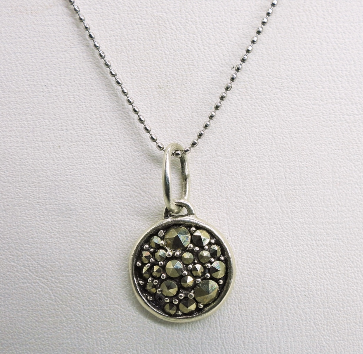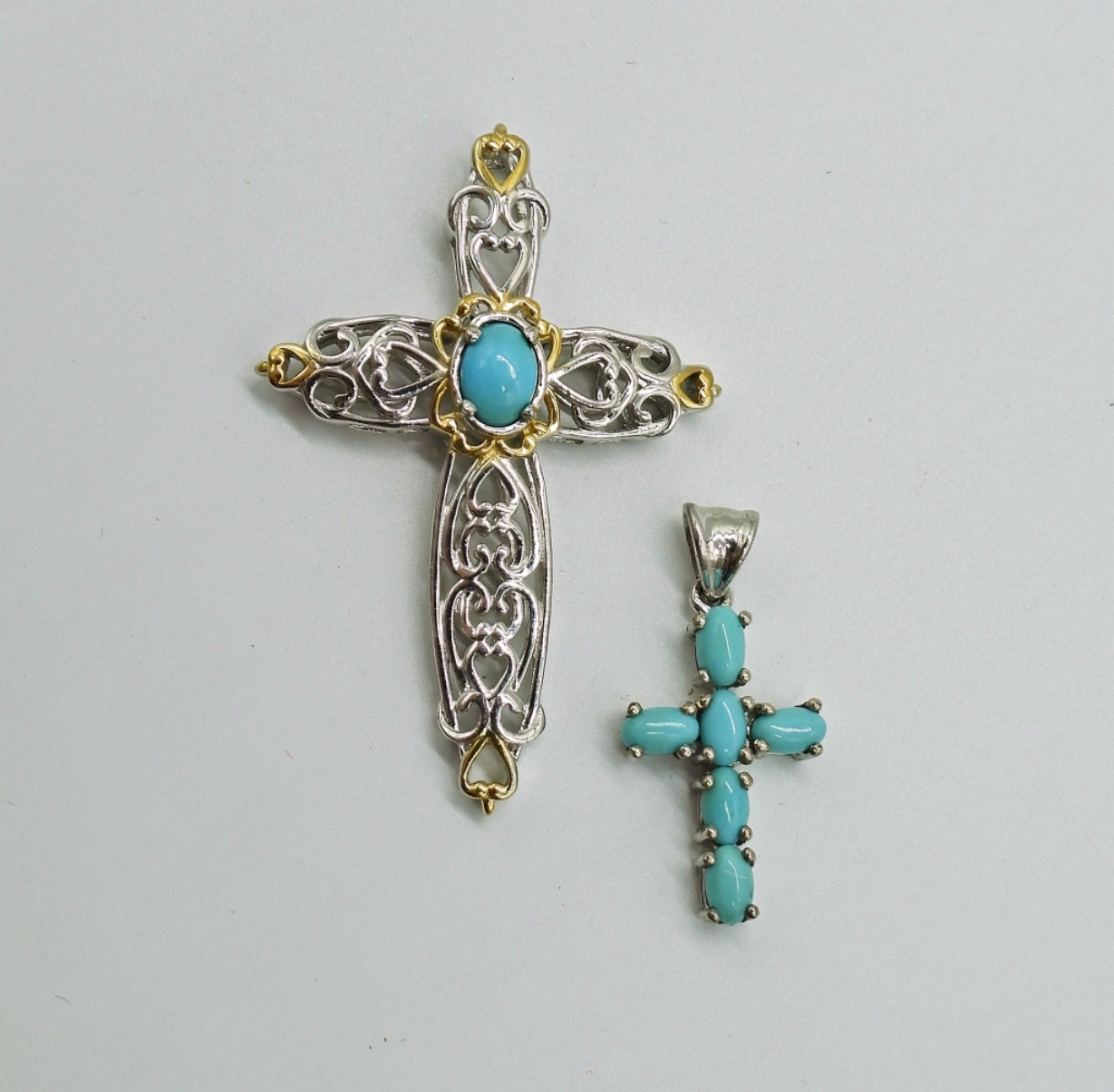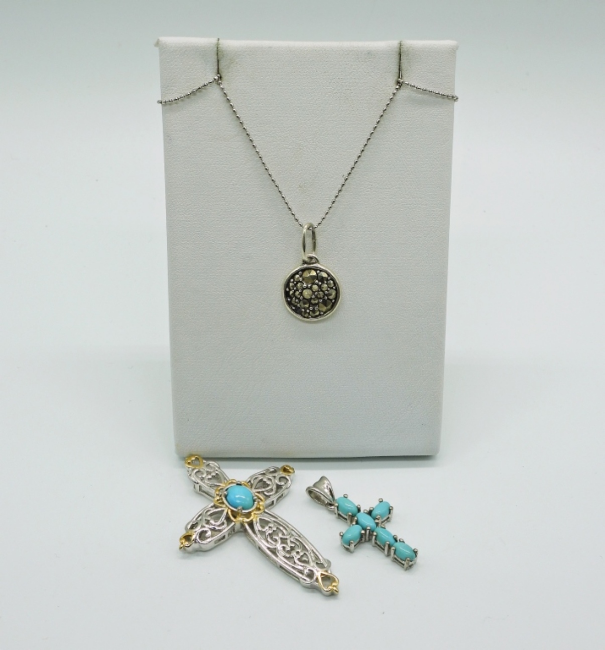 2 STERLING CROSS NECKLACES WITH BLUE GEMSTONES AND ONE MARCASITE PENDANT ON AN 18″ STERLING CHAIN. 5.6 DWT