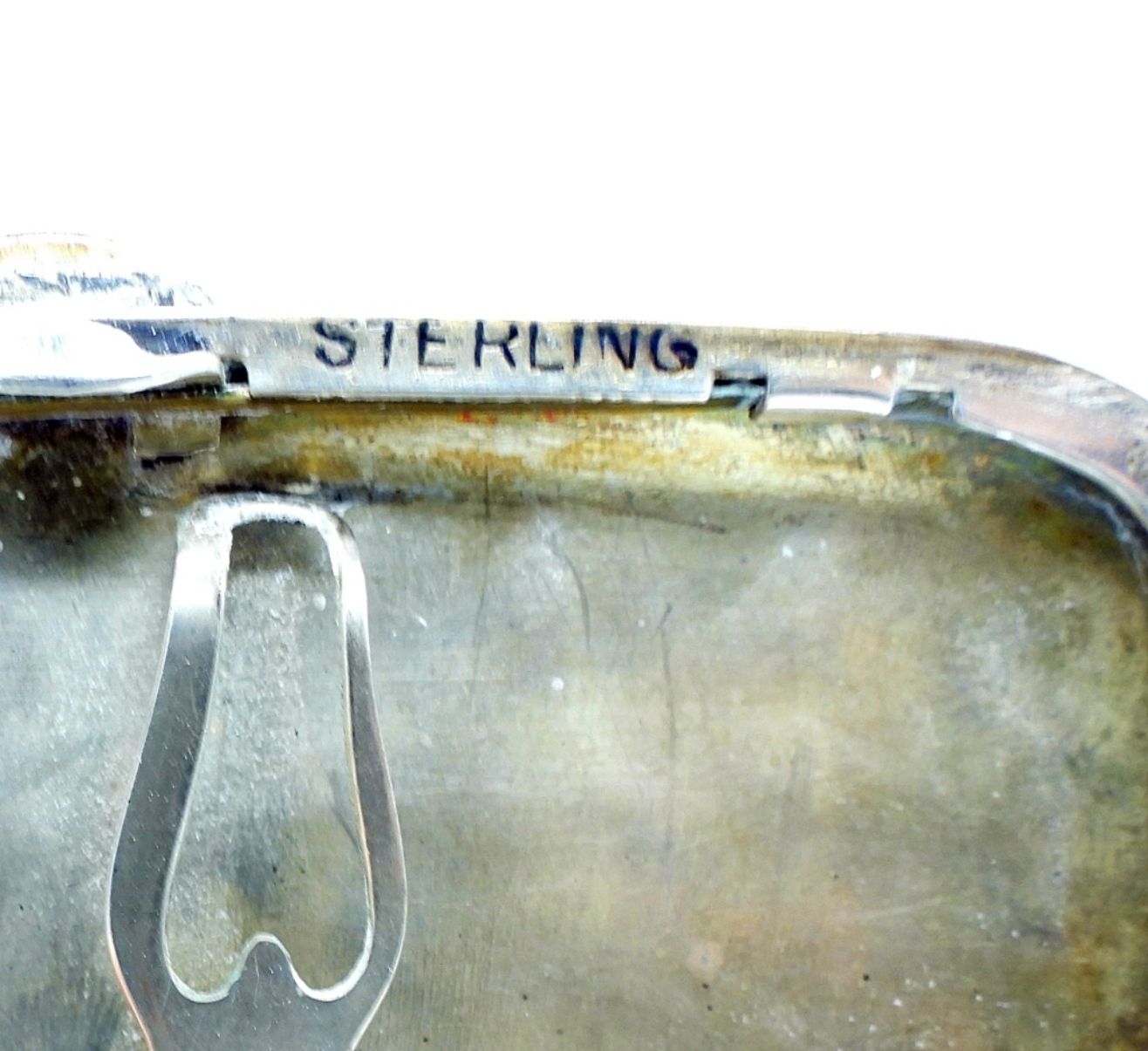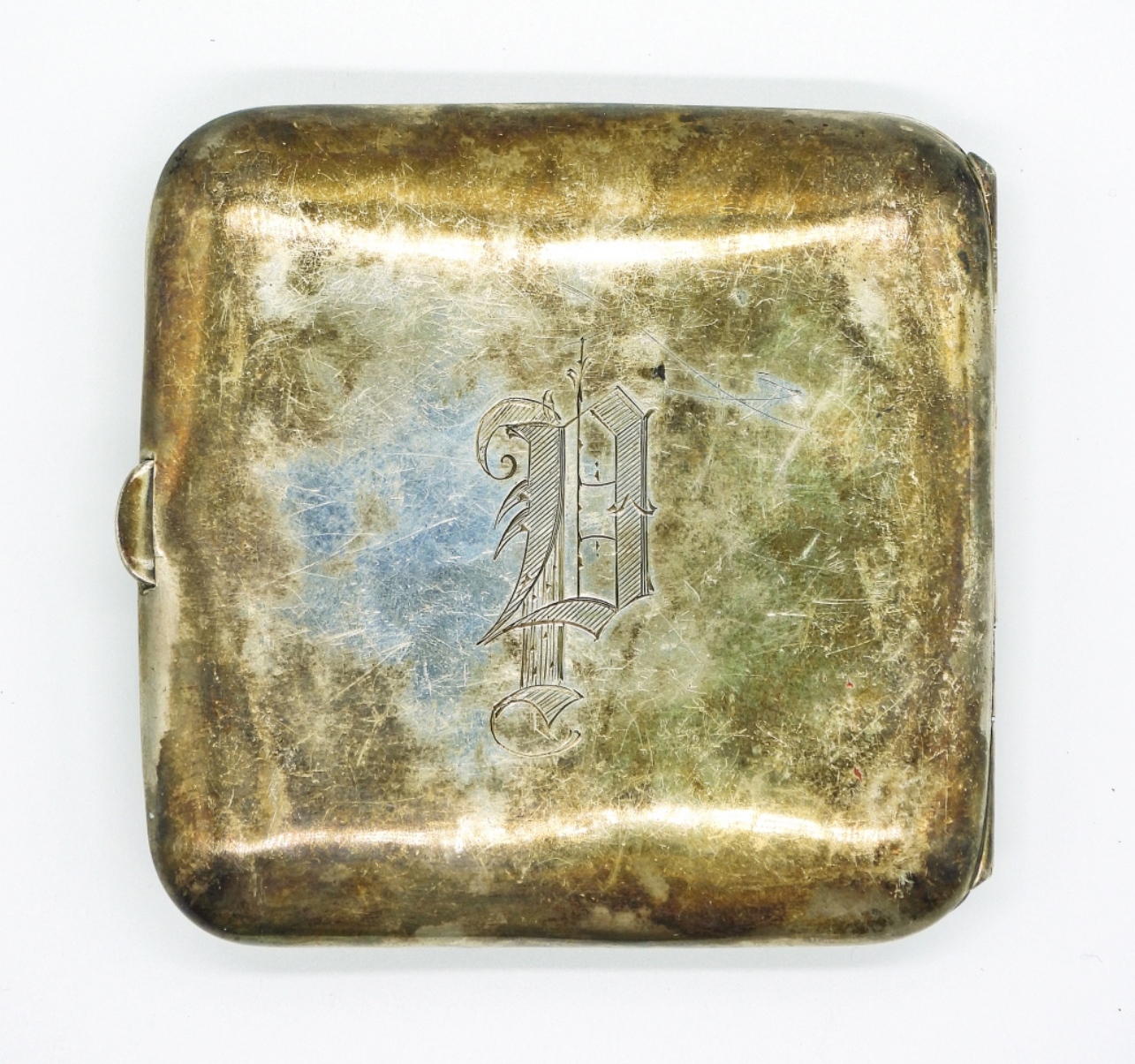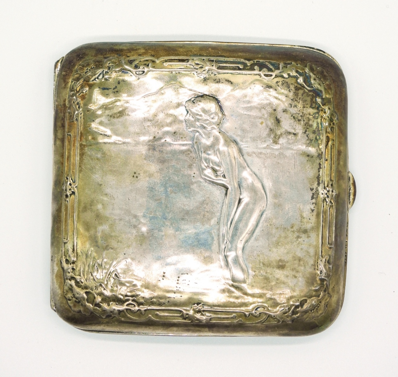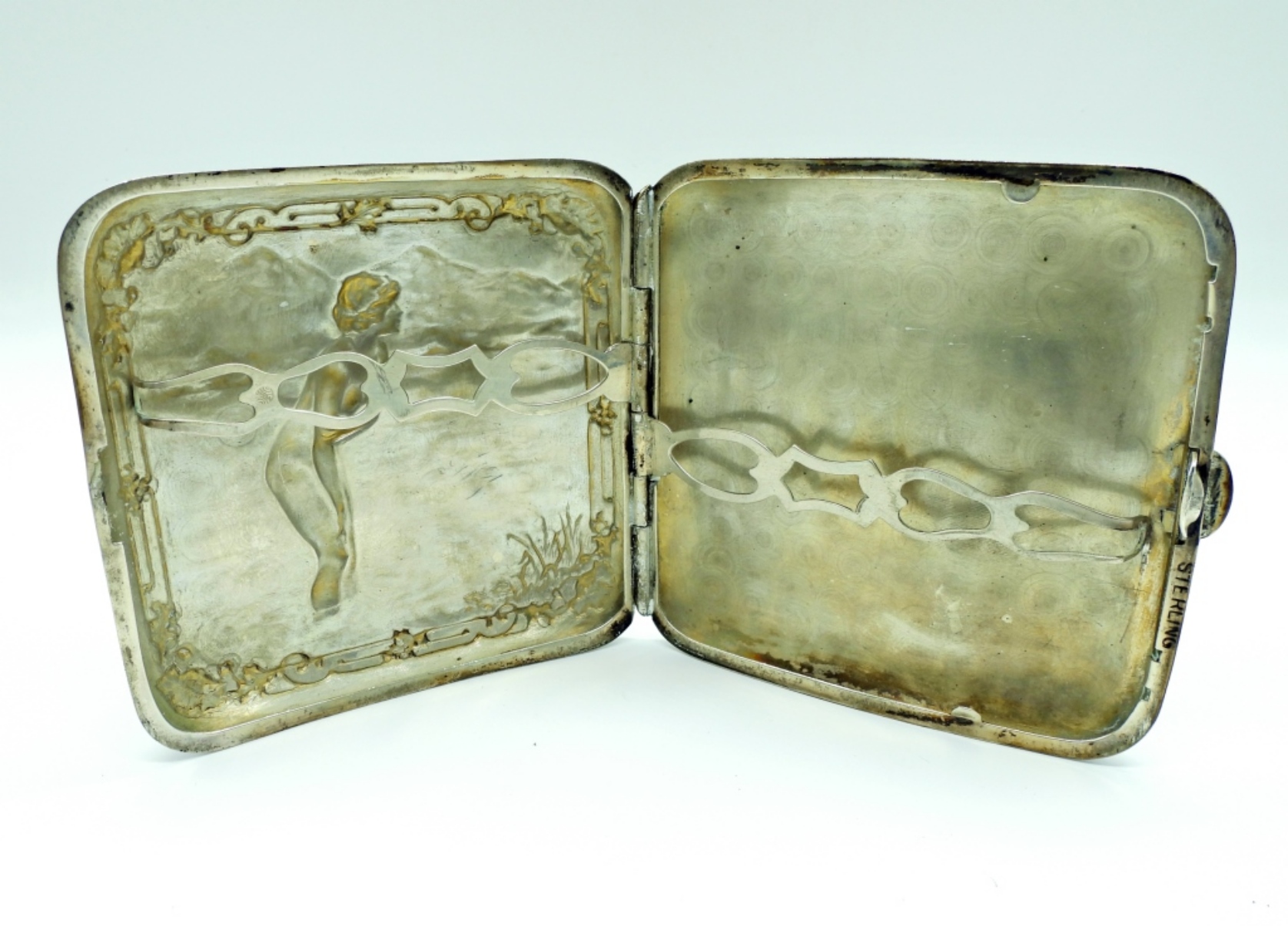 VINTAGE STERLING CIGARETTE CASE WITH NUDE WOMAN ON THE FRONT, BACK IS ENGRAVED WITH A LETTER. MEASUREMENTS ARE 3.5″x3.5″. MARKED “STERLING”. 52.7 DWT