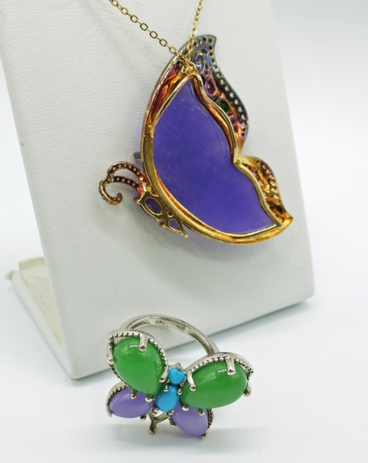STERLING GOLD TONE BUTTERFLY NECKLACE WITH PURPLE JADE, AMETHYST, SWISS BLUE TOPAZ & RHODOLITE GARNET ON AN 18″ CHAIN. SIZE 6 BUTTERFLY RING WITH GREEN AND PURPLE JADE. RING IS MISSING ONE GEMSTONE. 12.5 DWT