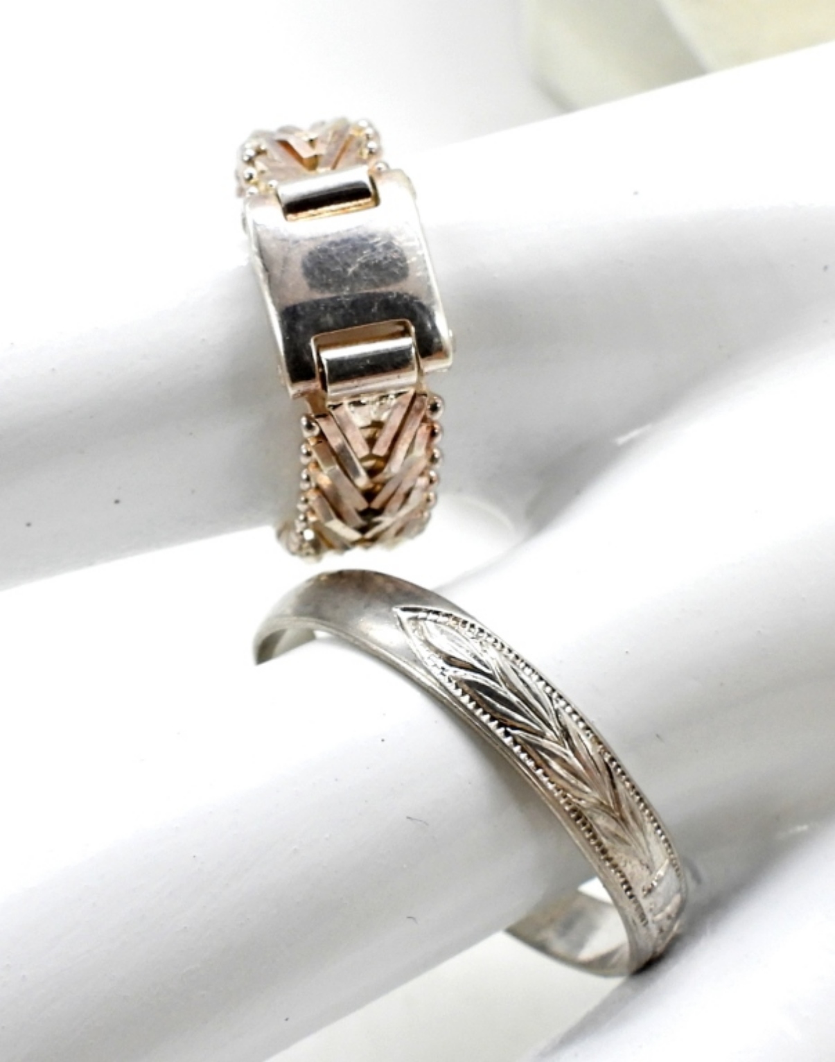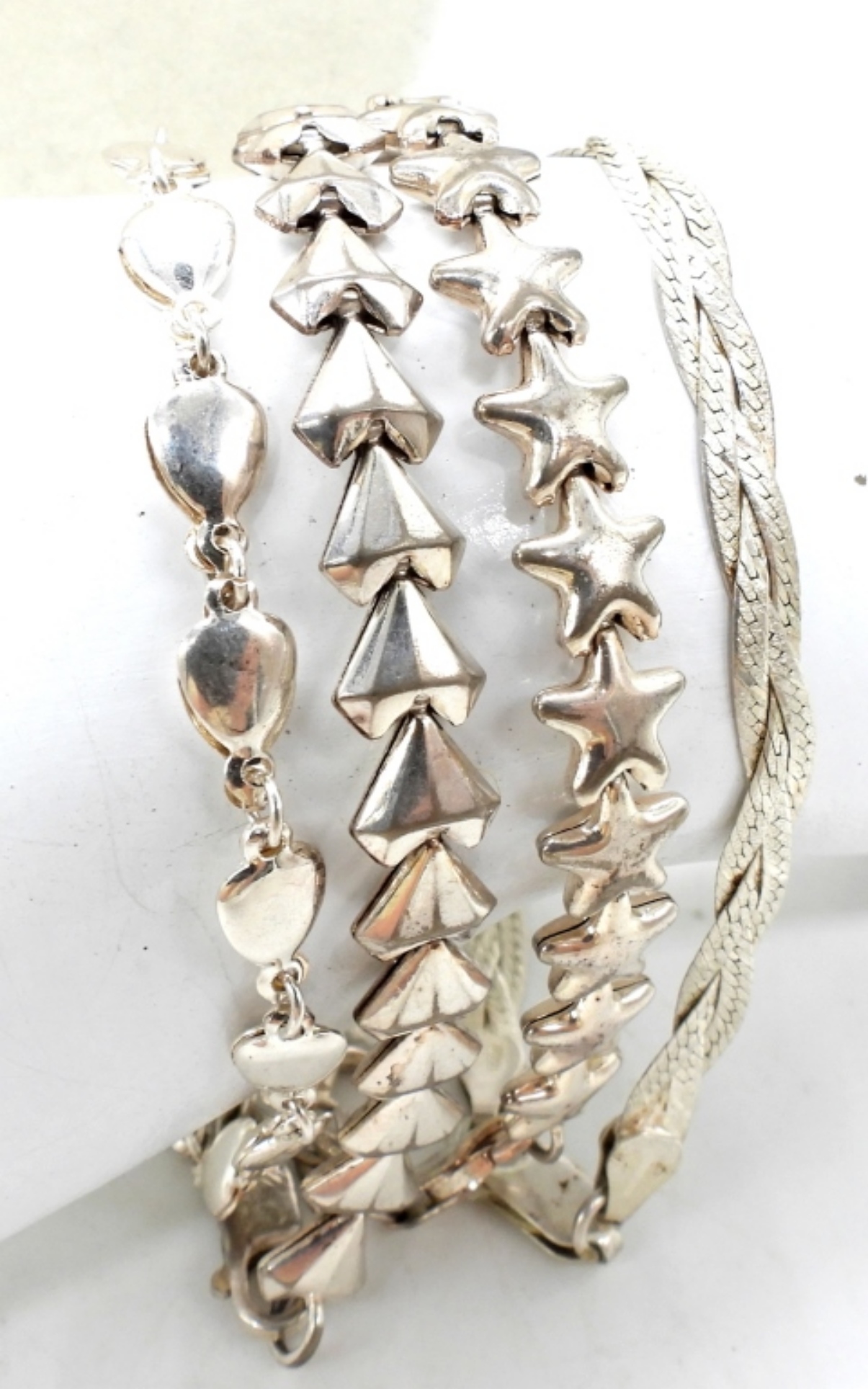 BRAIDED STERLING CHAIN (18″) WITH MATCHING BRACELET (7″). STAR BRACELET (7.5″), OVAL BRACELET (7″), 7.5″ DIAMOND SHAPE BRACELET. RINGS ARE SIZES 7 & 11.5. 29.4 DWT