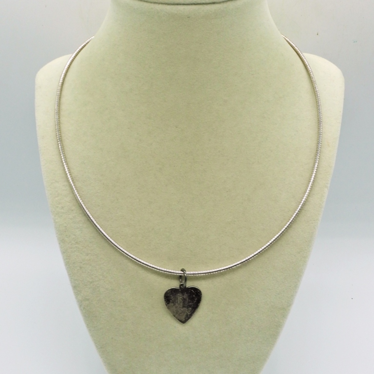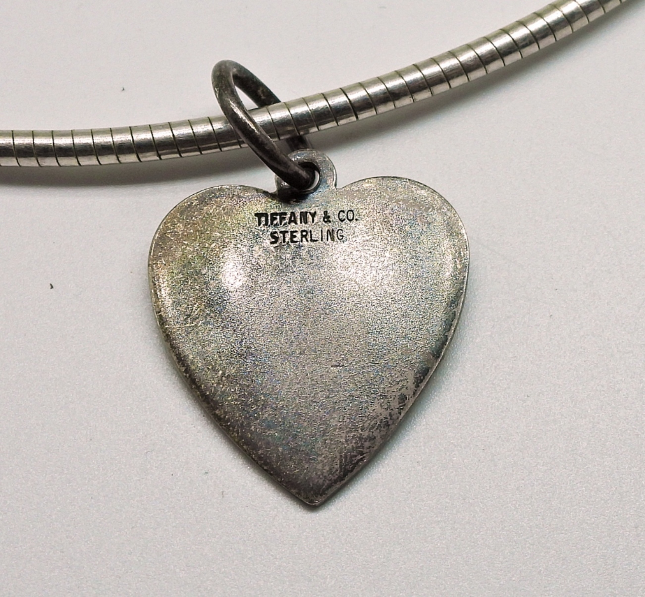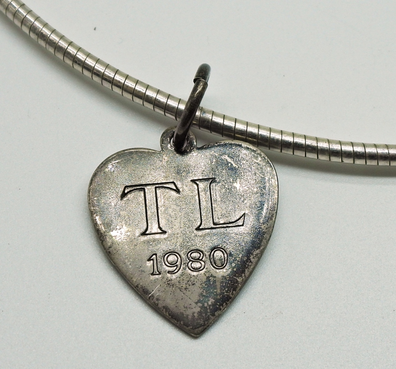 HEART SHAPED PENDANT, TIFFANY & CO. FRONT ENGRAVED WITH “TL 1980”, BACK “TIFFANY & CO STERLING”. ON A 18″ STERLING CHAIN (NOT FROM TIFFANY). PENDANT IS TARNISHED, BUT EASILY CLEANED. 12.7 DWT