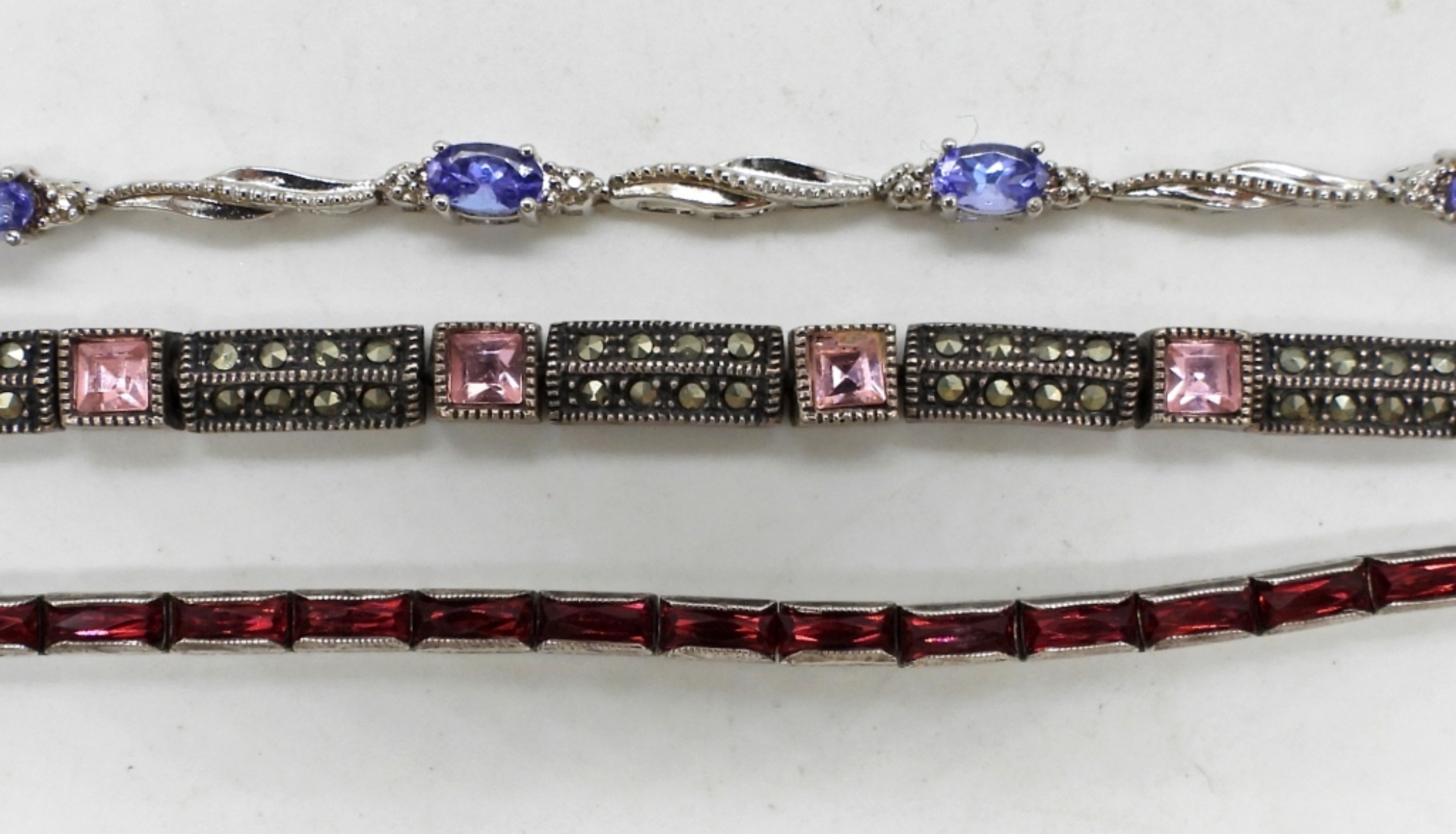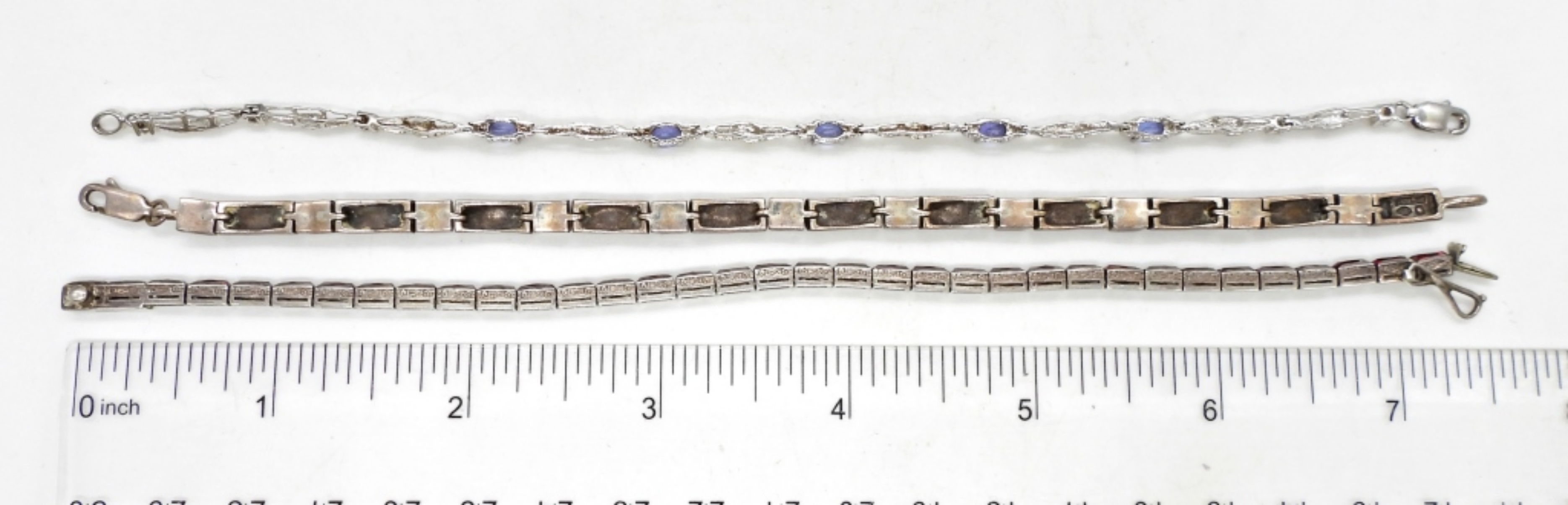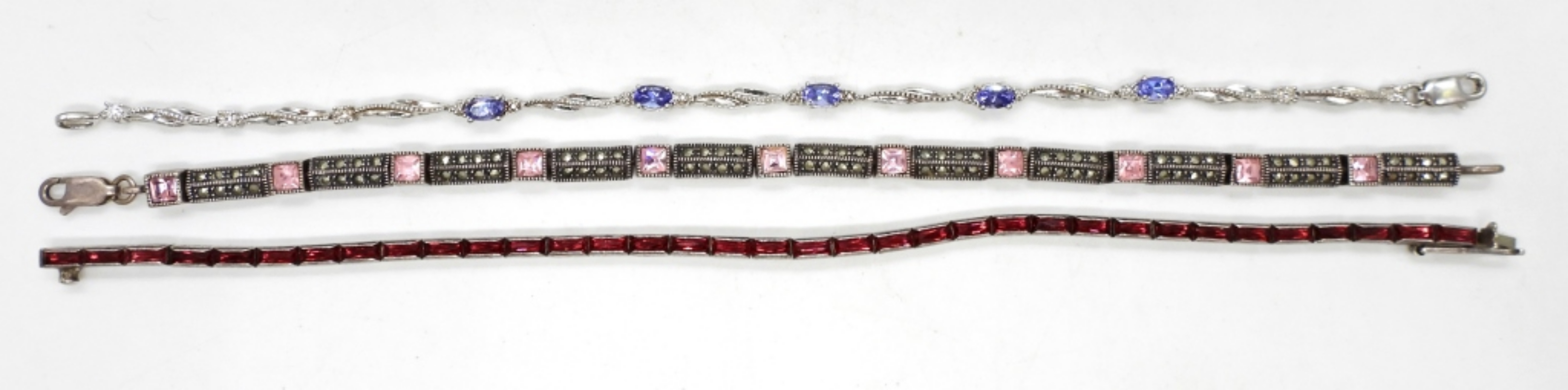 3 STERLING SILVER BRACELETS, 7.5″ WITH GEMSTONES. 18 DWT