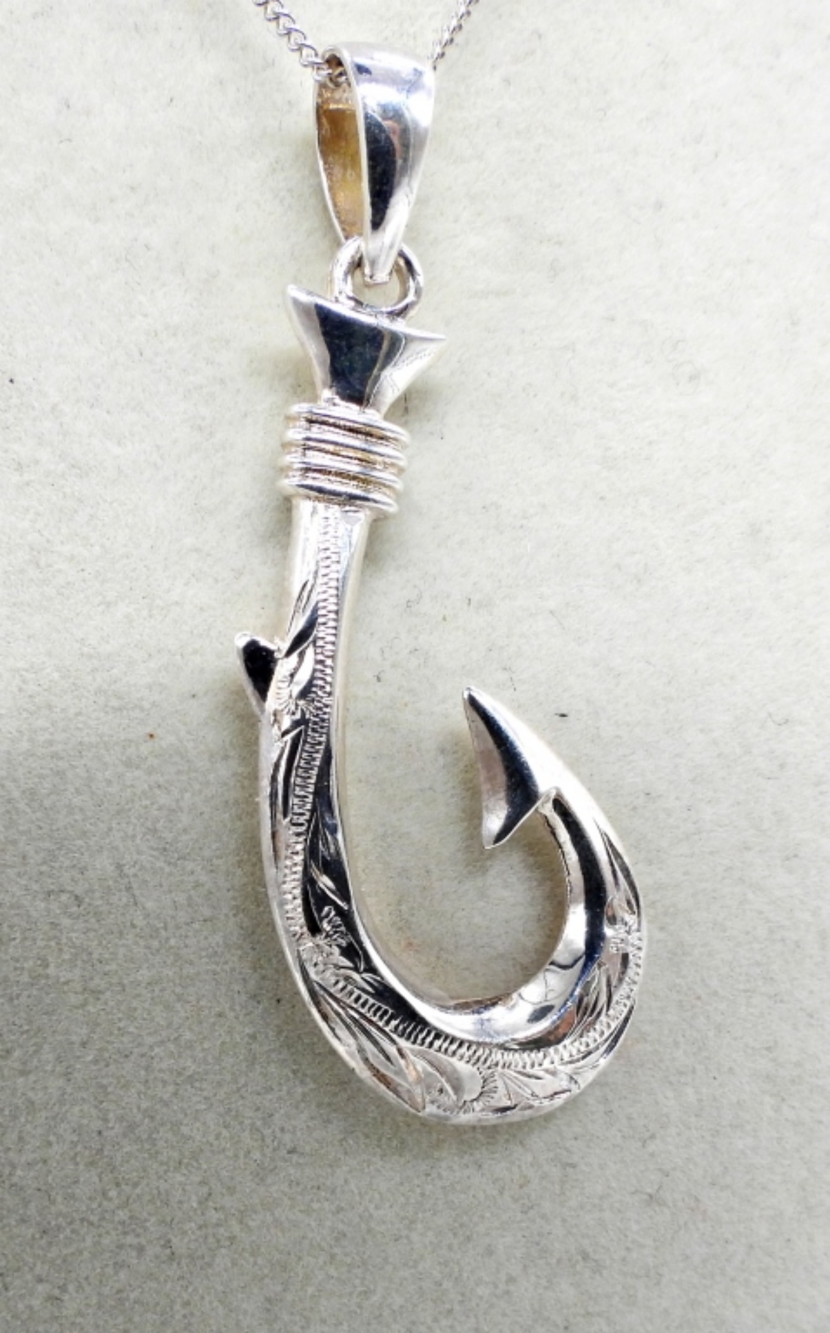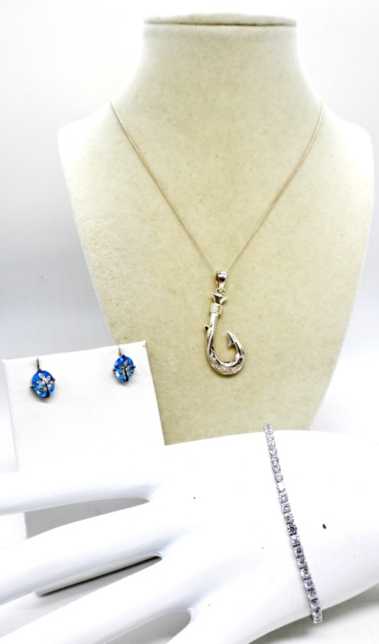 STERLING 3D SOLID FISH HOOK PENDANT, HAWAIIAN, ON AN 18″ CHAIN. 7″ WHITE GEMSTONE STERLING BRACELET. BEAUTIFUL BLUE, STERLING EARRINGS. 10.4 DWT