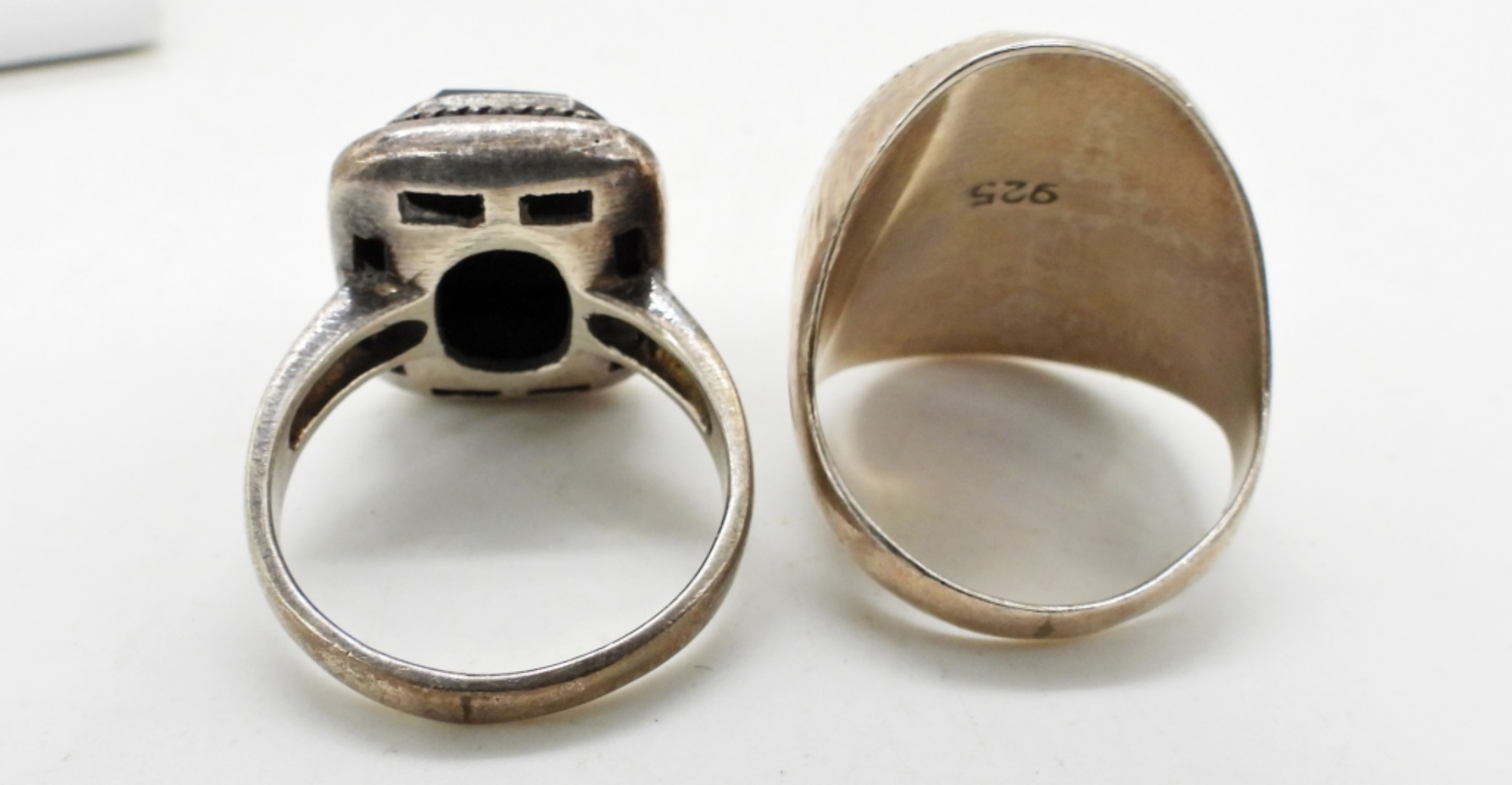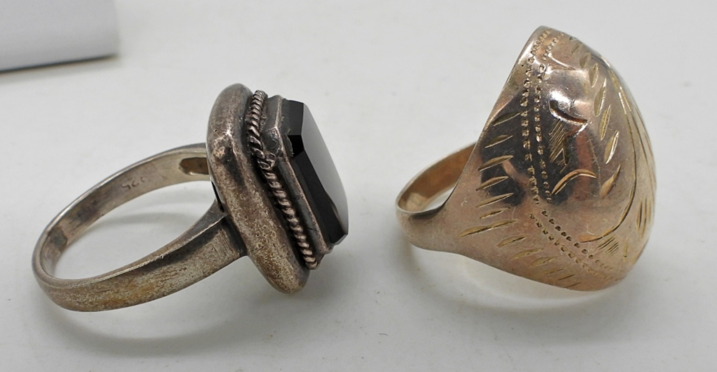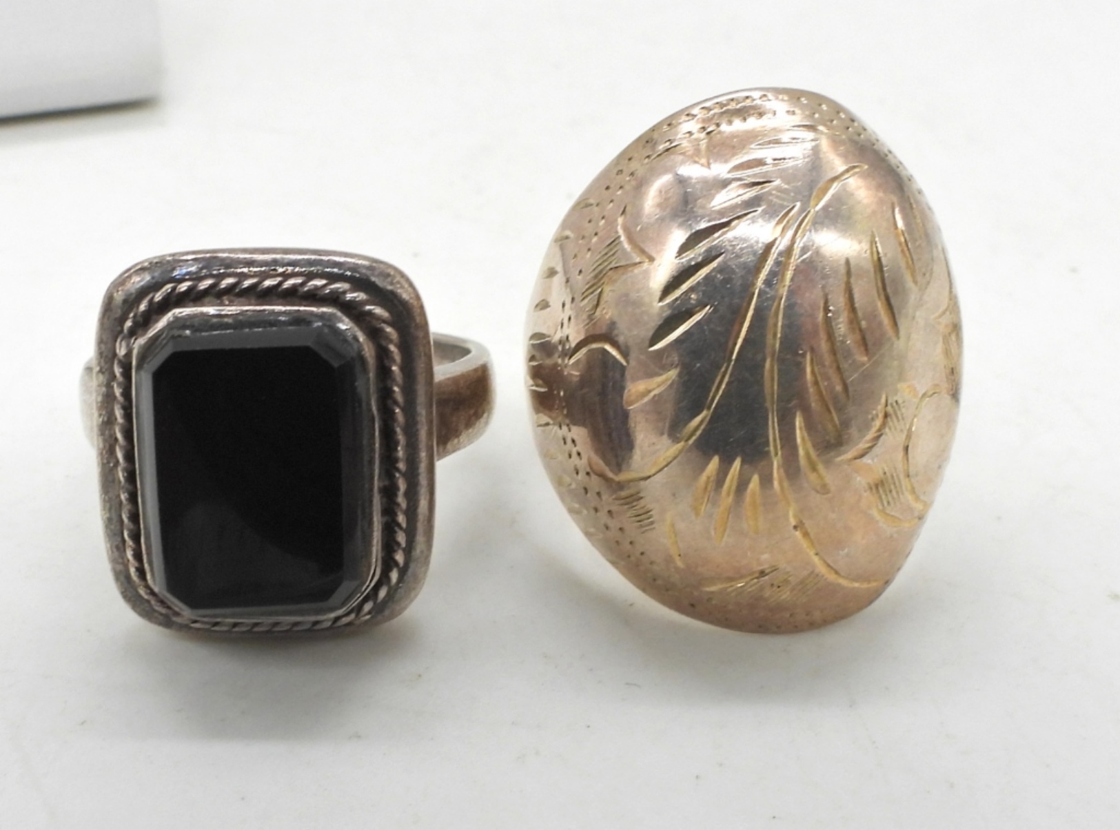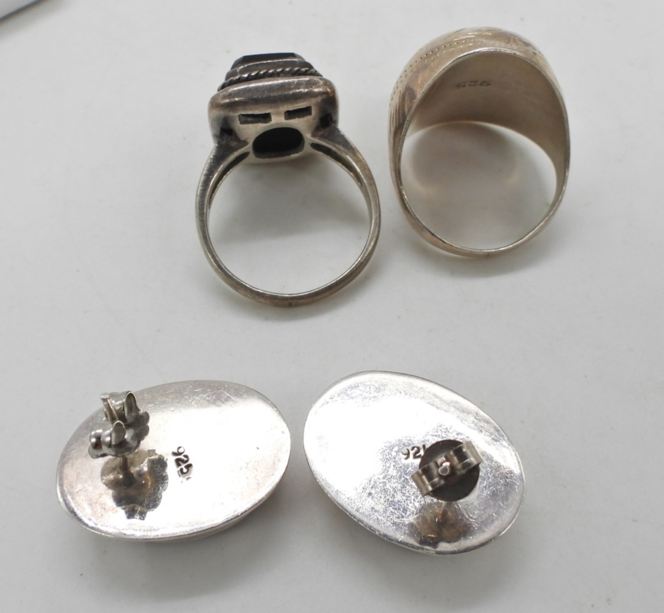 STERLING ONYX RING SIZE 8.5. STERLING ETCHED RING, 8.5. STERLING ONYX EARRINGS, PIERCED. 14.5 DWT