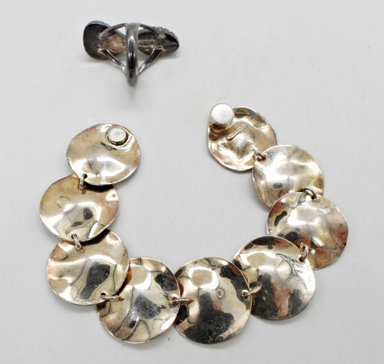 JOSEPH ESPOSITO STERLING BRACELET WITH MAGNETIC CLASP, 8″. TOM WILLET SIGNED SIZE 8 RING, STERLING. 25.9 DWT
