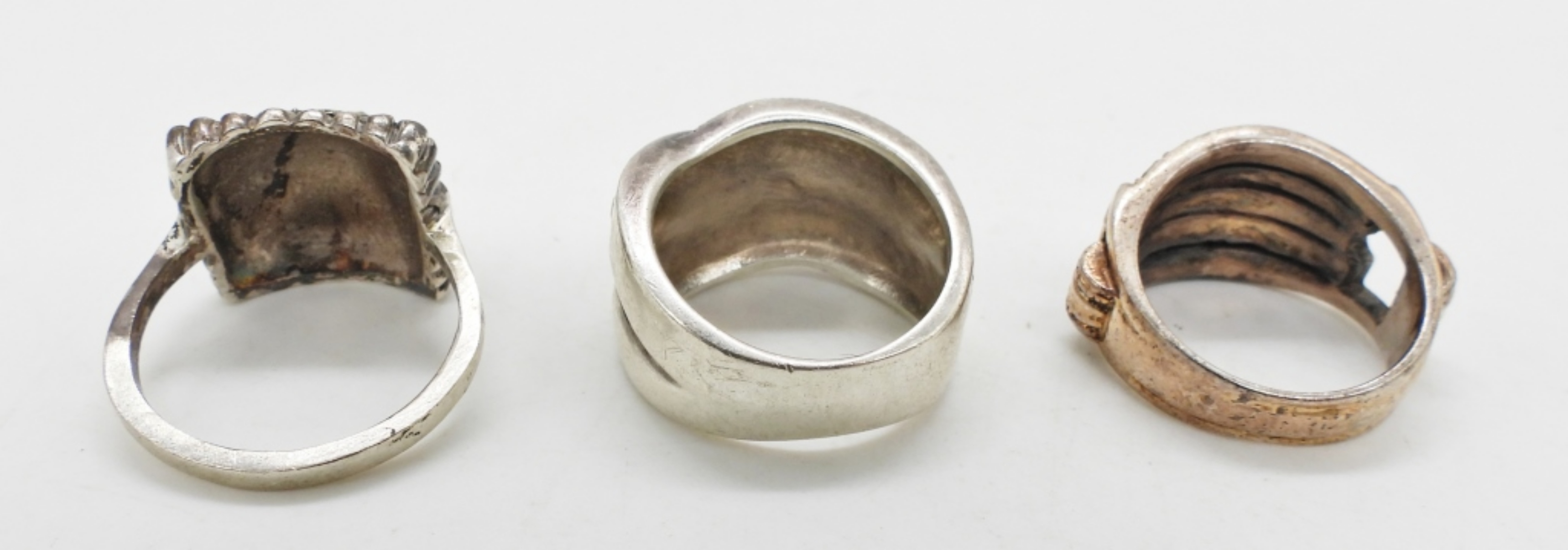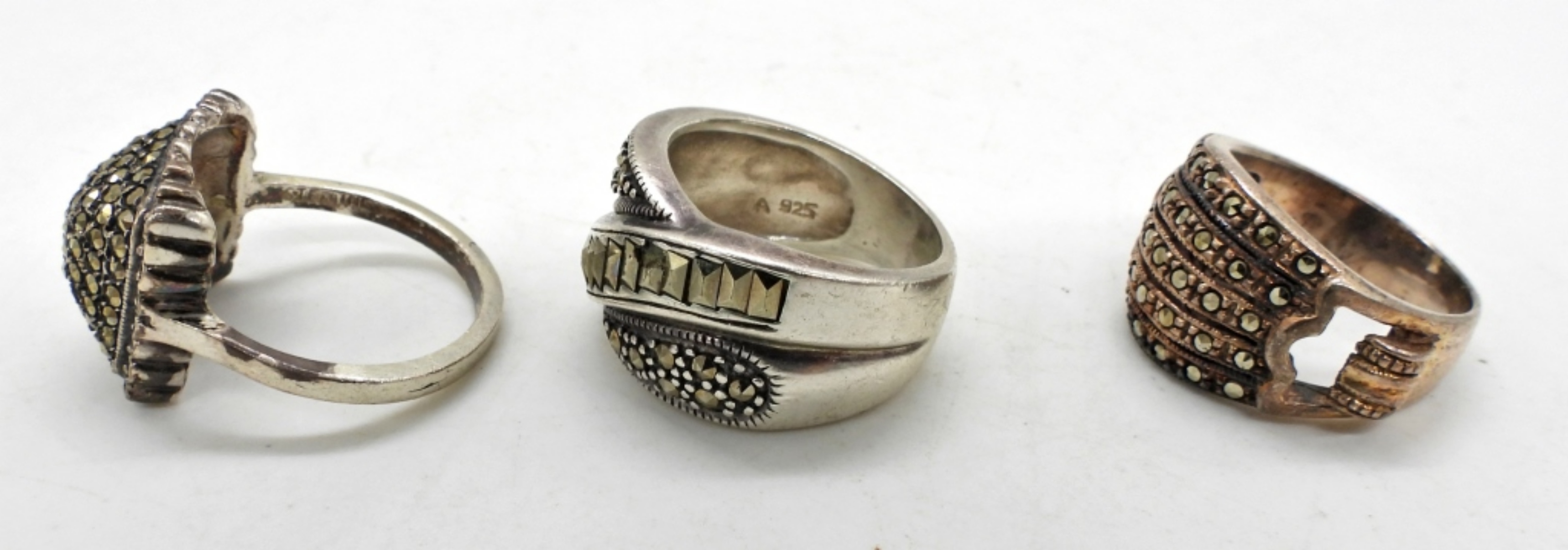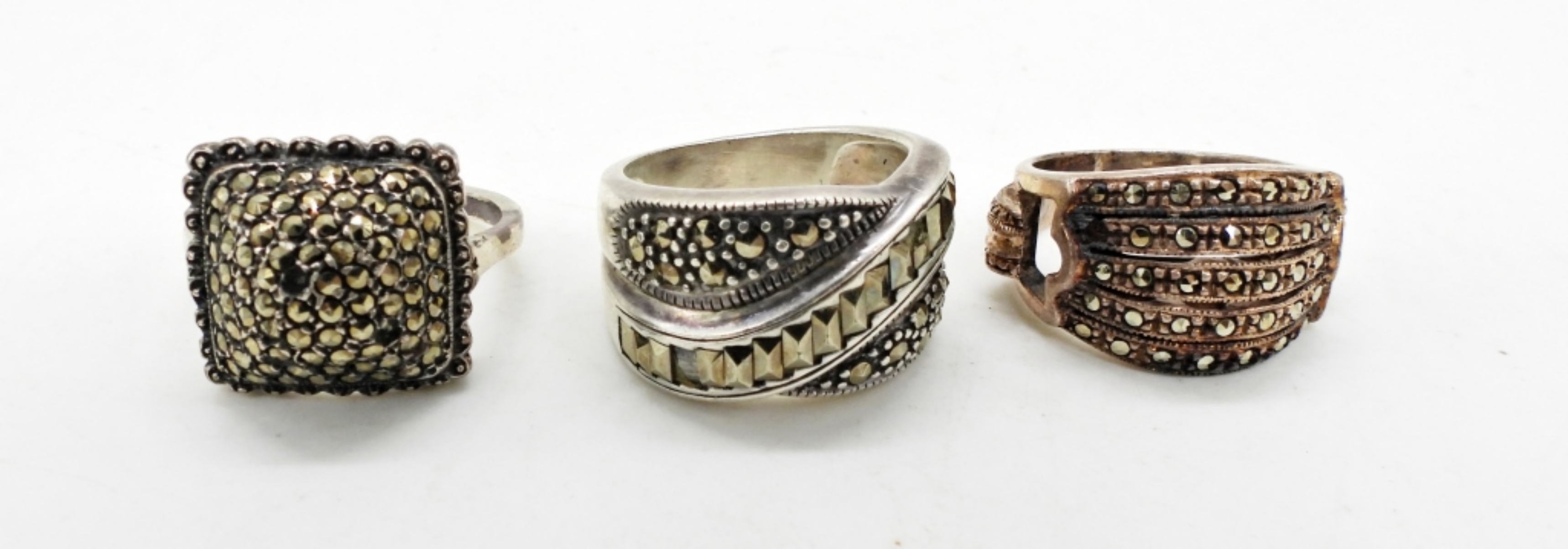 3 STERLING RINGS WITH MARCASITE GEMSTONES. SIZES 5, 6, 7. 12.5 DWT