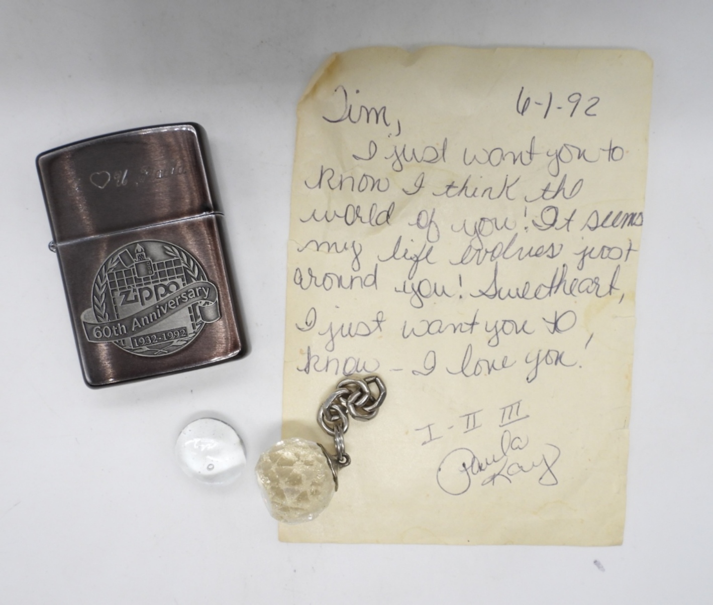 FIRED, IN ITS ORIGINAL TIN BOX, ENGRAVED ON TOP “I LOVE YOU, PAULA”, EVEN HAS A NOTE WITH LITTE KEEPSAKES