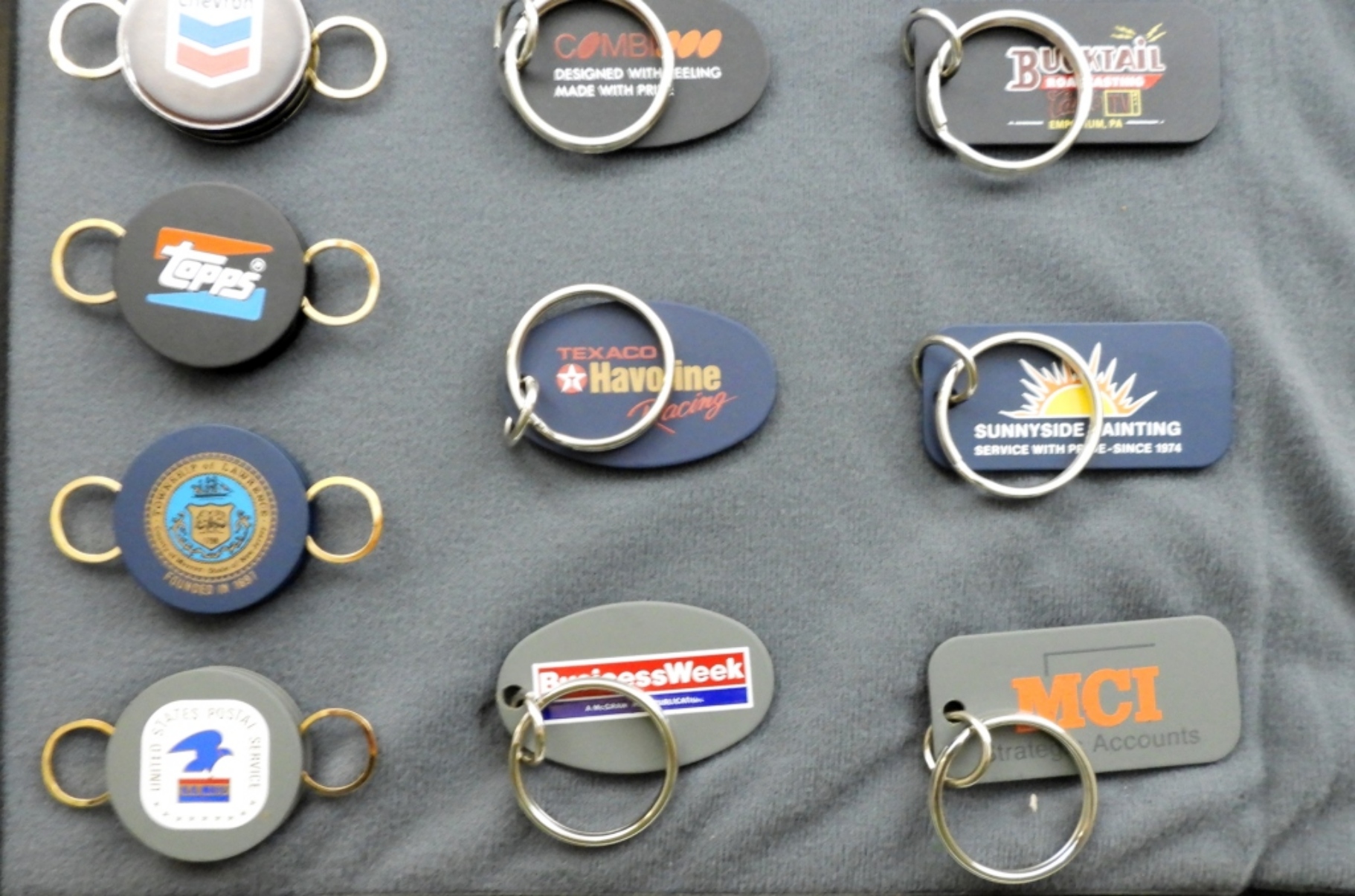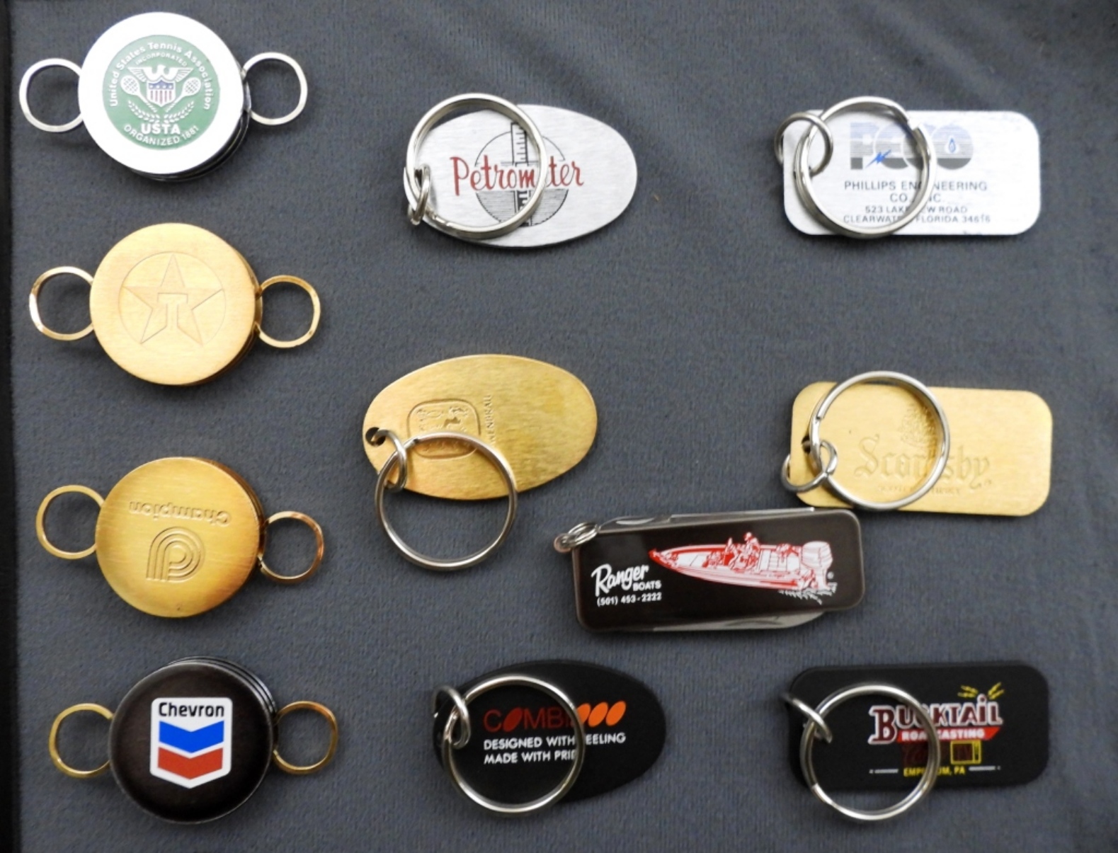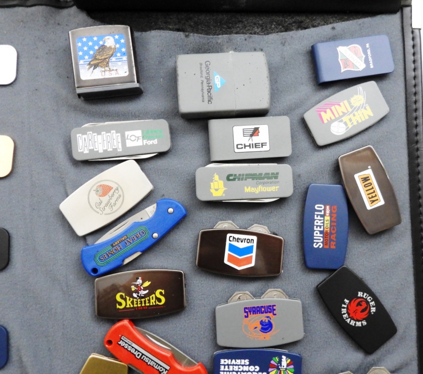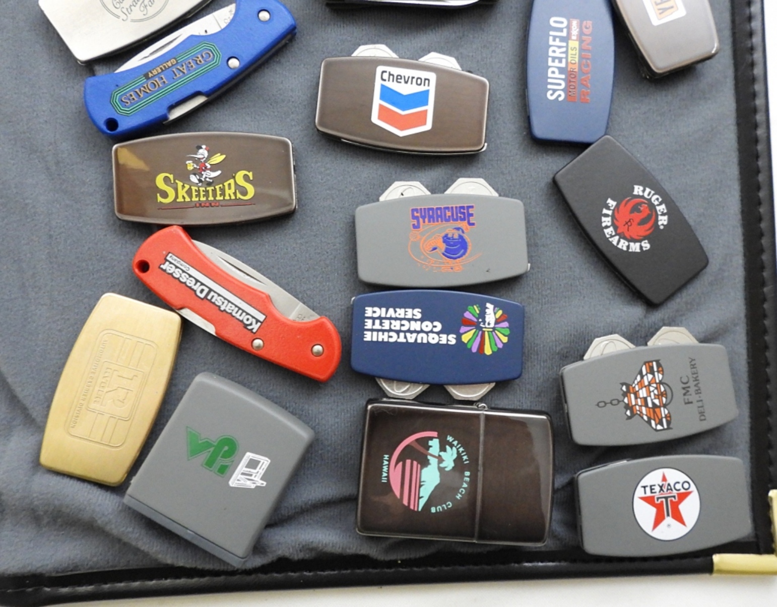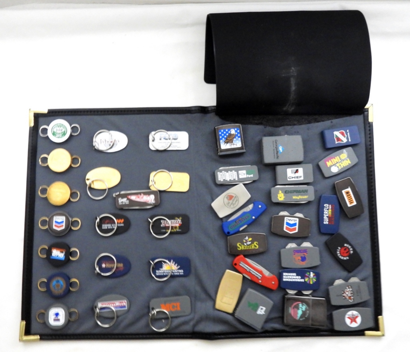 ALL VELCRO TO COLLECTORS DISPLAY BOOK, ALL HAVE DIFFERENT ADVERTISING, KEYCHAINS, KEYRINGS, POCKET KNIVES, MEASURING TAPES, GREENKEEPER TOOLS, MONEY CLIPS, UNFIRED ZIPPO LIGHTERS, ZIPPO BOOKS STARTING TO COME