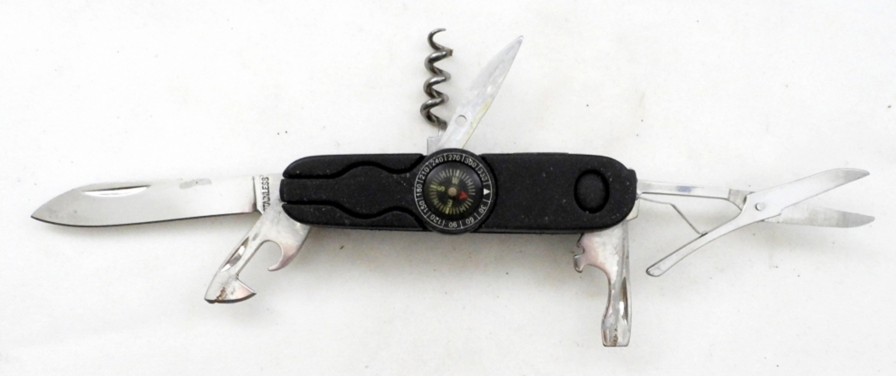 MULTI-TOOL FOLDING POCKET KNIVES WITH COMPASS, ADVERTISING, ALL USED CONDITION