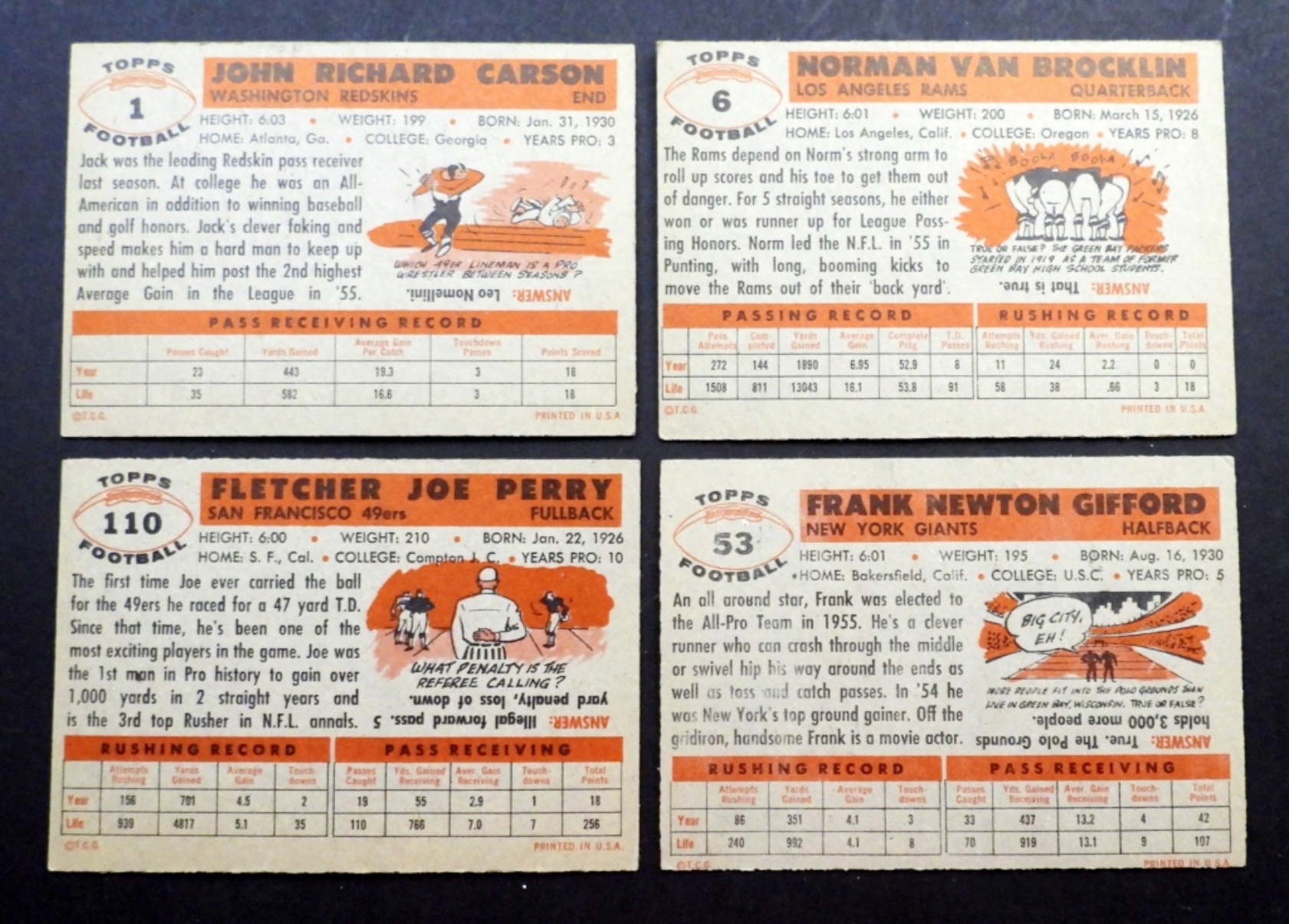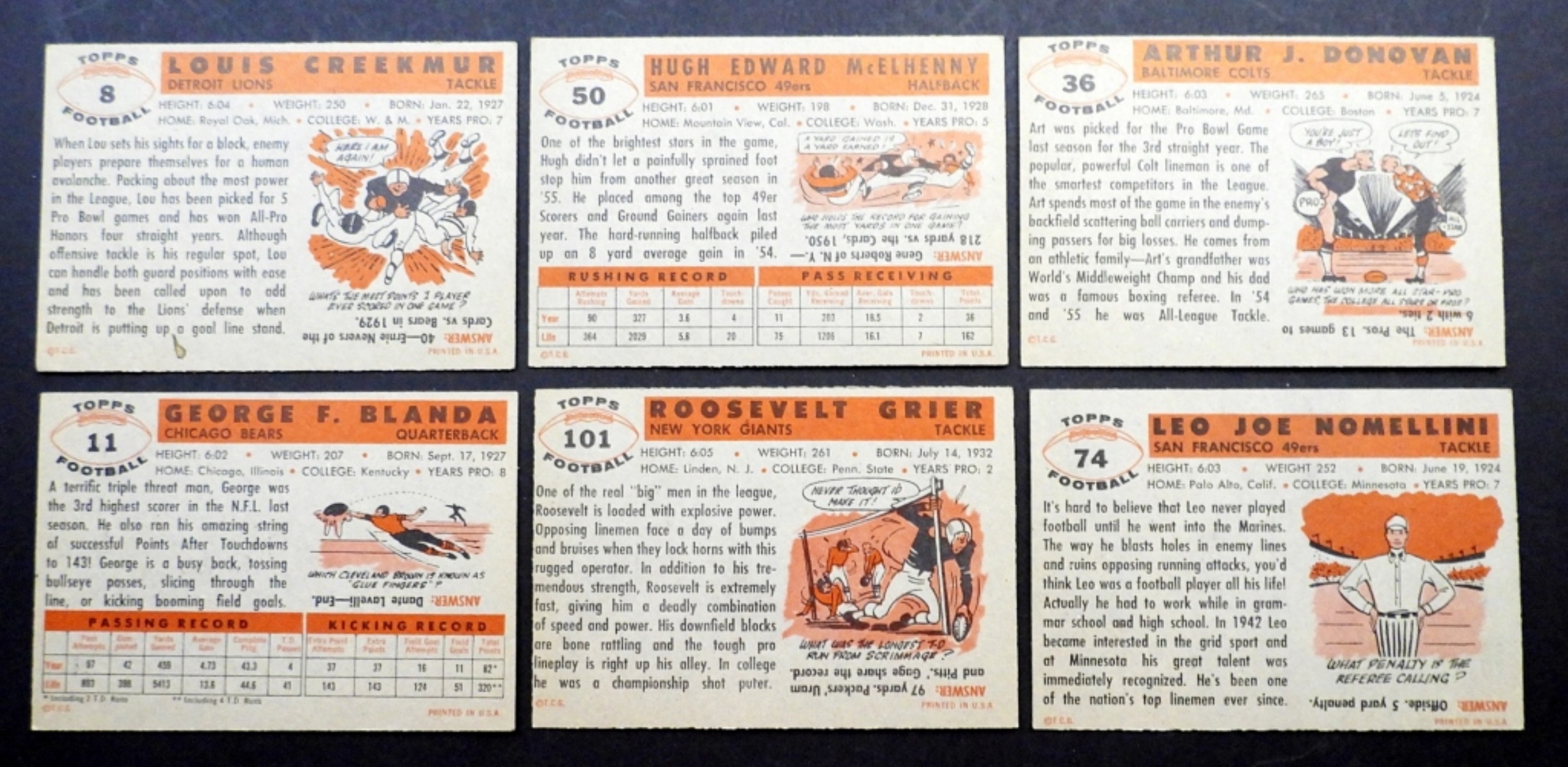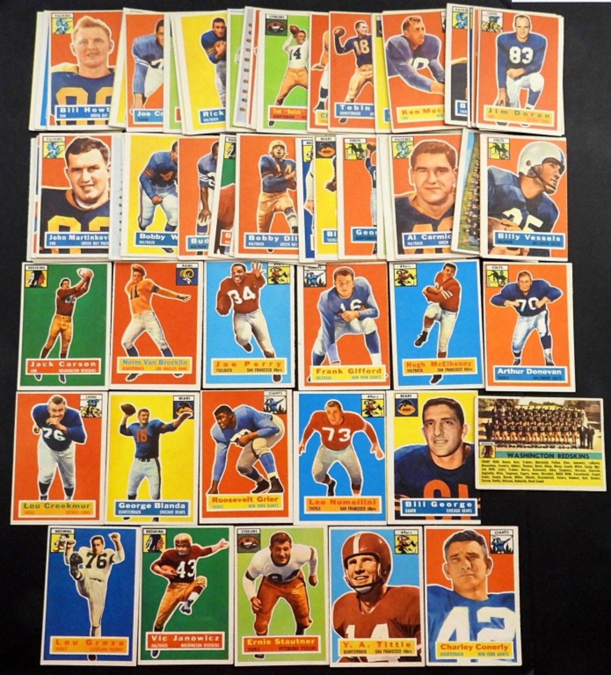 NICE OVERALL EX – EX+ with GREAT COLOR includes #1 SP, #6 Van BROCKLIN, #8, #9 GROZA, #11 BLANDA, #13, #36 DONOVAN, #47 ROOKIE, #50 McELHENRY, #53 GIFFORD, #61 T/C, #74, #77, #86 TITTLE, #87, #101 GRIER ROOKIE,