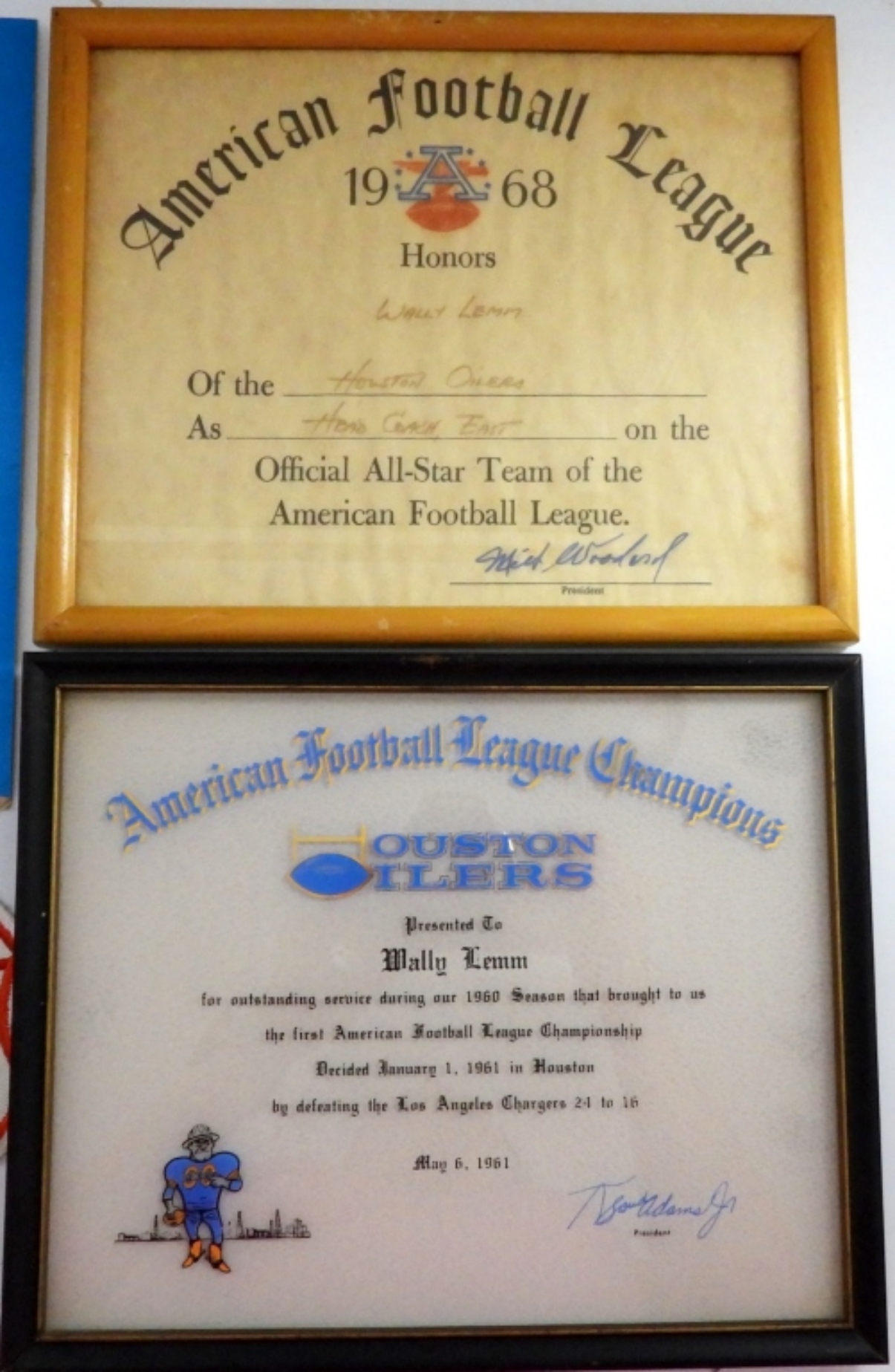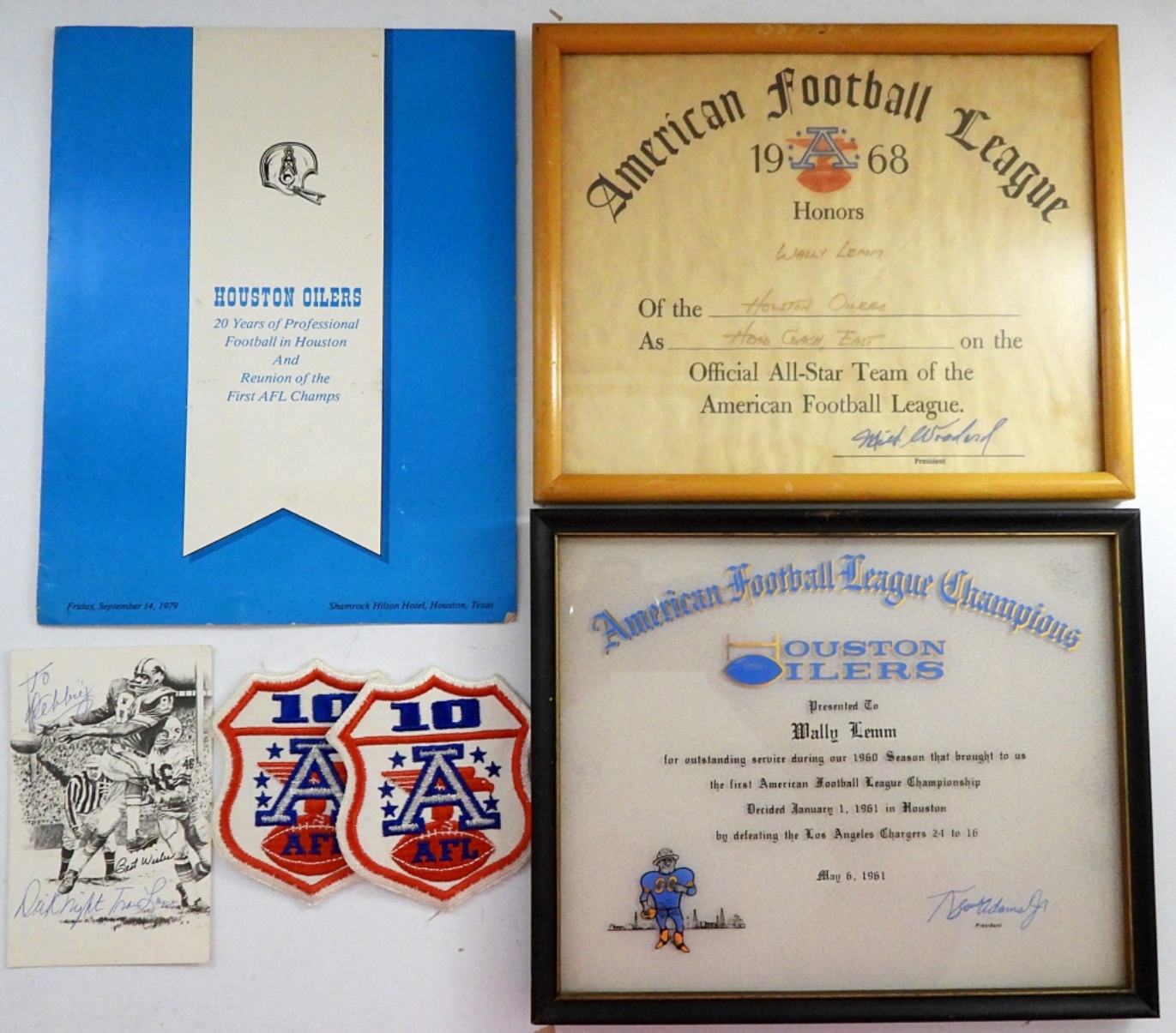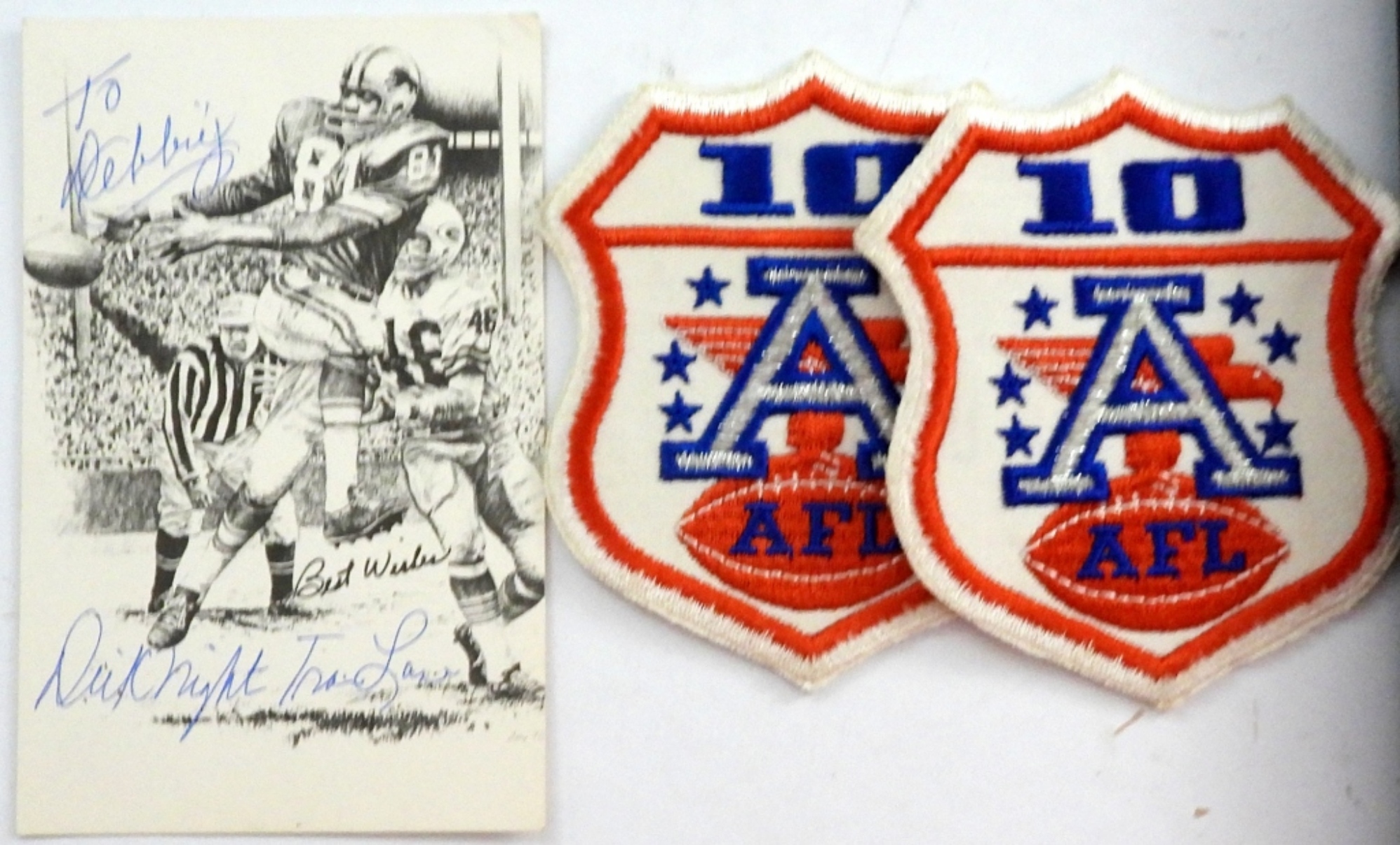 1961 & 1969 OFFICIAL FRAMED CERTIFICATIONS, (2) AFL PATCHES & AUTO DICK LANE POSTCARD “TO DEBBIE”