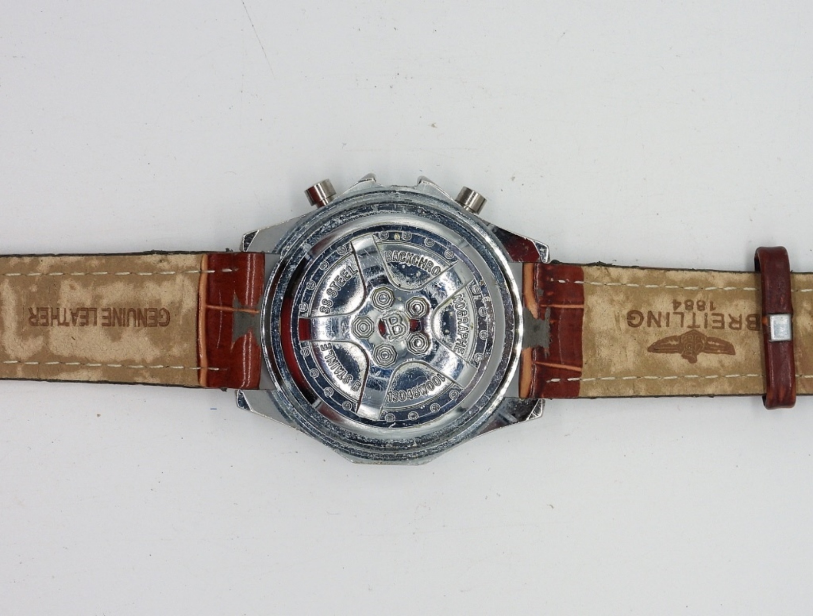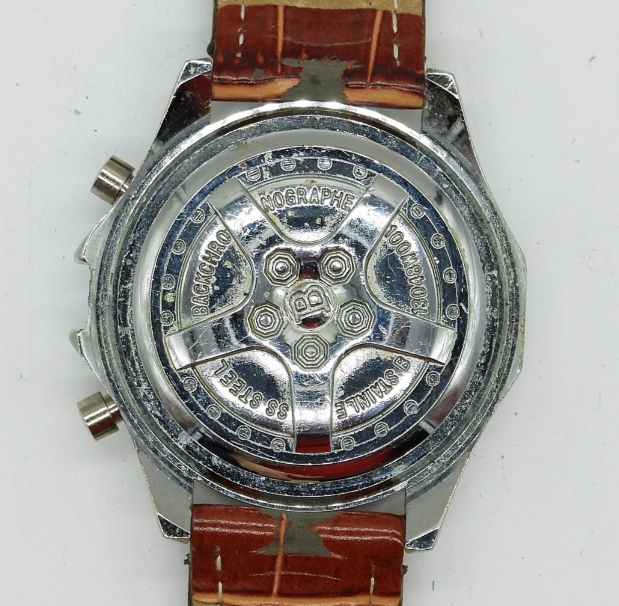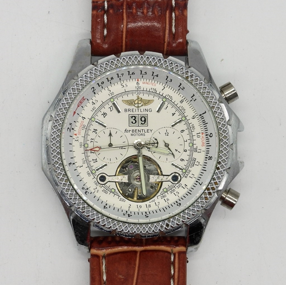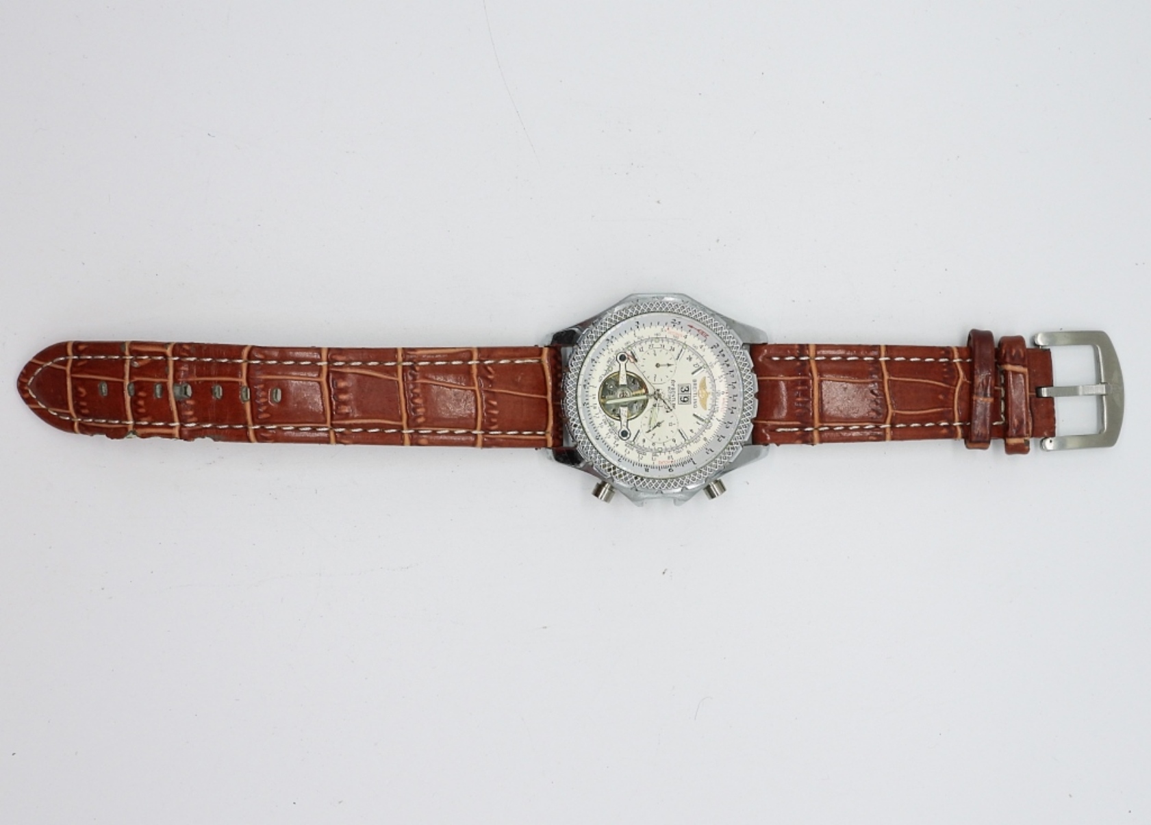 BREITLING LARGE MEN’S WATCH WITH A BROWN LEATHER BAND. BAND IS 1″ WIDE, FACE IS 2″x2″. AUTHENTICITY HAS NOT BEEN CONFIRMED. IT IS LIKELY A FAKE. (NOT TESTED AS TO WORKING OR NOT)