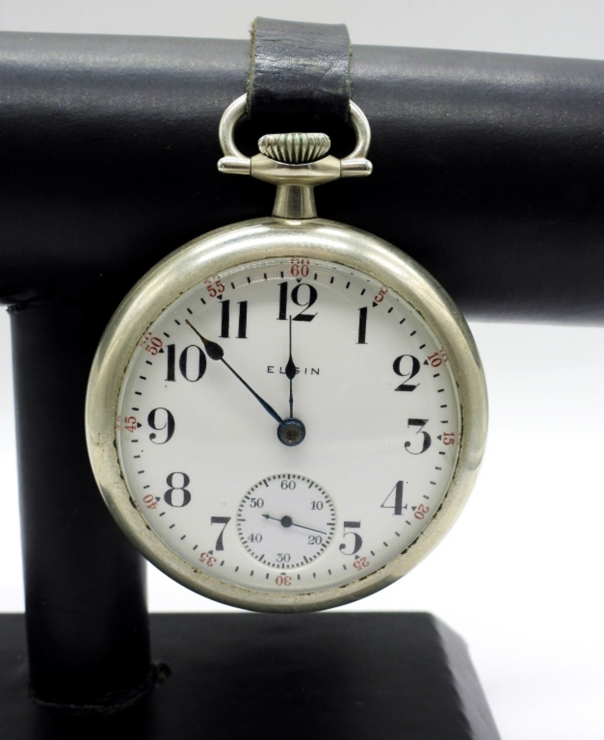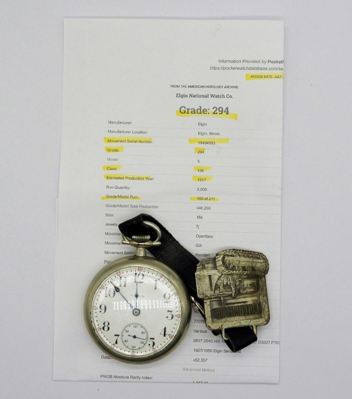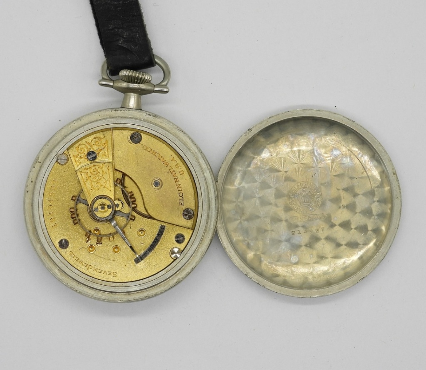 VINTAGE 1917 ELGIN NATL WATCH CO. LEATHER “CATERPILLAR” STRAP ATTACHED. SERIAL # 19494553, MODEL 5, CLASS 106, GRADE/MODEL RUN 169/211, GRADE 294. IN GREAT PHYSICAL CONDITION! (NOT TESTED AS TO WORKING OR NOT)