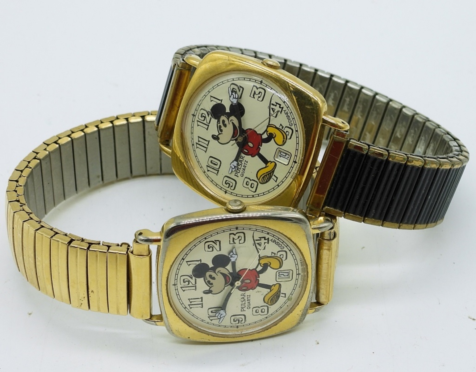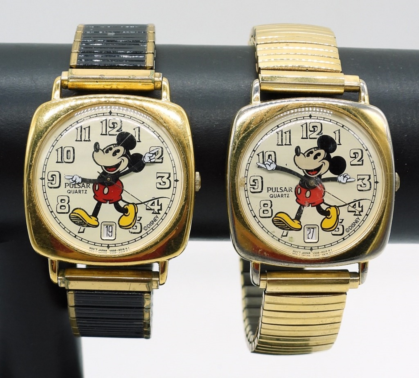 GOLD TONE MICKEY PULSAR WATCH SERIAL # 180987. GOLD AND BLACK TONE MICKEY PULSAR WATCH SERIAL # 184049 (NOT TESTED AS TO WORKING OR NOT)