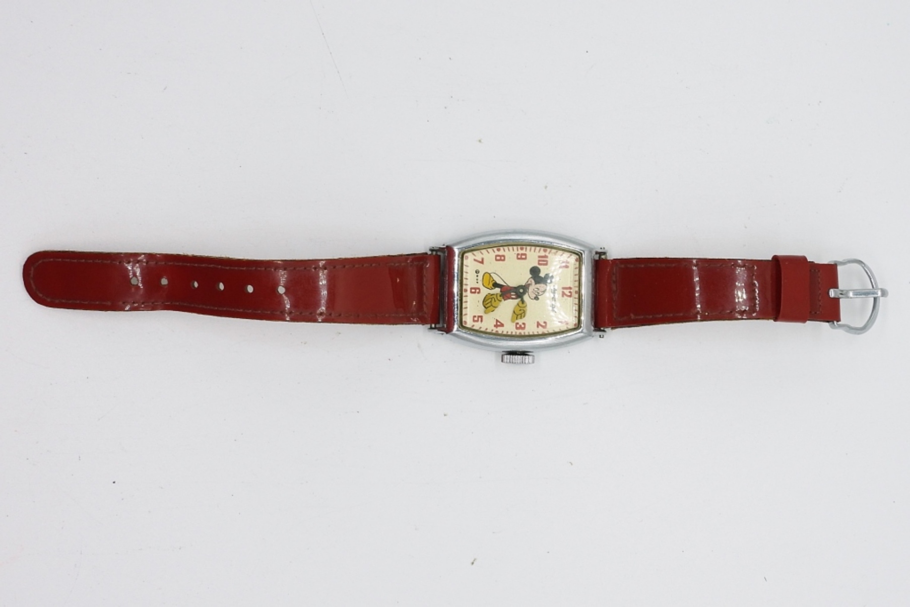 INGERSOL 1930s MICKEY MOUSE VINTAGE WATCH, RED PATTON LEATHER BAND. VERY GOOD CONDITION! TICKS WHEN WOUND UP, DON’T KNOW IF IT KEEPS TIME. 8842 # ON THE BACK. (NOT TESTED AS TO WORKING OR NOT)