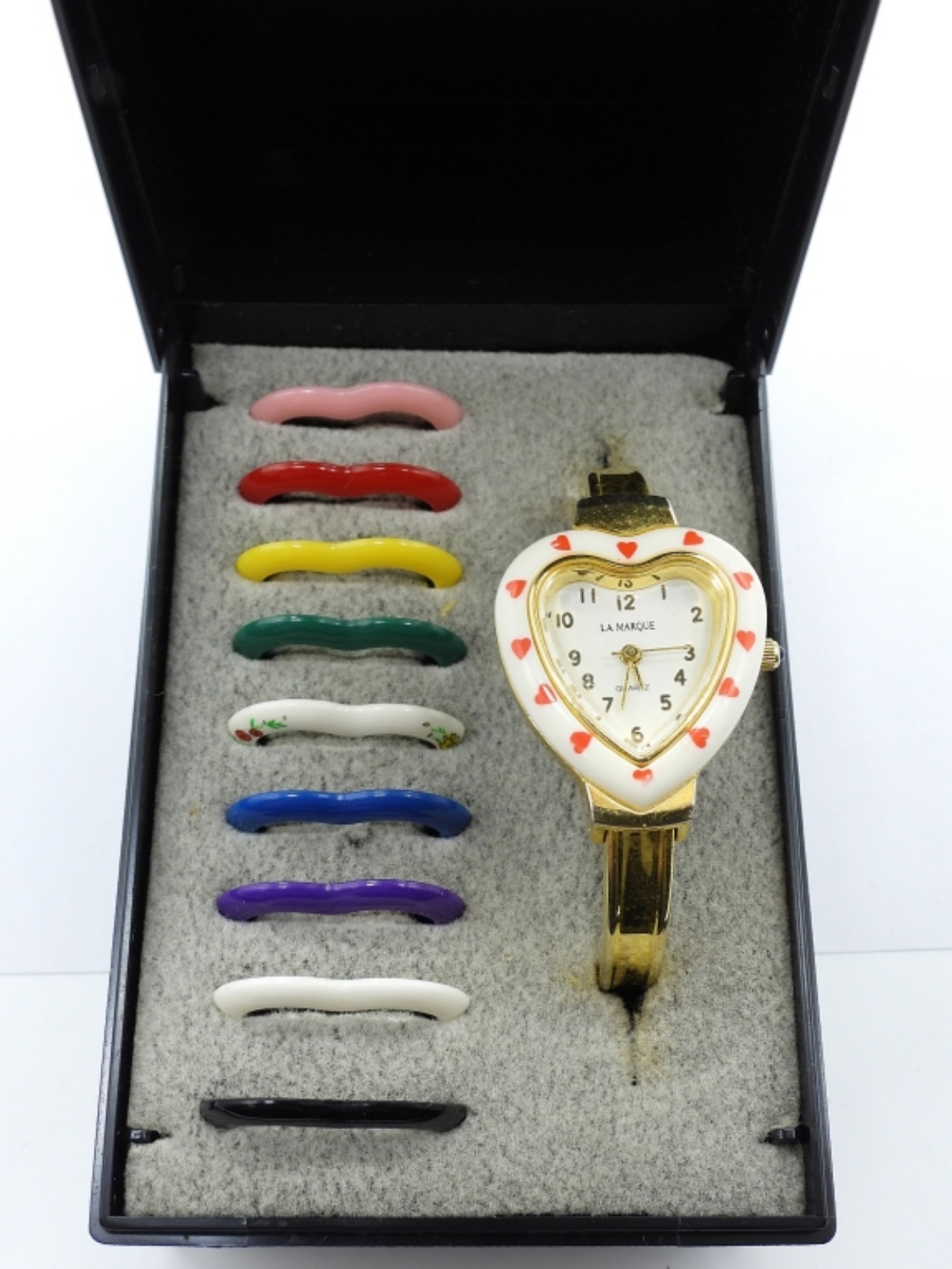 LA MARQUE QUARTZ LADIES WATCH, WITH INTER CHANGEABLE BEZELS. ORIGINAL CASE, GOLD TONE BAND. (NOT TESTED AS TO WORKING OR NOT)