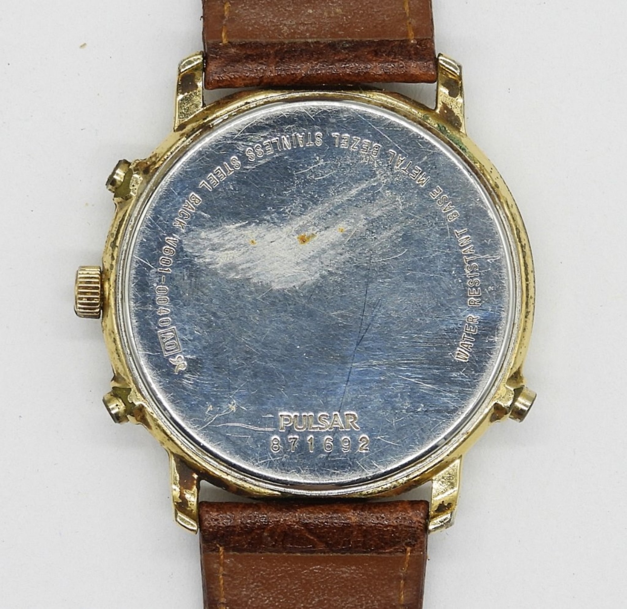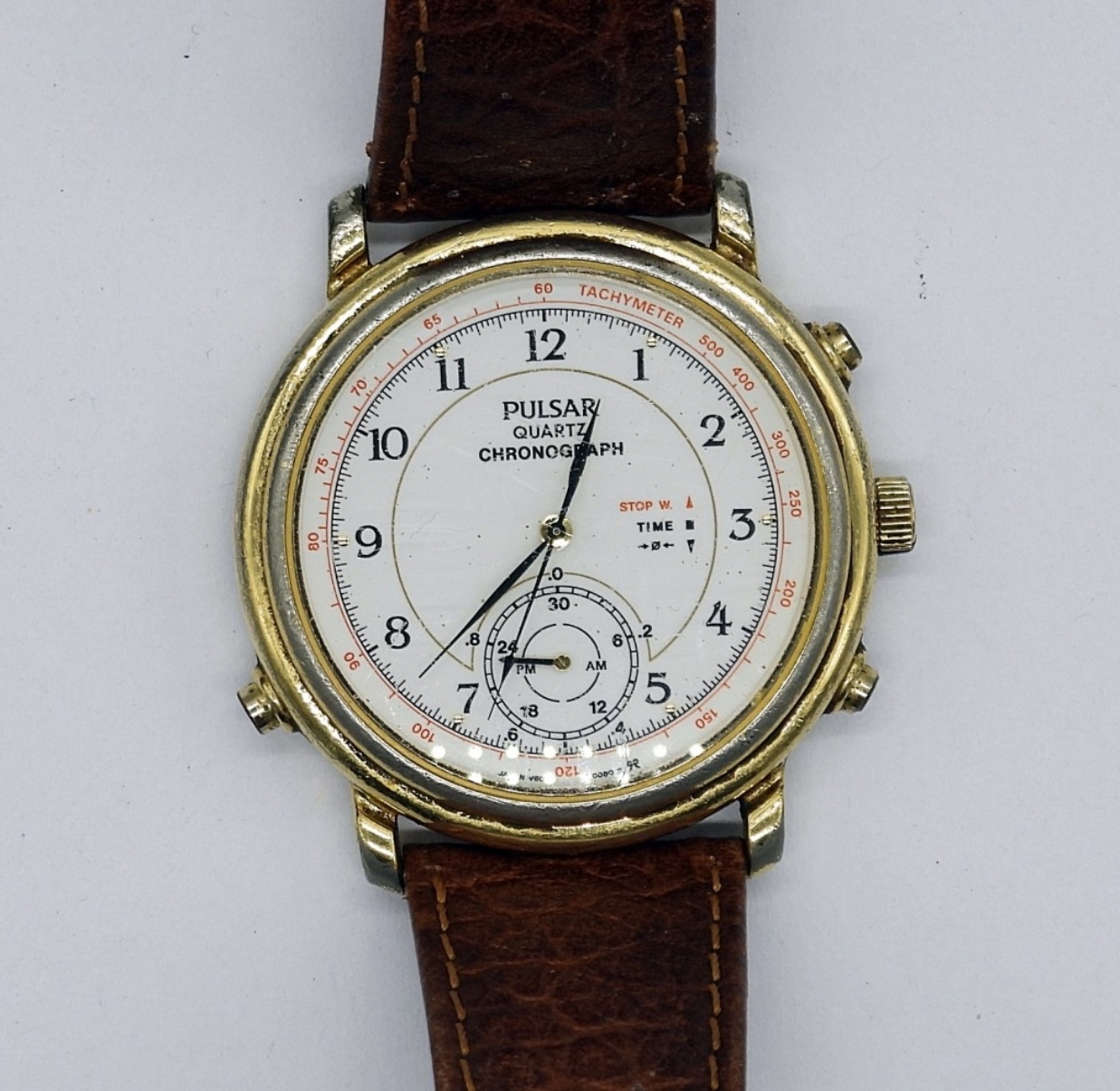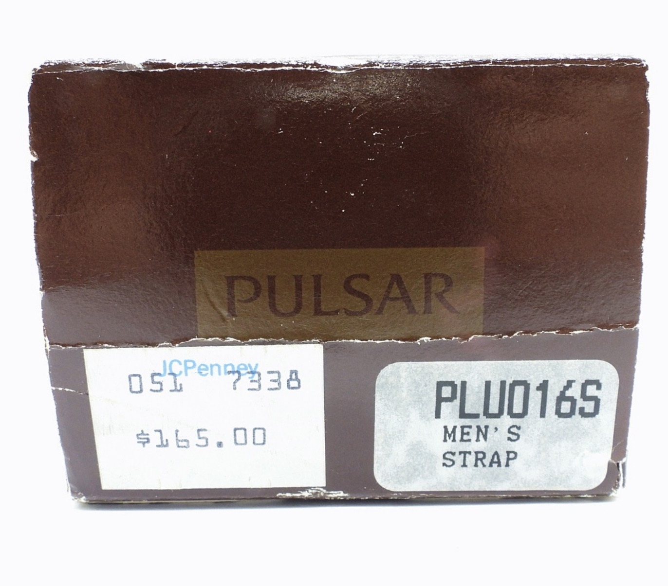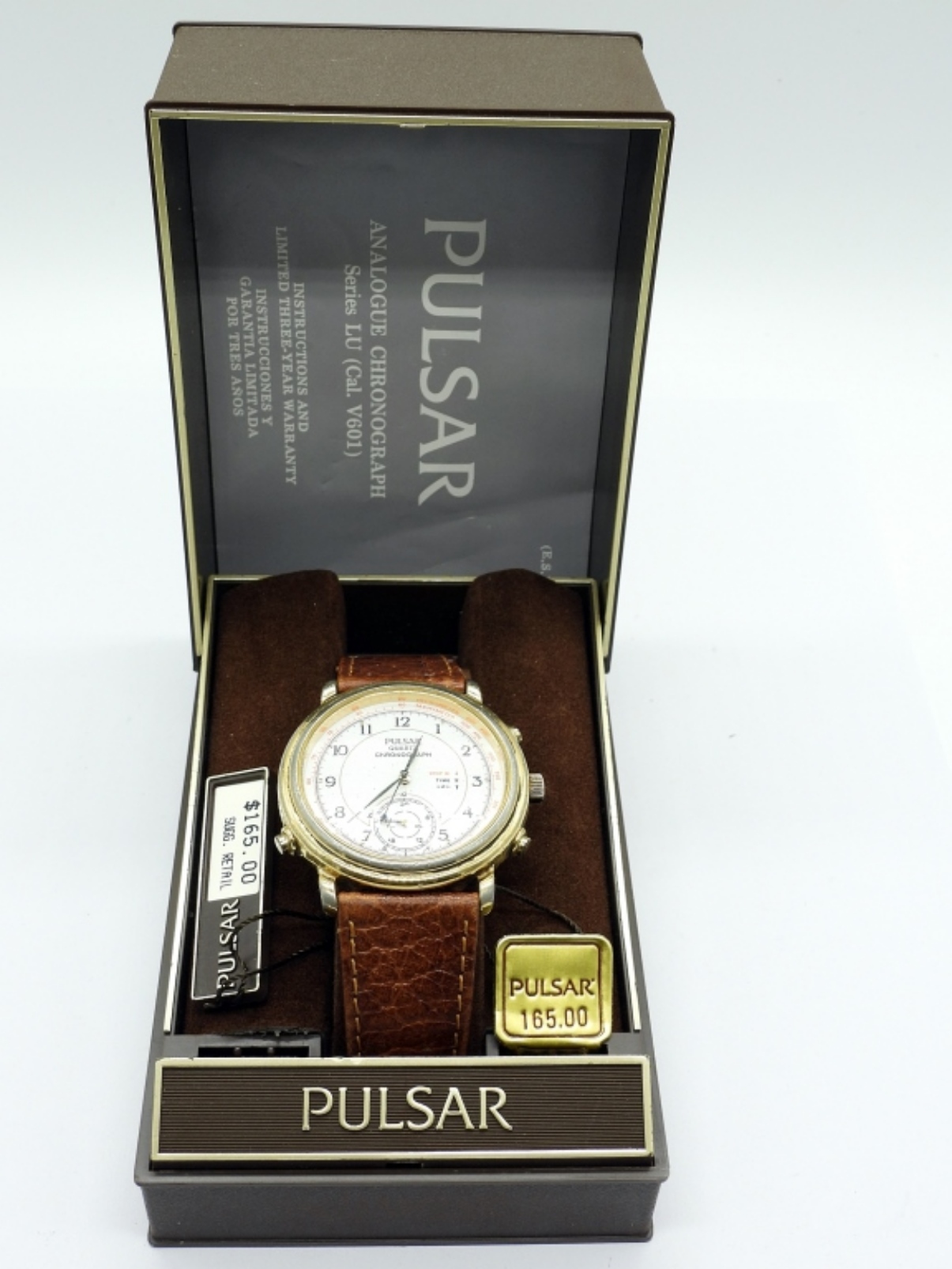 PULSAR ANALOGUE CHRONOGRAPH MEN’S WATCH, RETAILED FOR $165 AT JCPenney’s. SERIAL #871692. ORIGINAL BOX, PRICE TAG & PAPERWORK. (NOT TESTED AS TO WORKING OR NOT)