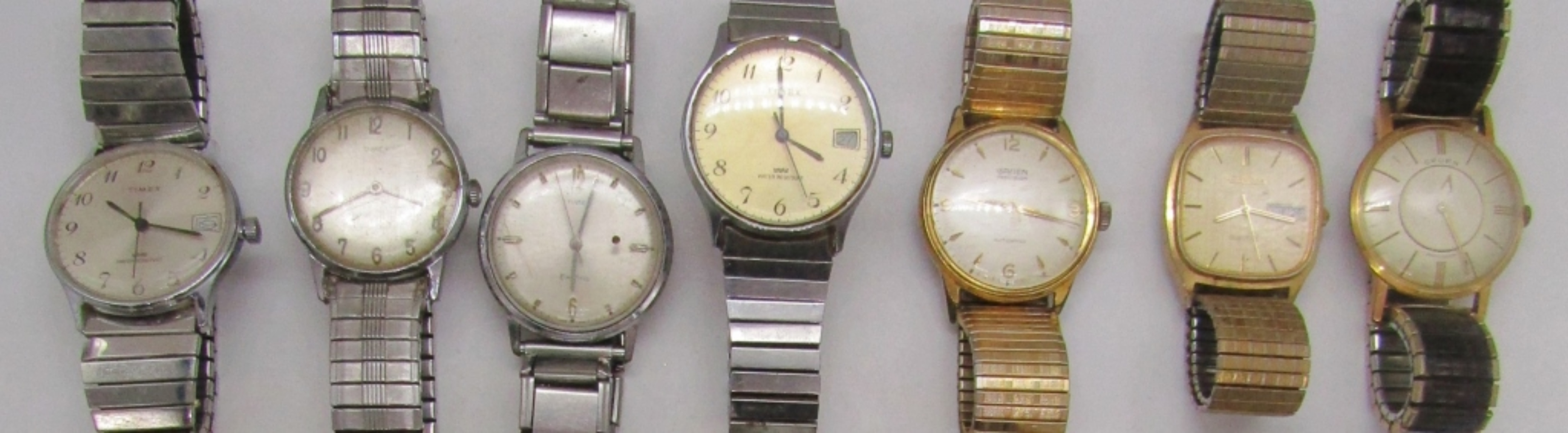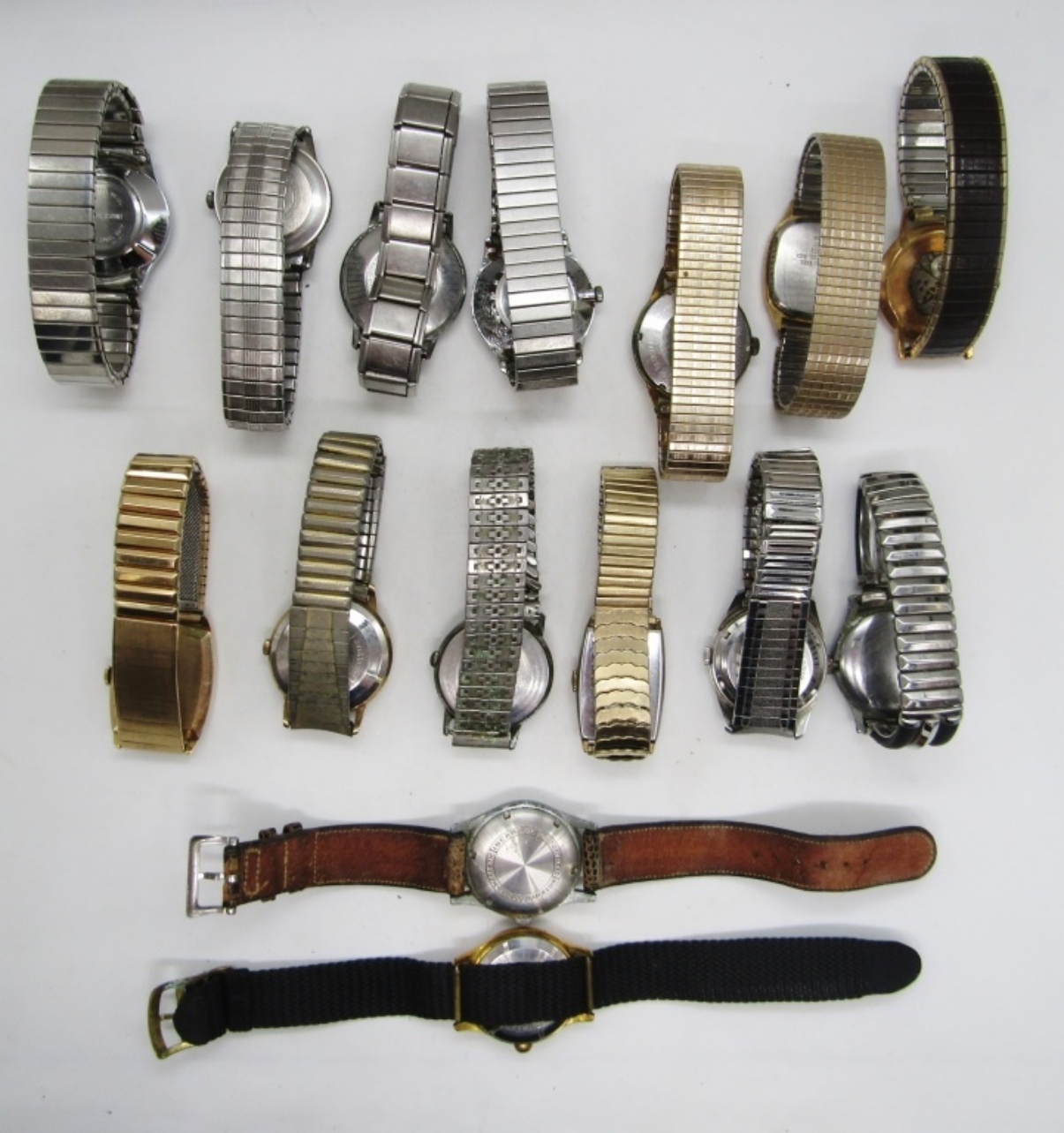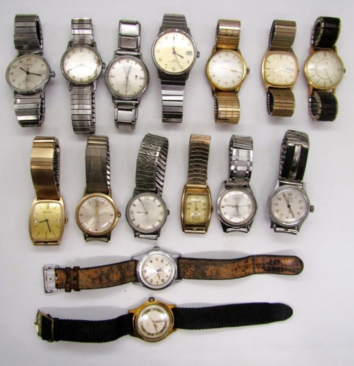 12 STRETCHY, 2 CLAPS WATCHES, UNTESTED, TIMEX,QUARTZ, GRUEN, BULOVA AND MORE