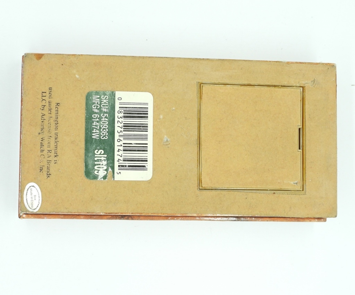 REMINGTON WATER RESISTANT QUARTZ WATCH, CALENDAR, NIGHT LIGHT. BRAND NEW IN ORIGINAL BOX. STILL ATTACHED TO THE BOX WITH ZIP TIES, NEVER REMOVED. (NOT TESTED AS TO WORKING OR NOT)