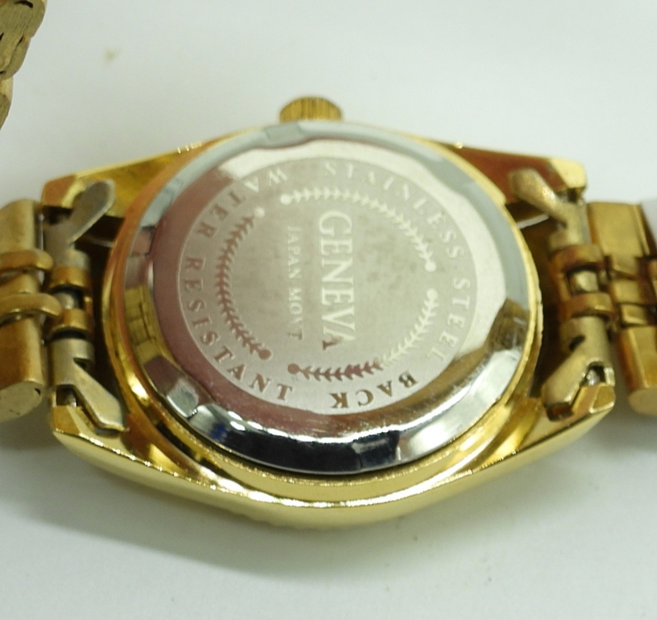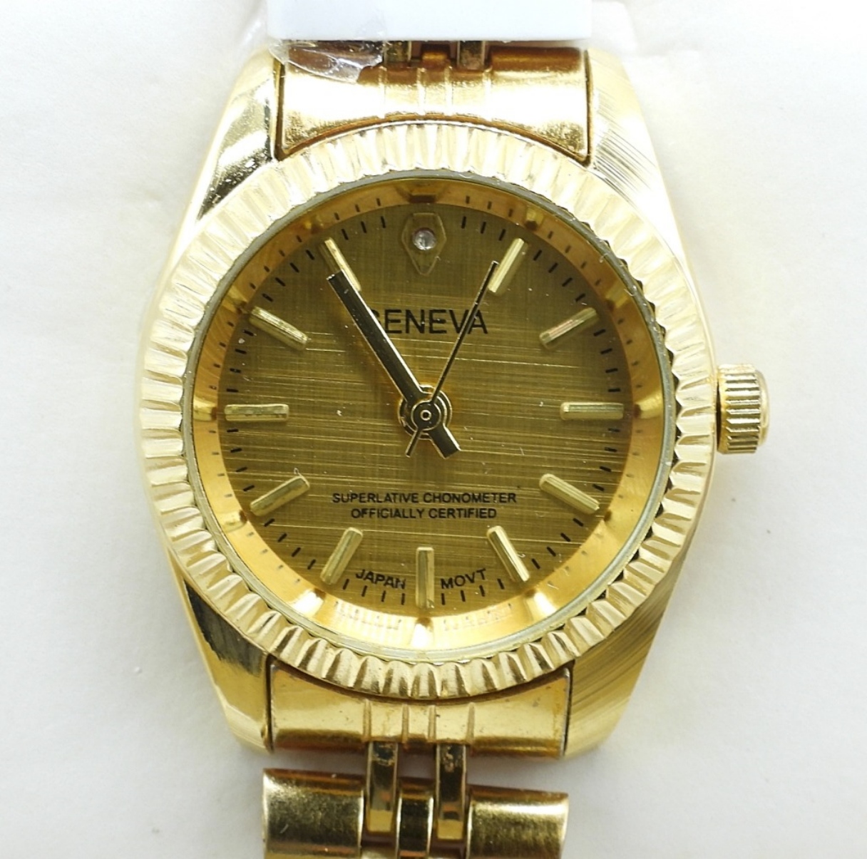 BEAUTIFUL GOLD TONE GENEVA LADIES WATCH, NEW IN BOX. (NOT TESTED AS TO WORKING OR NOT)