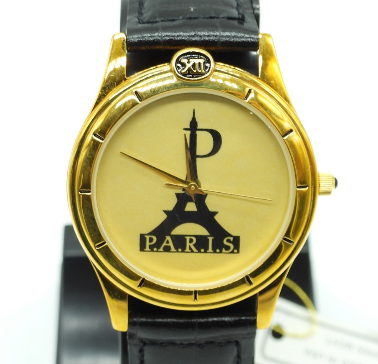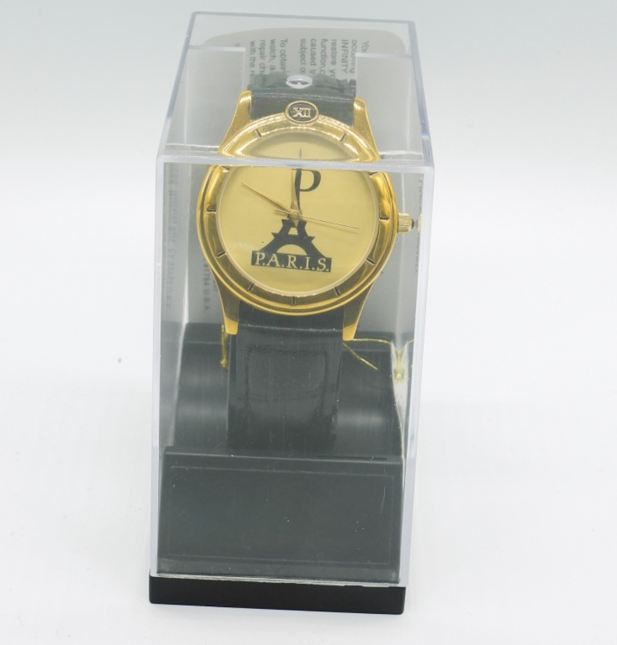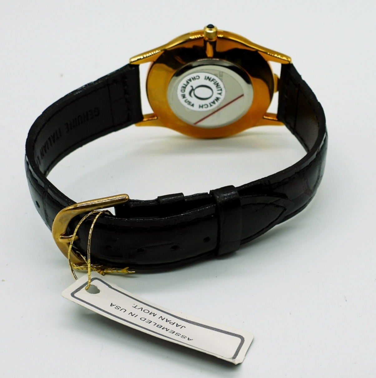 VINTAGE 18kGP LOGO TIMEPIECE BY INFINITY. WATER RESISTANT. NEW IN CASE.(NOT TESTED AS TO WORKING OR NOT)