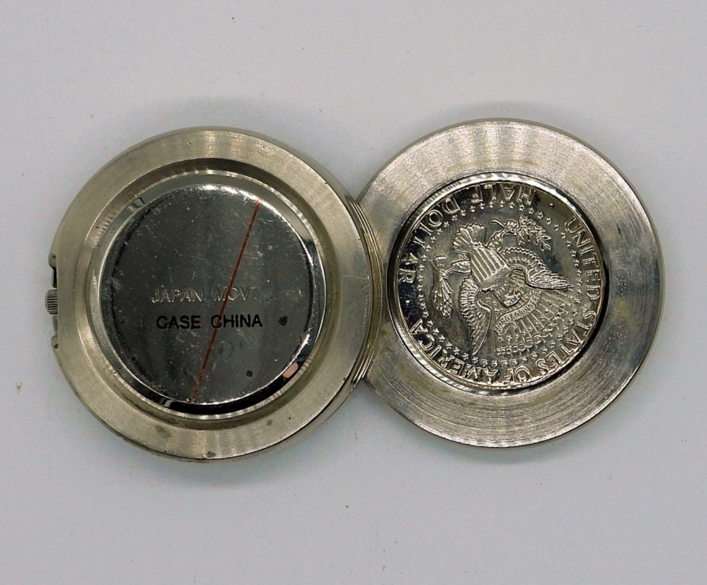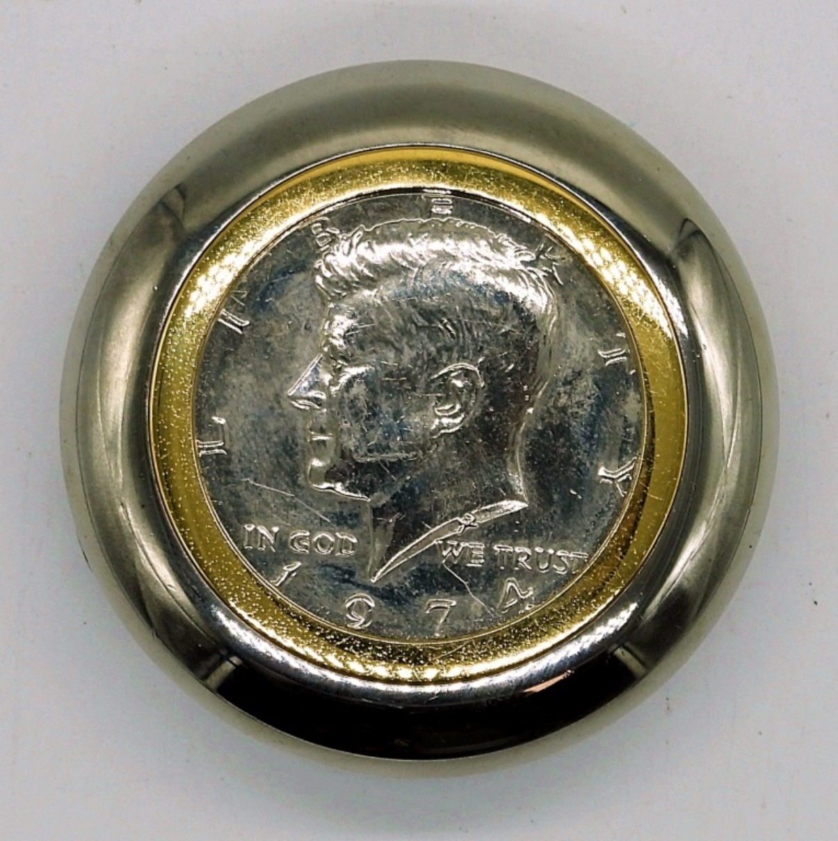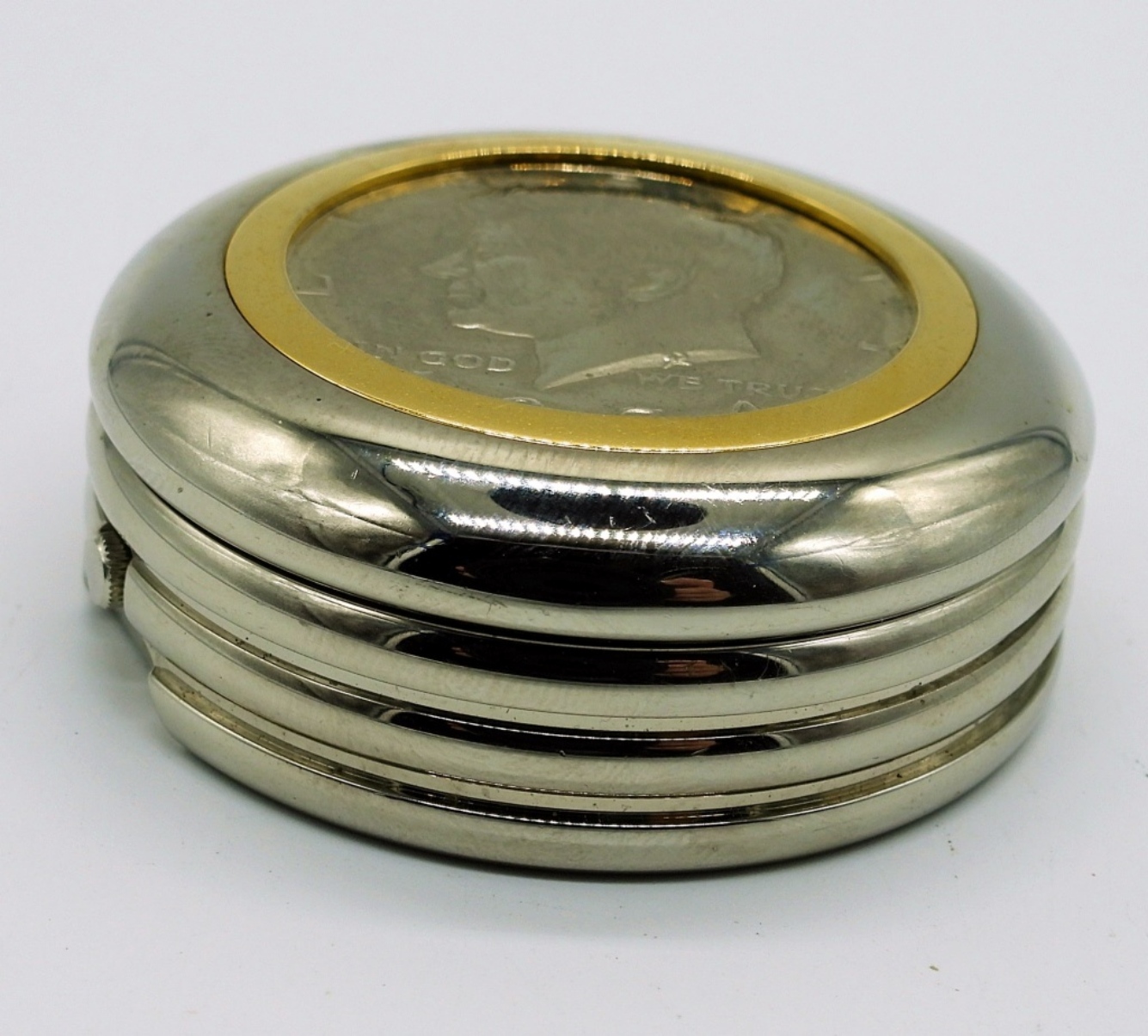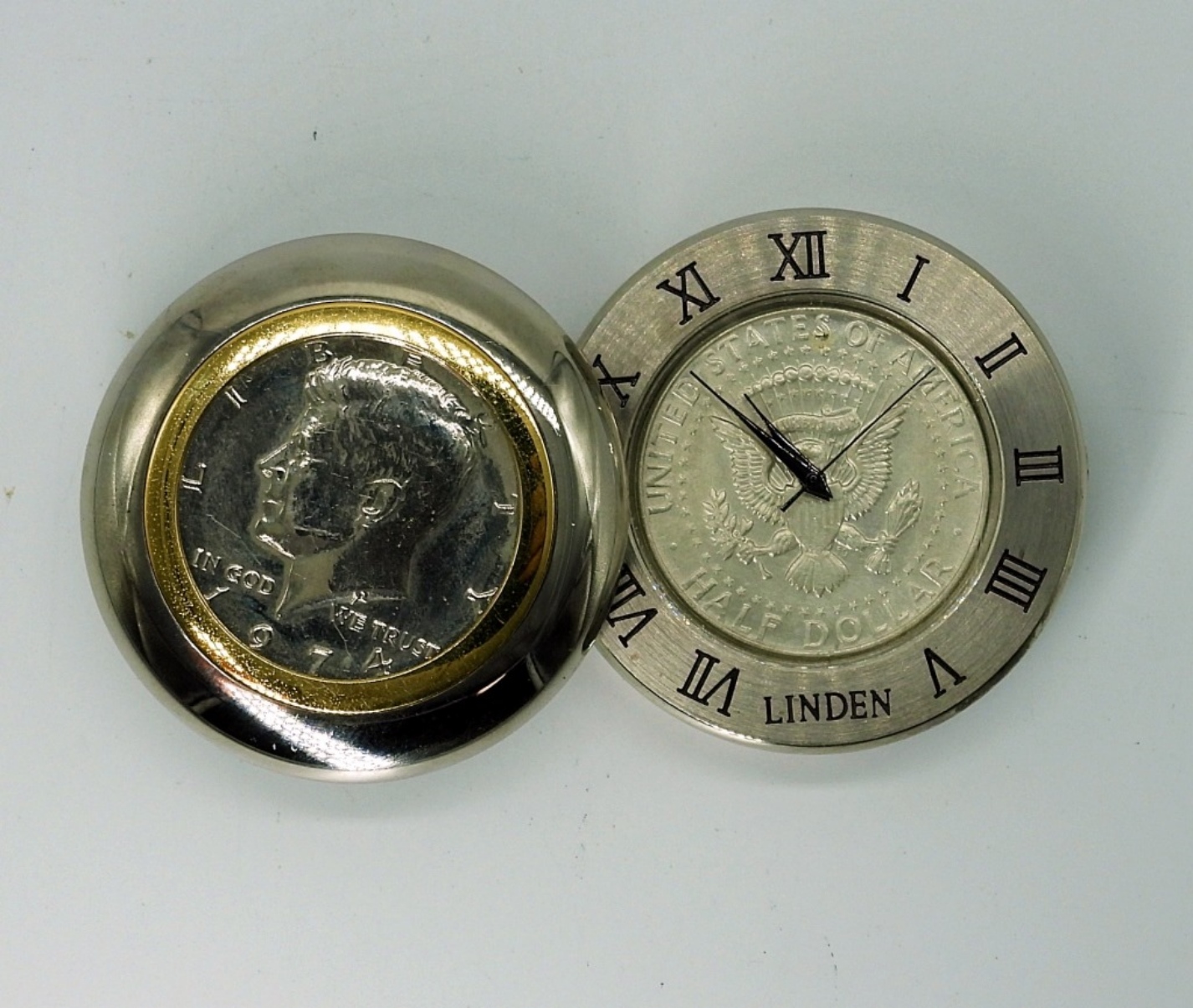 1974 KENNEDY HALF DOLLAR DESKTOP CLOCK. JAPAN MOVEMENT, TOP SLIDES OPEN TO REVEAL CLOCK FACE. 1.75″ TALL, 1.75″ WIDE. (NOT TESTED AS TO WORKING OR NOT)