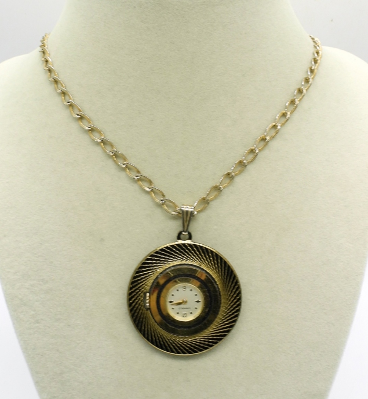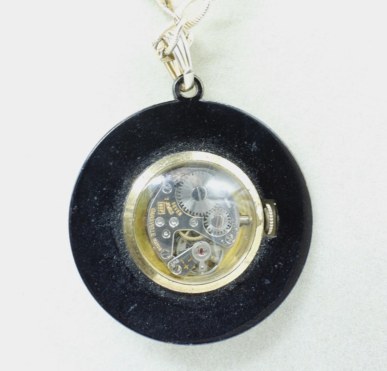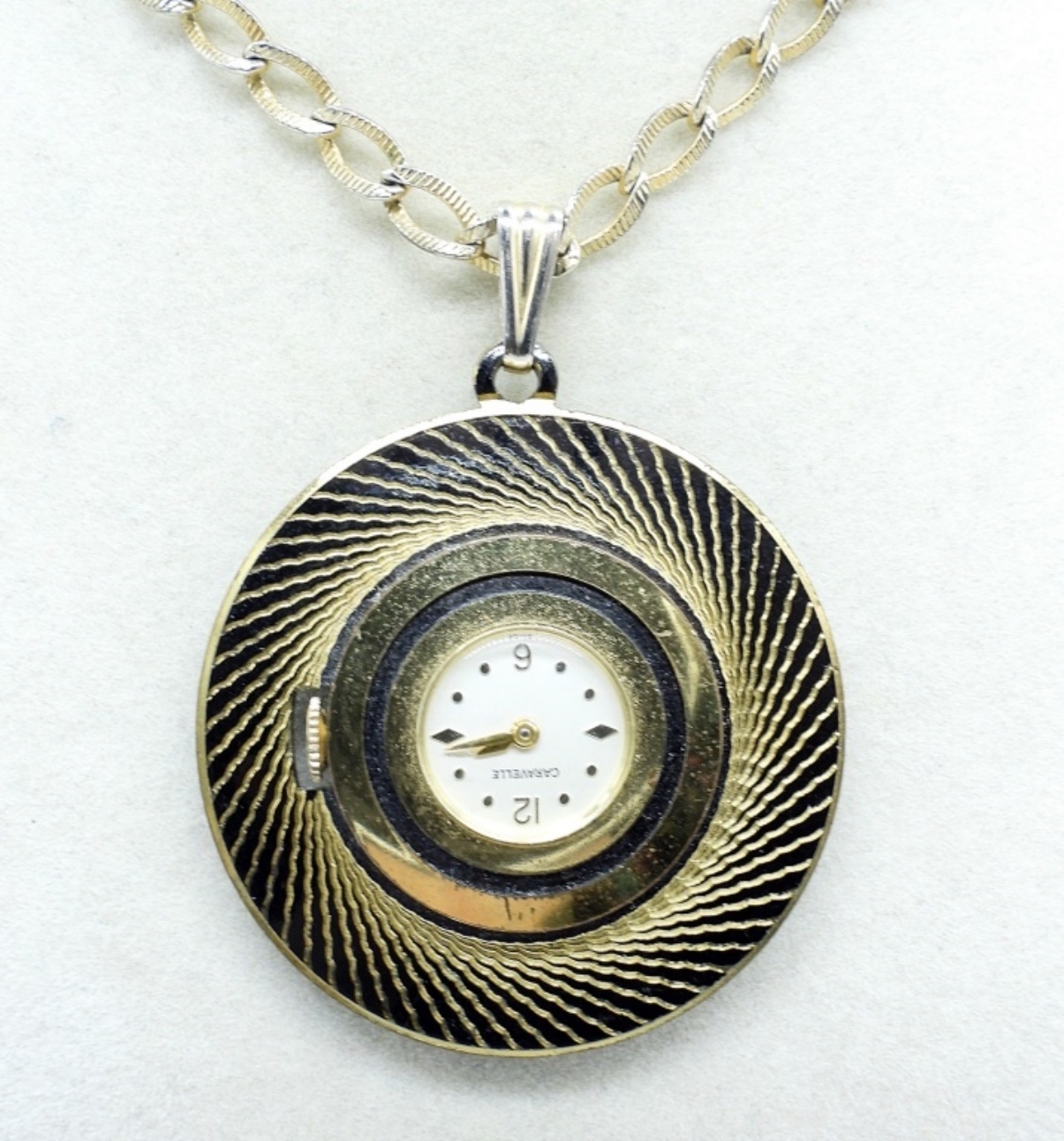 VINTAGE CARAVELLE DISPLAY BACK, LADIES GOLD/BLACK TONE PENDANT WATCH NECKLACE. MANUAL WIND, ON A GOLD TONE CHAIN. RUNS AND IS IN GOOD SHAPE. DO NOT KNOW HOW WELL IT KEEPS TIME. (NOT TESTED AS TO WORKING OR