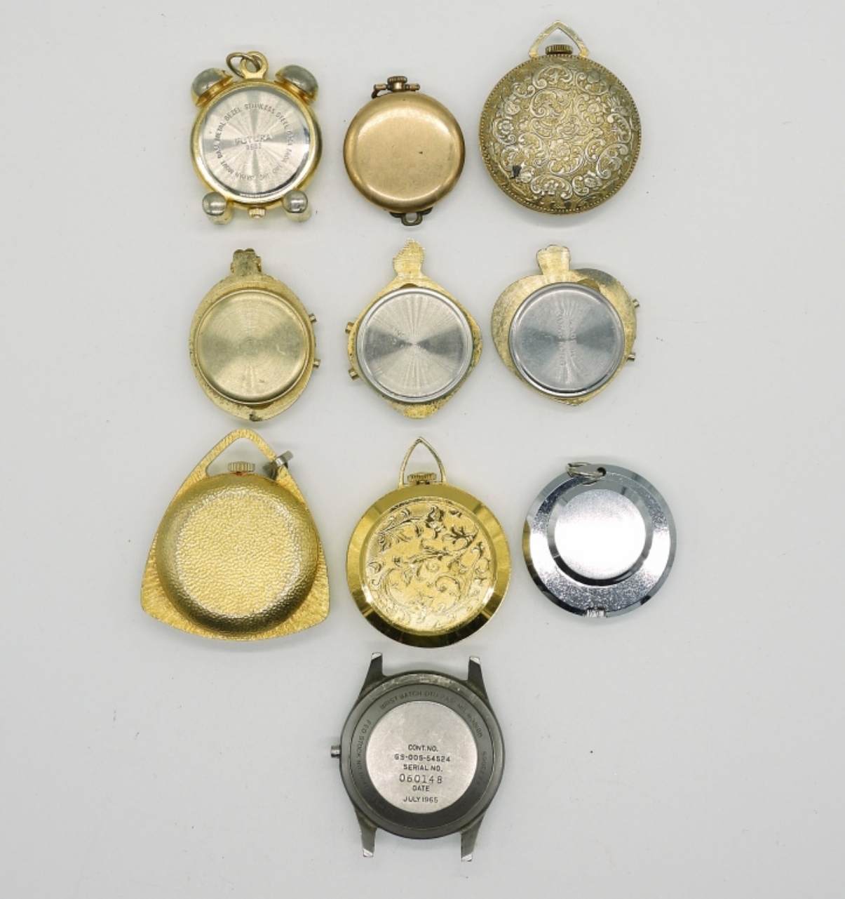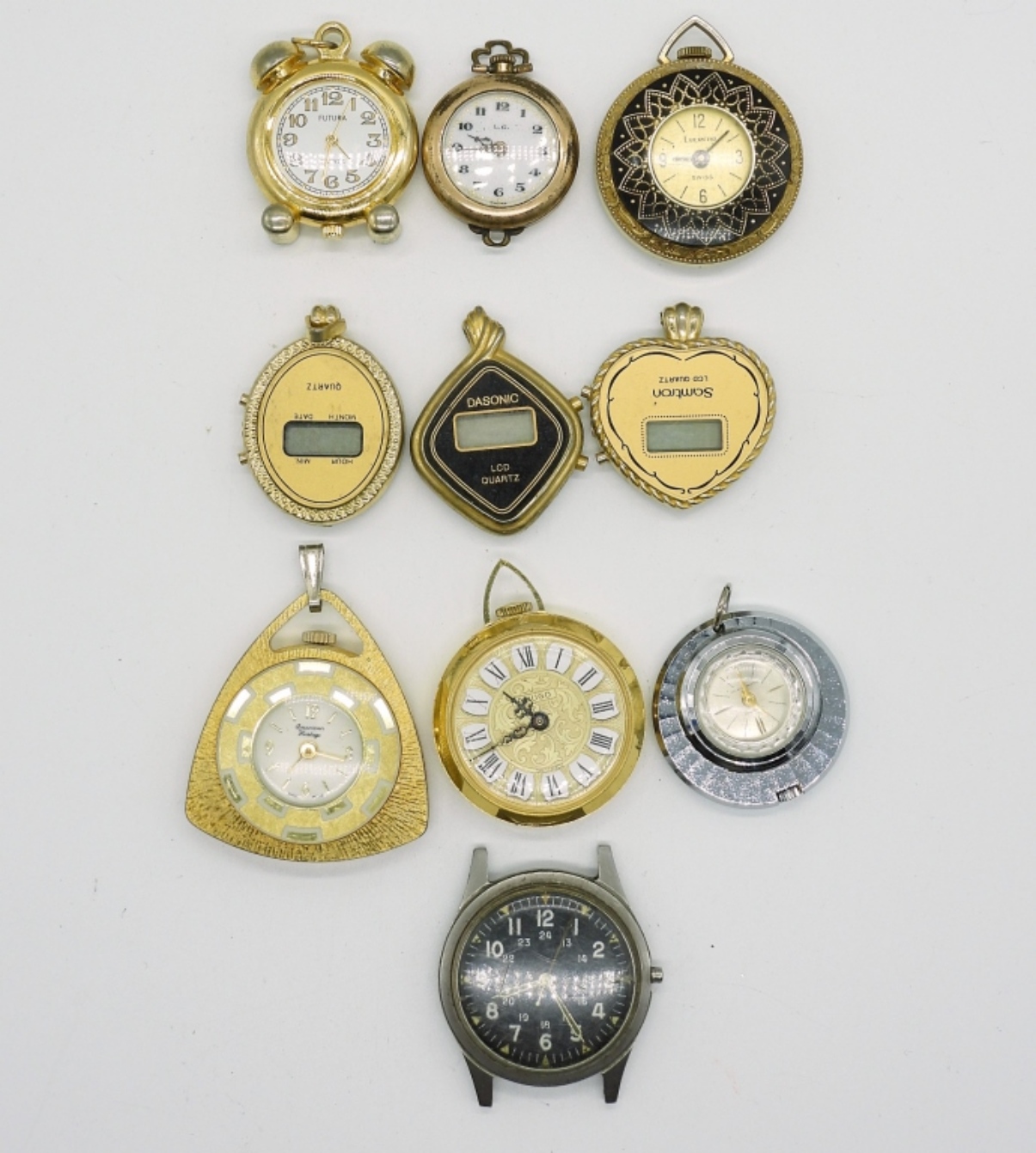 10 GOLD AND SILVER TONE WATCH PENDANTS, NO CHAINS. SEE PHOTOS (NOT TESTED AS TO WORKING OR NOT)