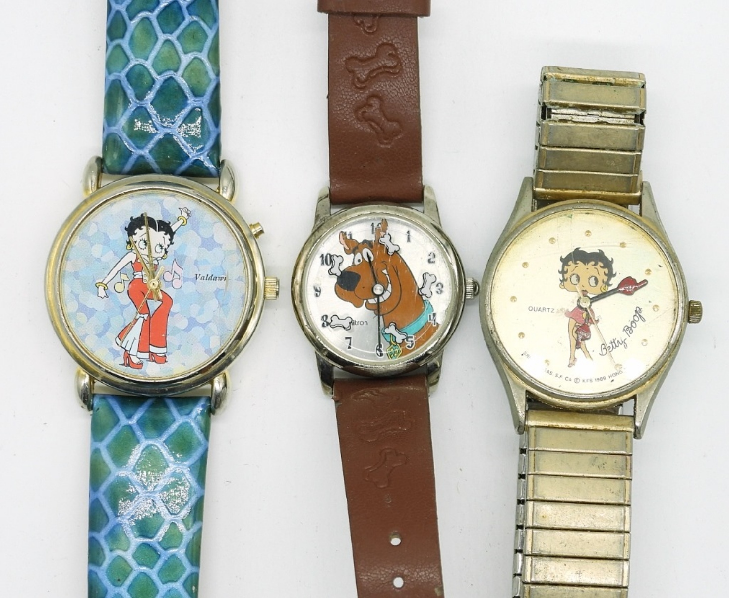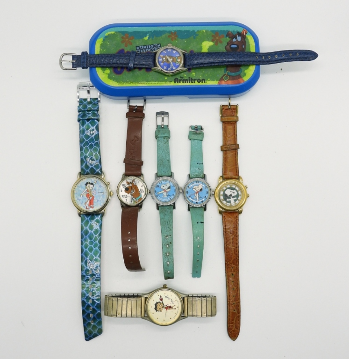 3 SNOOPY WATCHES, 2 BETTY BOOP WATCHES, 2 SCOOBY DOO WATCHES WITH ONE IN IT’S ORIGINAL CARRYING CASE. (NOT TESTED AS TO WORKING OR NOT)