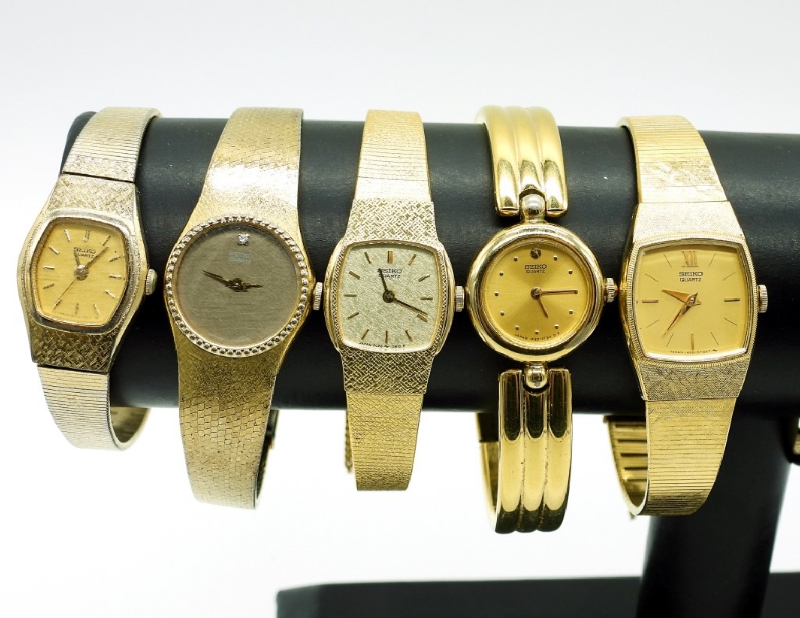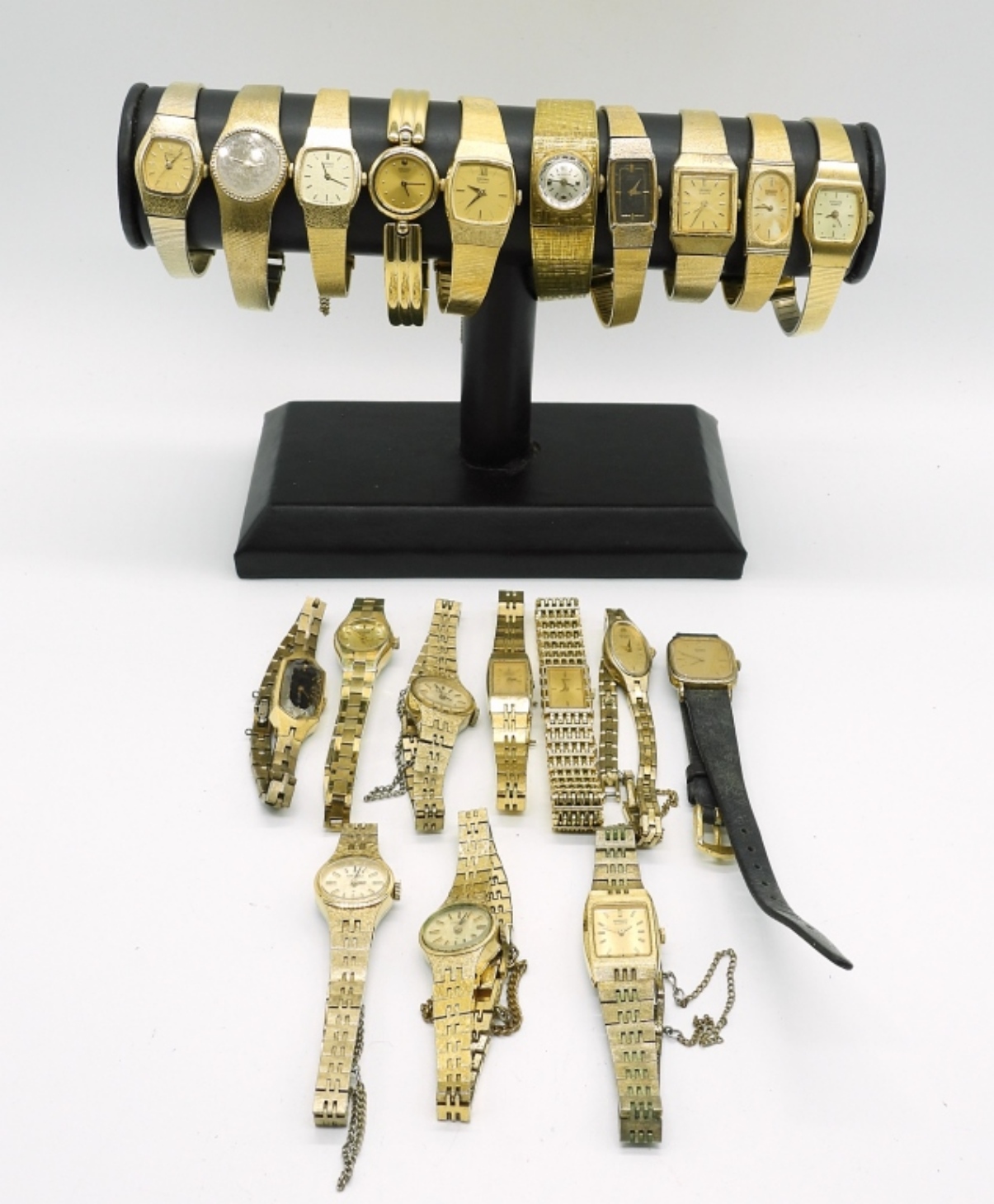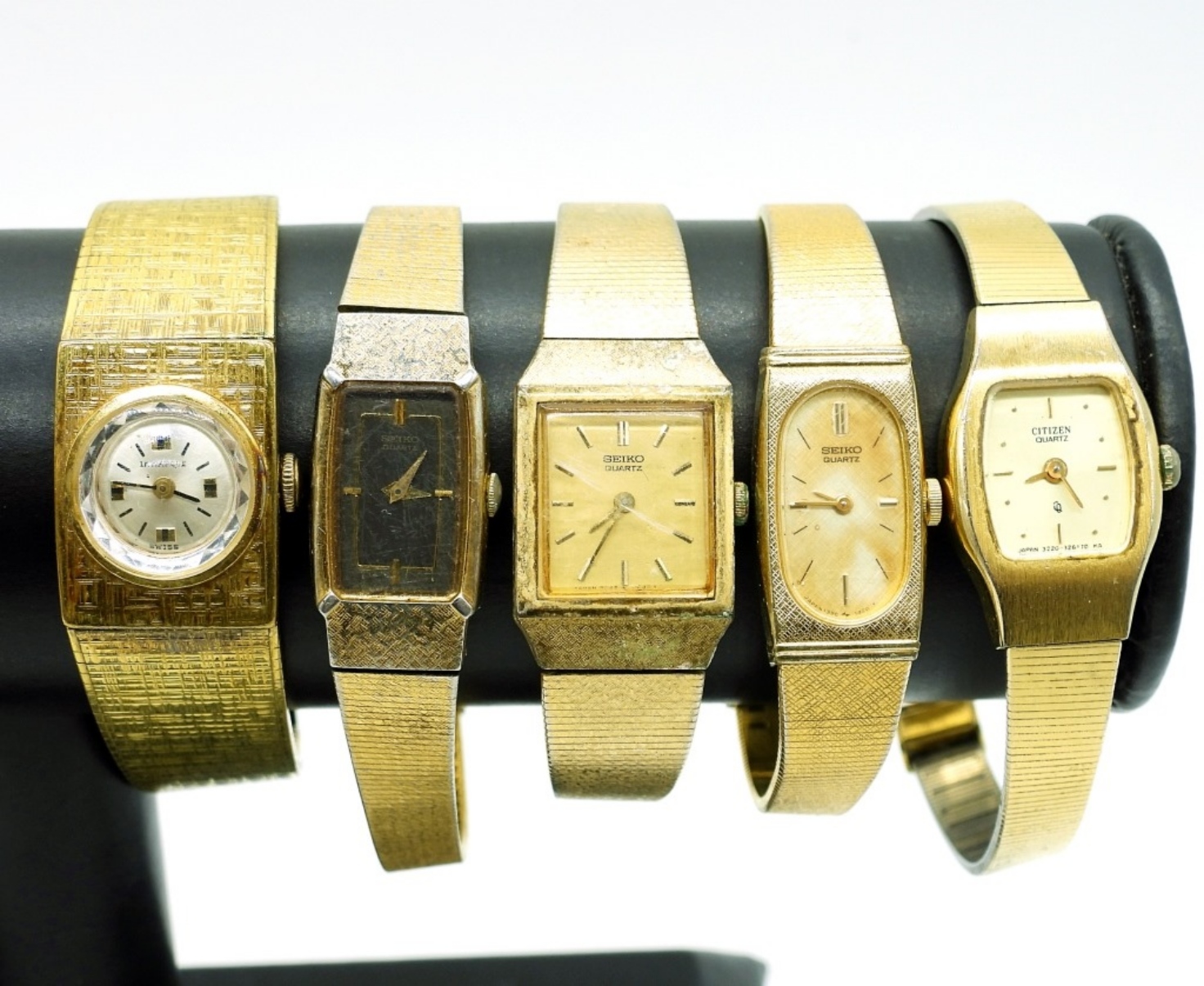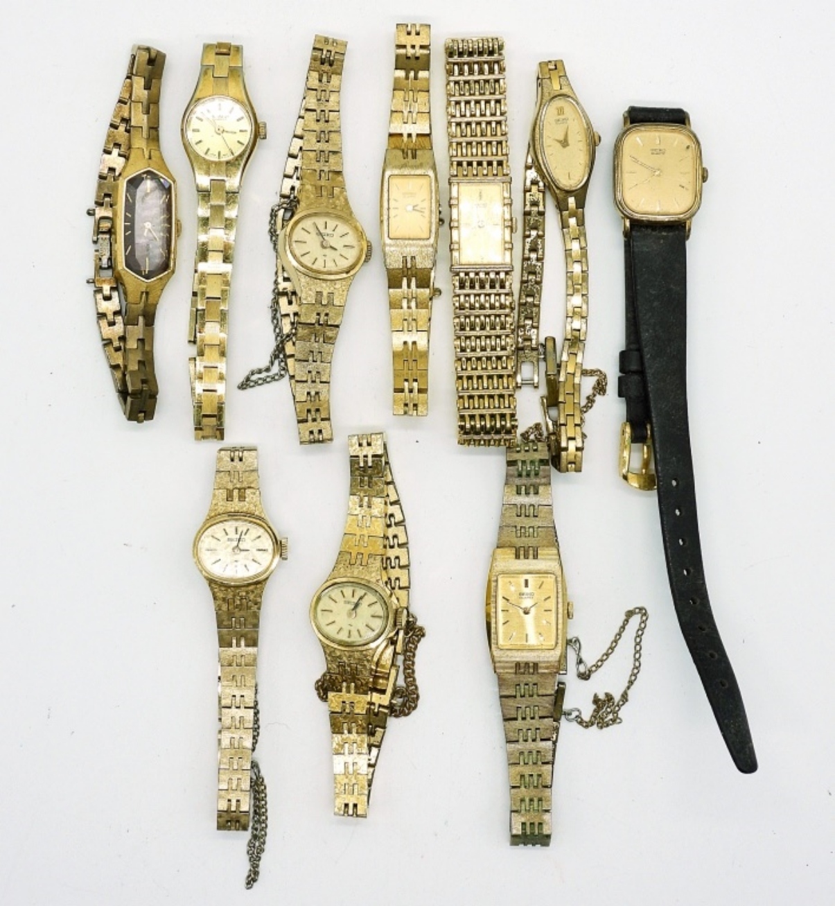 17 GOLD TONE SEIKO VINTAGE LADIES WATCHES. 1 CITIZEN, 1 LA MARQUE, 1 SHARP. SEE PHOTOS (NOT TESTED AS TO WORKING OR NOT)