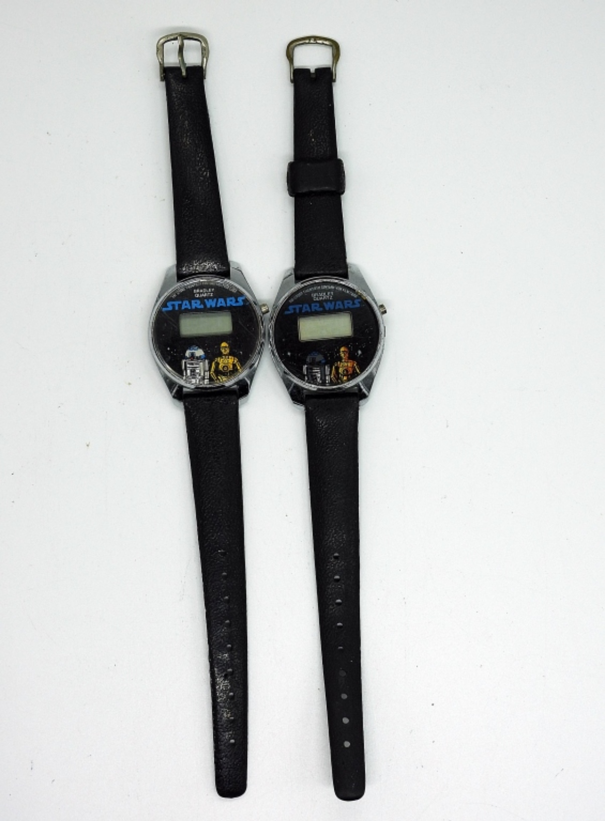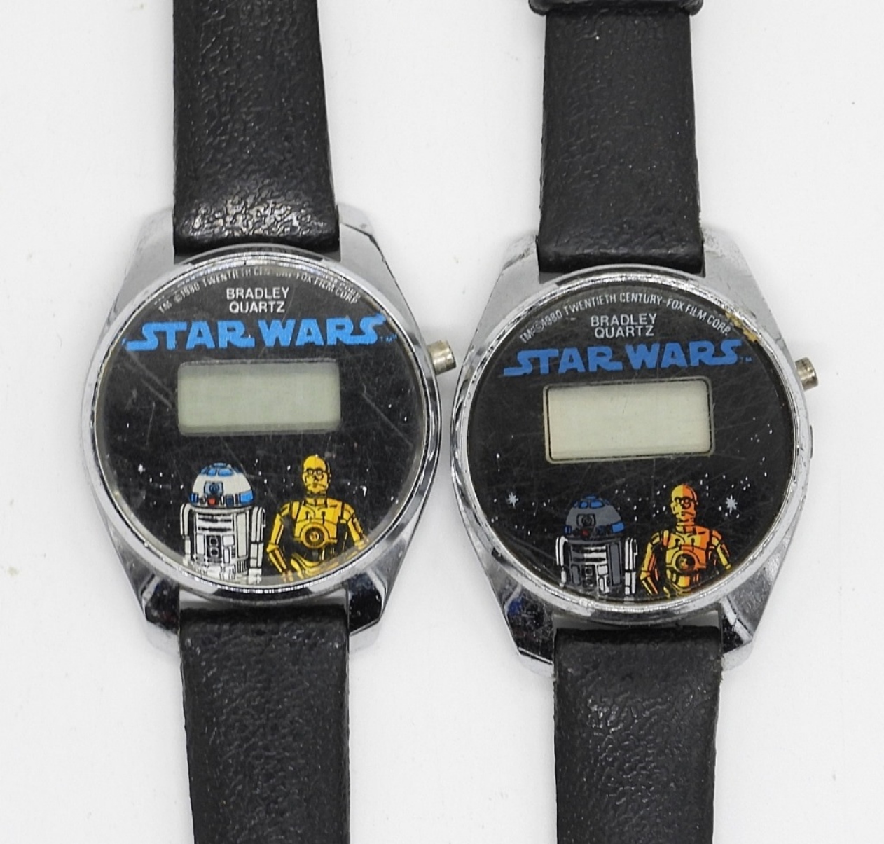 2 IDENTICAL “BRADLEY” STAR WARS DIGITAL WATCHES WITH PLASTIC BANDS. R2DR & C3P0. NEEDS BATTERIES. (NOT TESTED AS TO WORKING OR NOT)