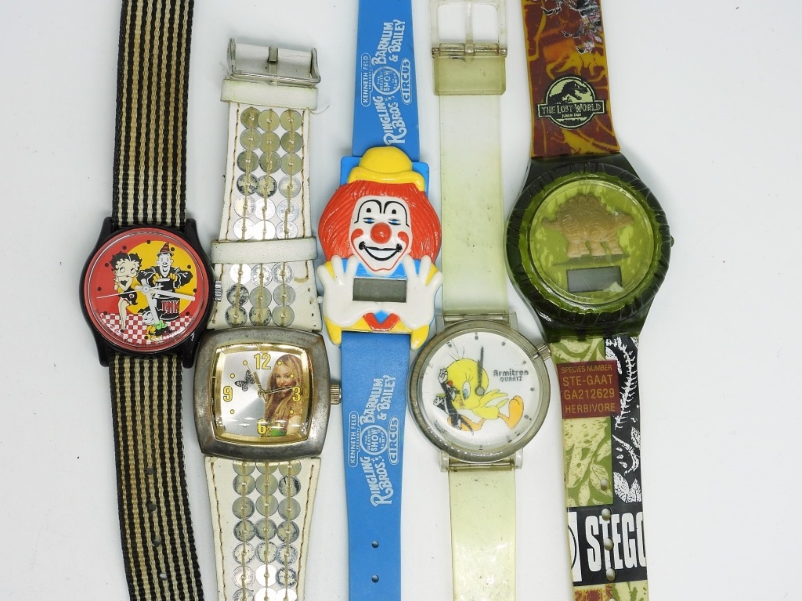 10 KIDS / CARTOON VINTAGE WATCHES. JURASSIC PARK, RINGLING BROTHERS, SYLVESTER & TWEETY, BETTY BOOP, HANNAH MONTANA, 4 MICKEY & MINNIE. SEE PHOTOS. (NOT TESTED AS TO WORKING OR NOT)
