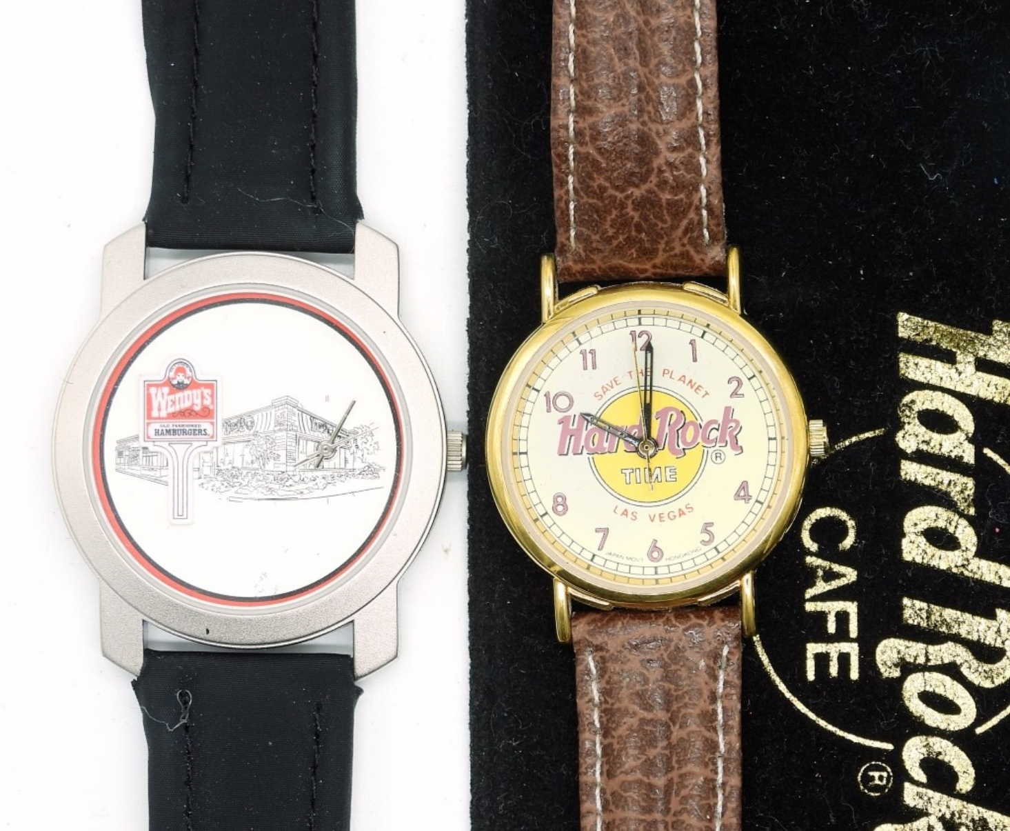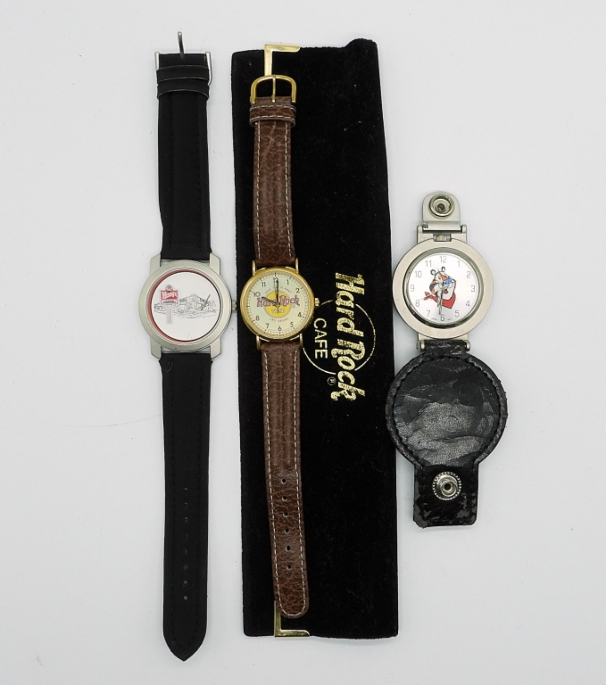 HARD ROCK CAFÉ LAS VEGAS WATCH WITH ORIGINAL CASE, WENDYS BLACK BAND WATCH, KELLOGGS MEMPHIS PLANT/TONY THE TIGER POCKET WATCH. SEE PHOTOS. (NOT TESTED AS TO WORKING OR NOT)