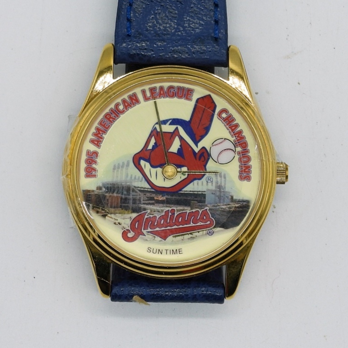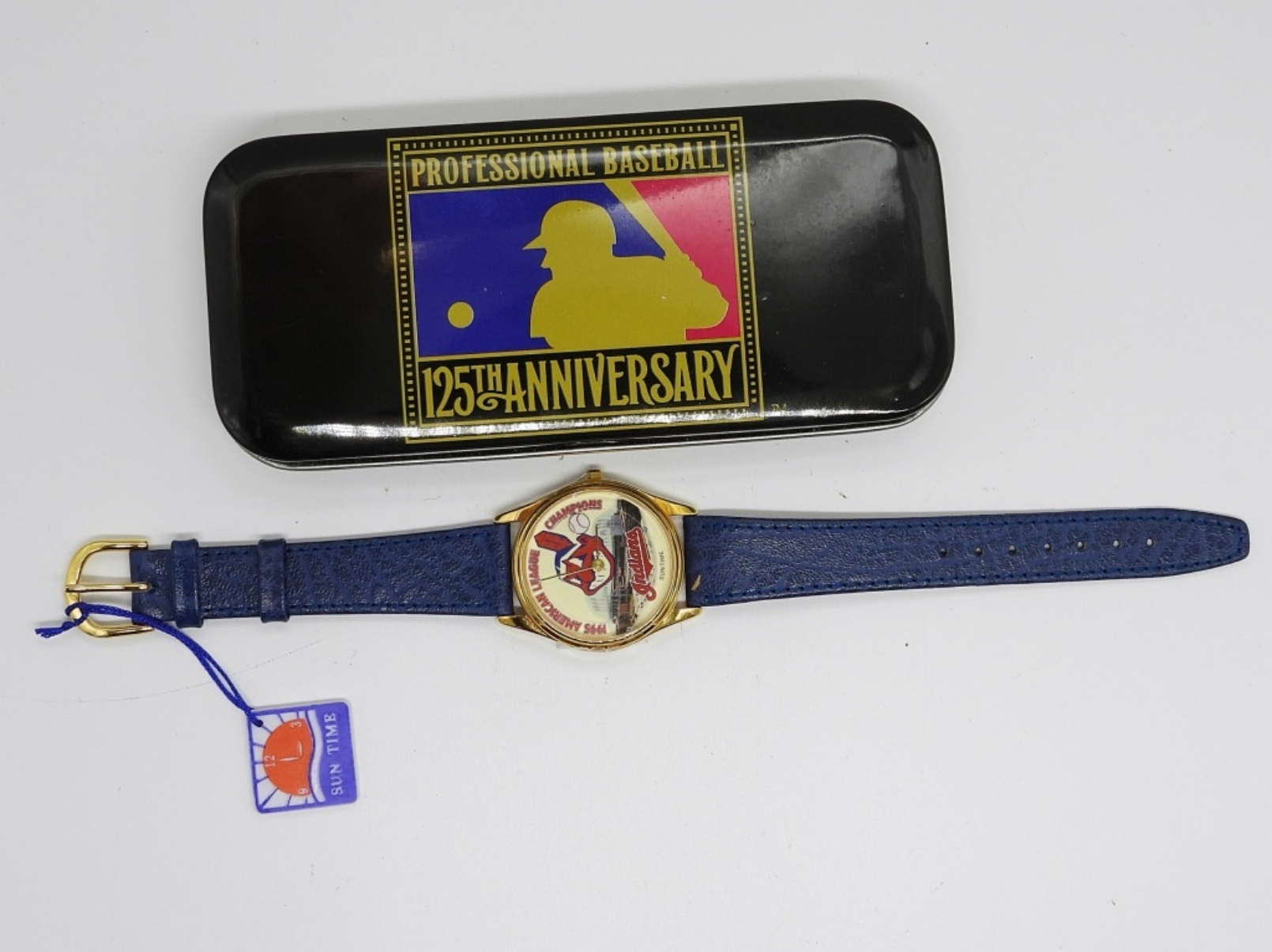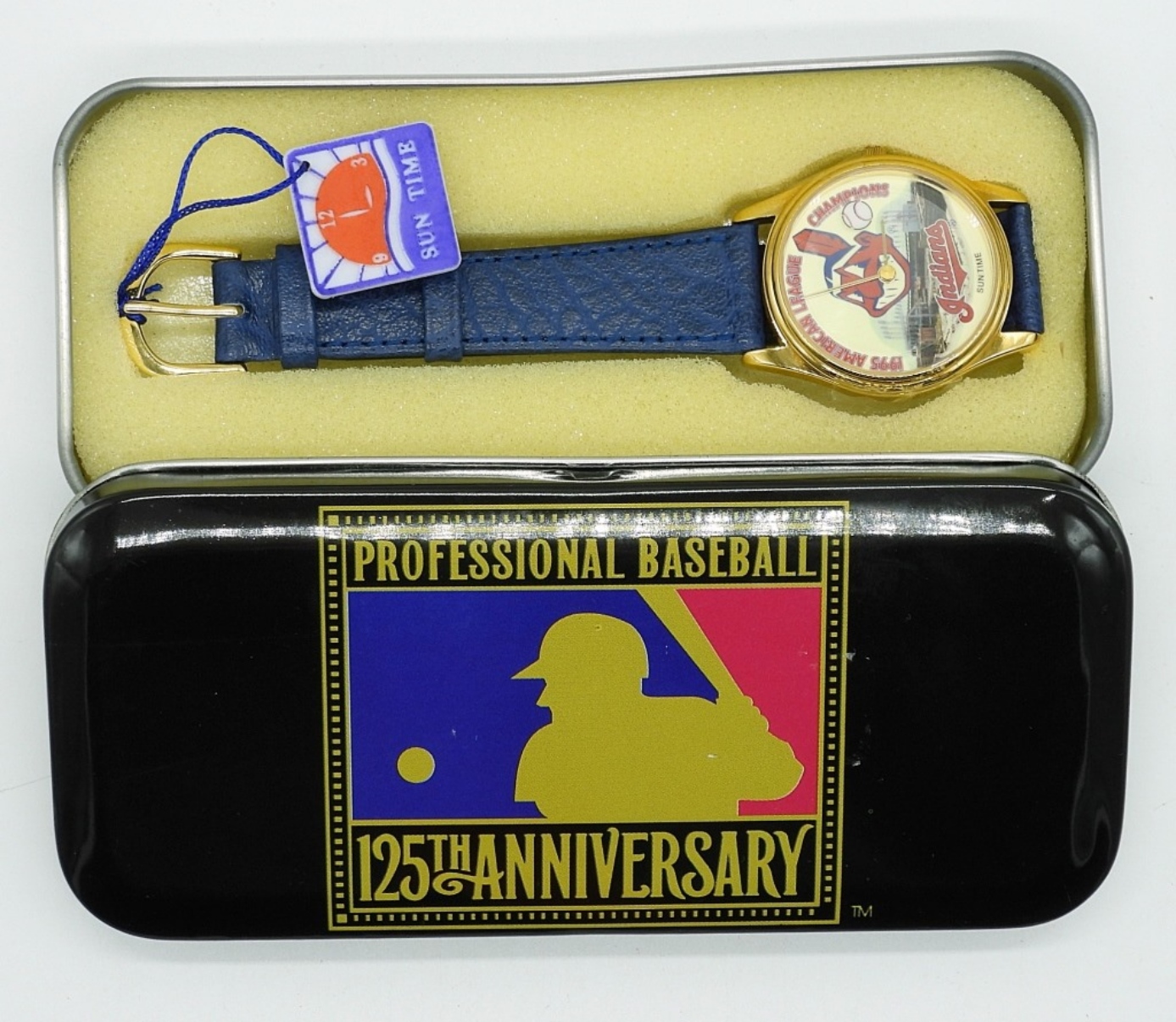 1995 “INDIANS” AMERICAN LEAGUE CHAMPIONS NWT WATCH IN A PROFESSIONAL BASEBALL 125TH ANNIVERSARY TIN. BACK IS LOOSE AND NEEDS TO BE PUT BACK ON. SEE PHOTOS (NOT TESTED AS TO WORKING OR NOT)