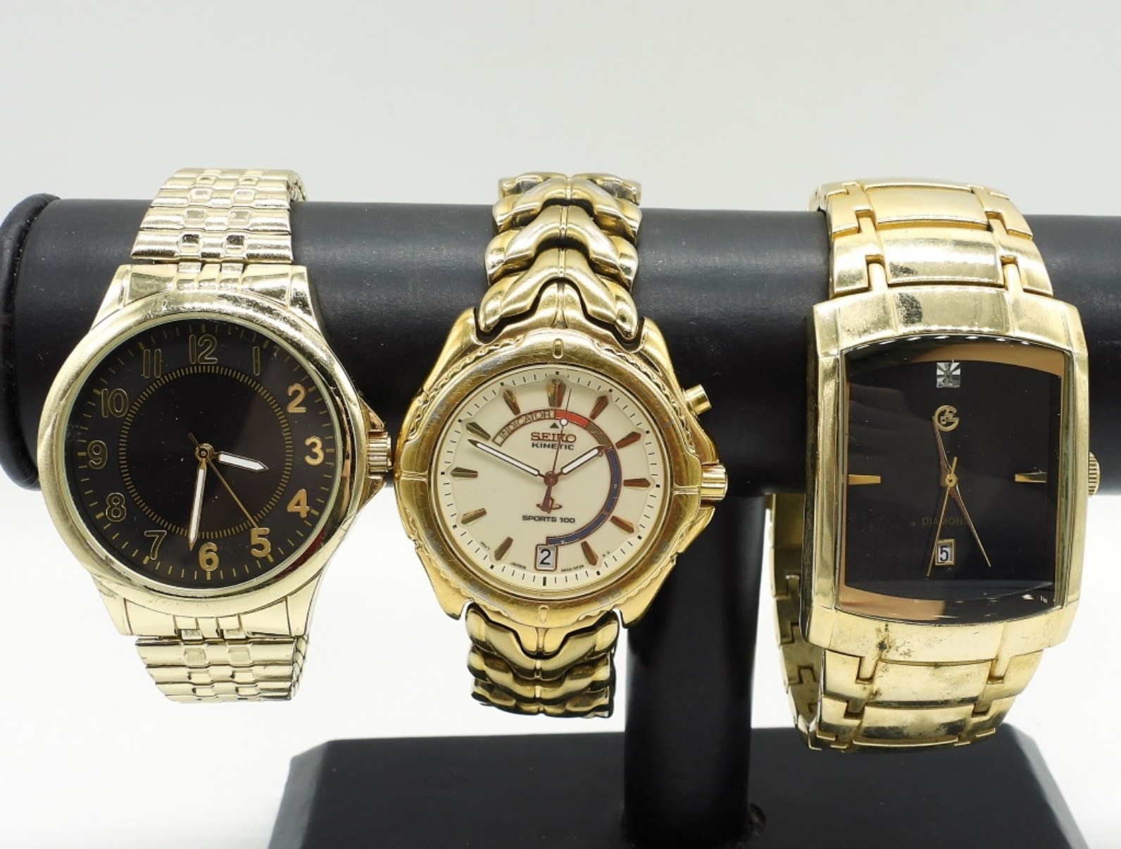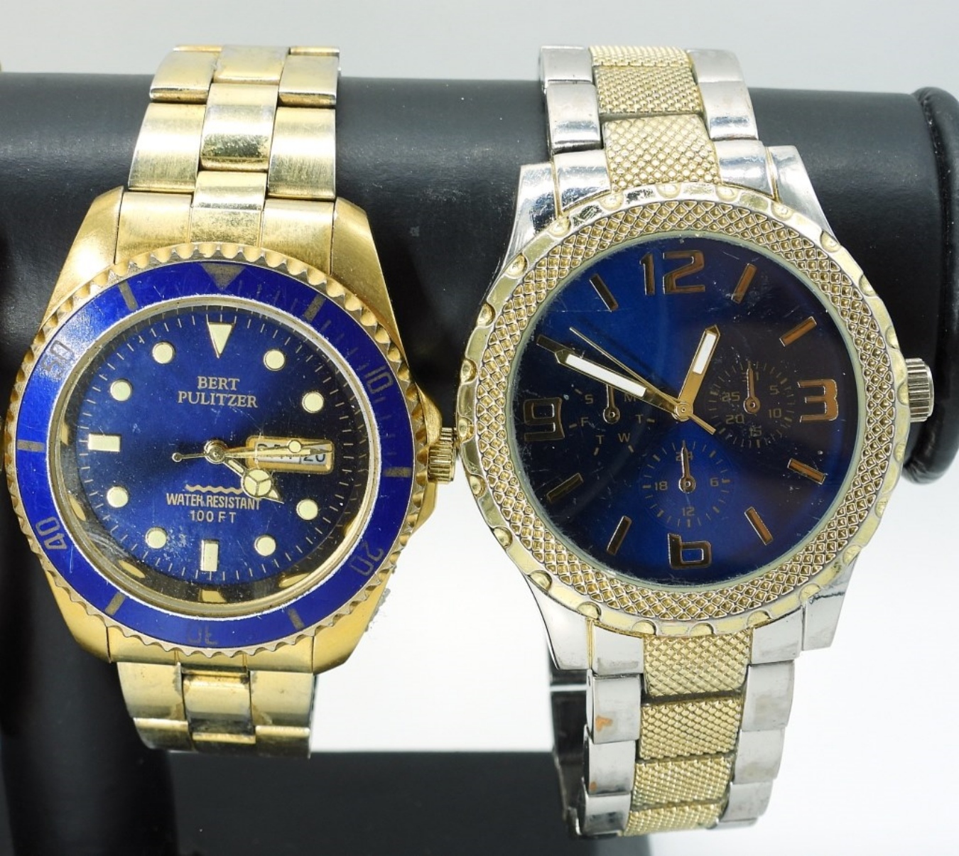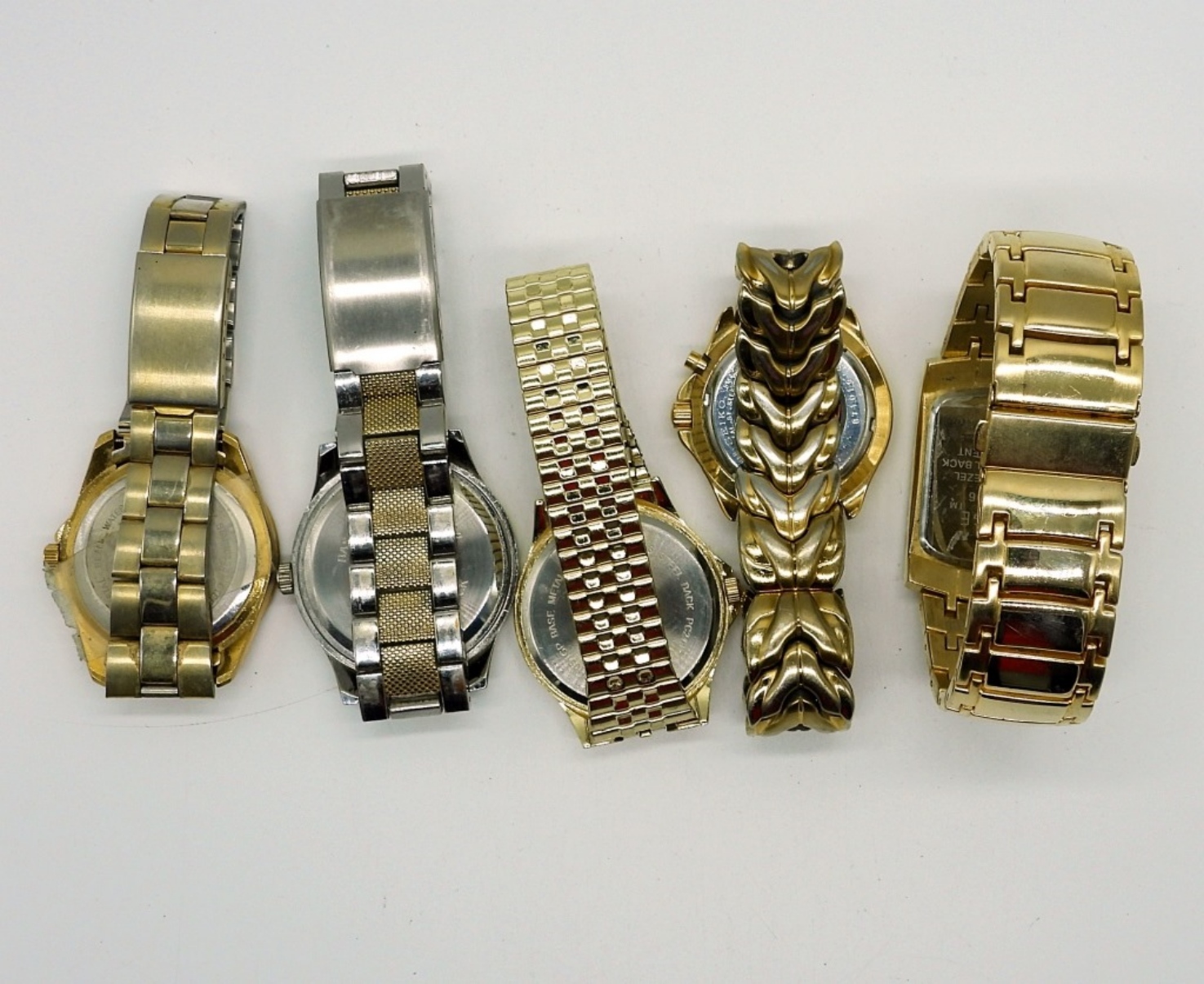 5 LARGE FACED, CHUNKY MEN’S WATCHES. GOLD AND SILVER TONED. GEORGE, SEIKO, BERT PULITZER (NOT TESTED AS TO WORKING OR NOT)