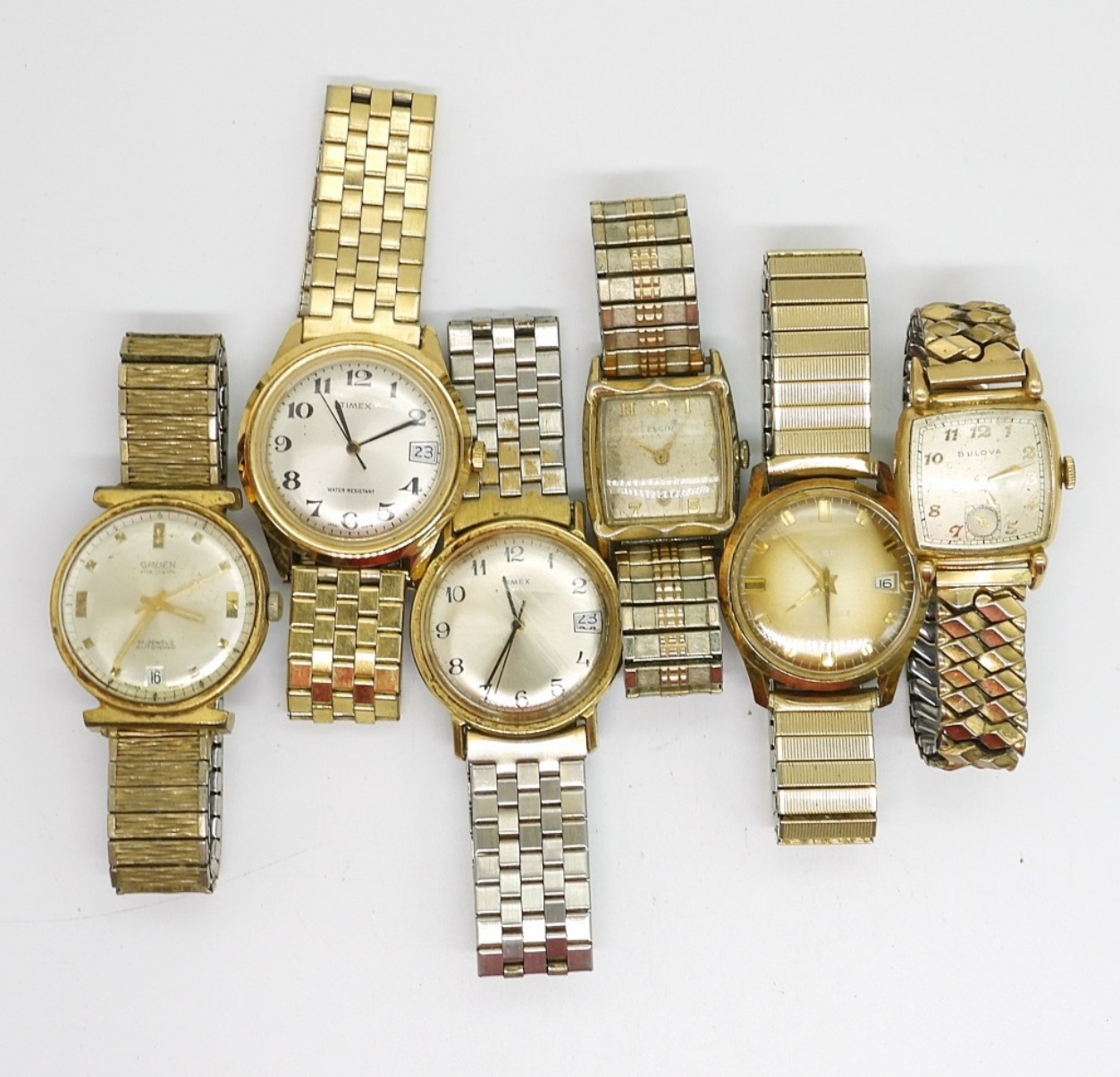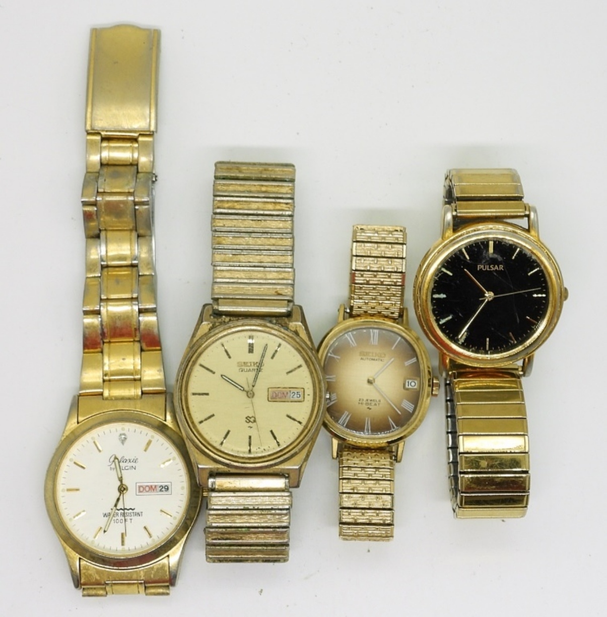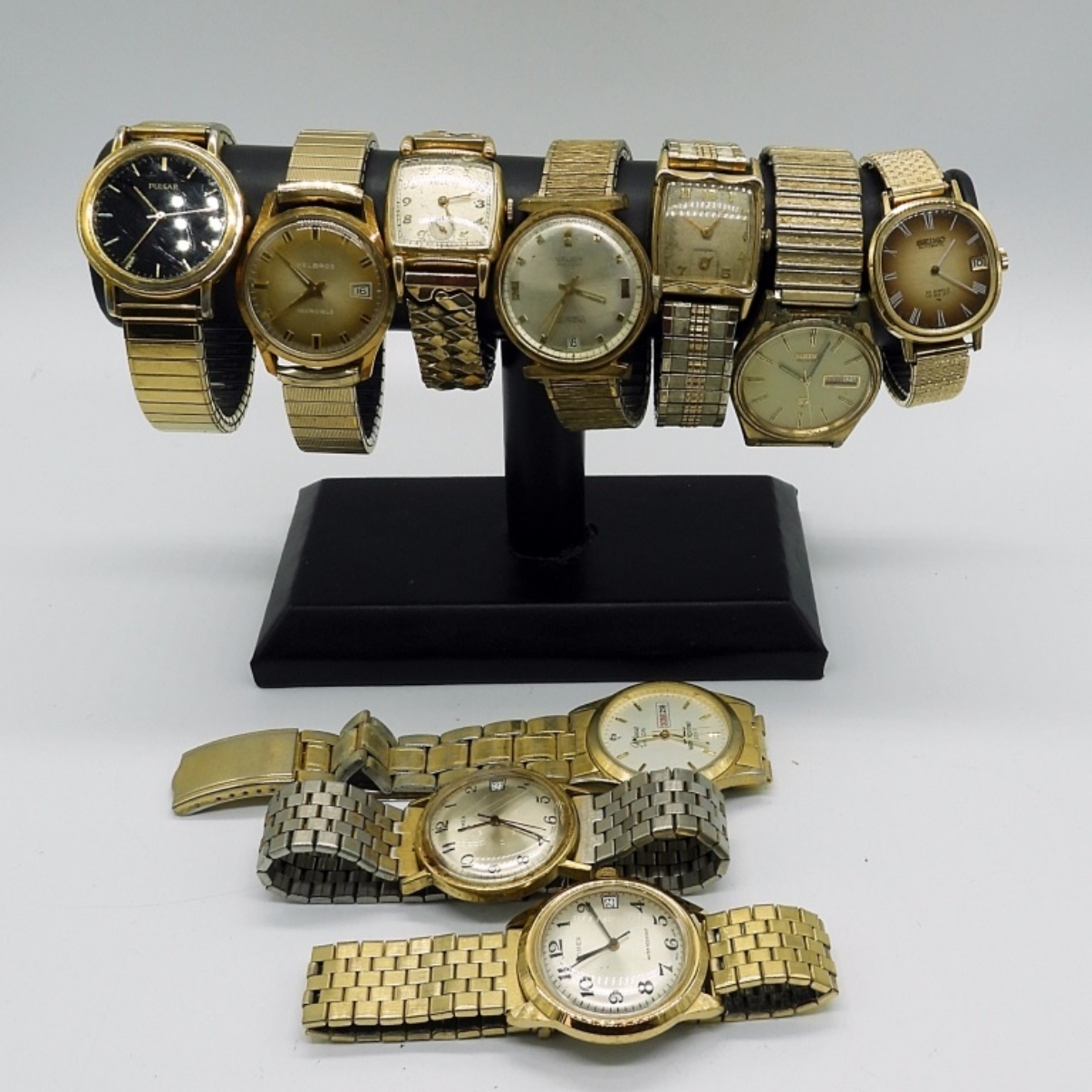 10 VINTAGE GOLD AND SILVER TONE MEN’S VINTAGE WRIST WATCHES. TIMEX, SEIKO, ELGIN, PULSAR, BULOVA, HELBROS, GRUEN. SEE PHOTOS. (NOT TESTED AS TO WORKING OR NOT)