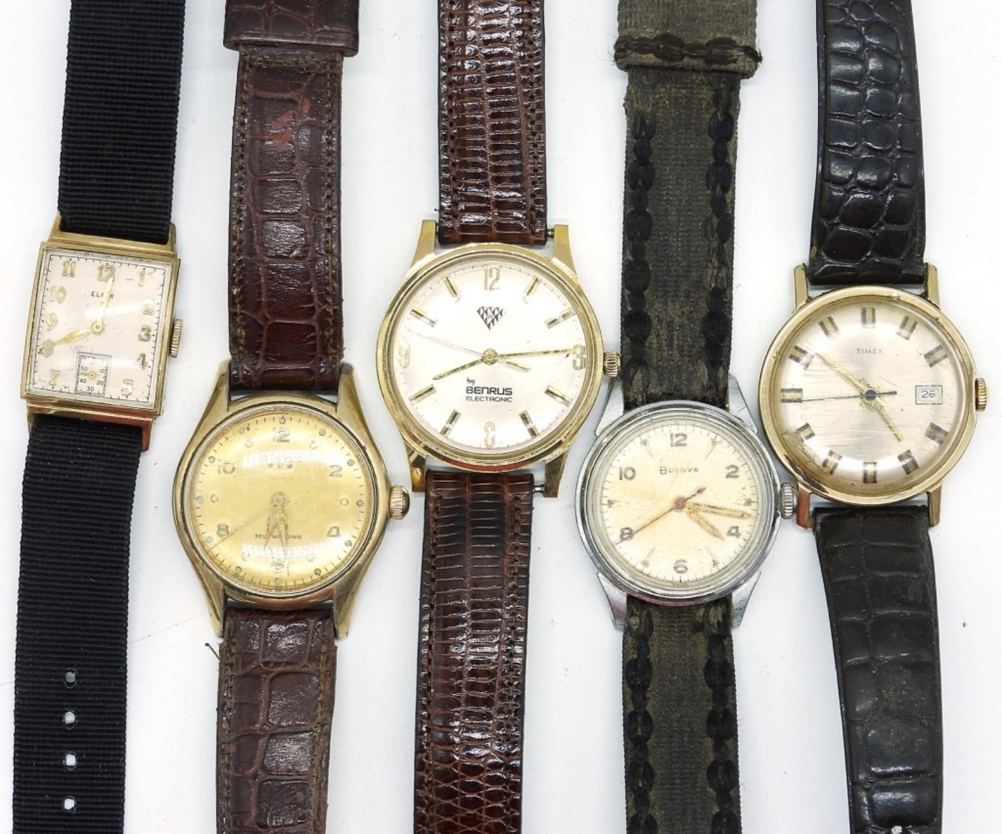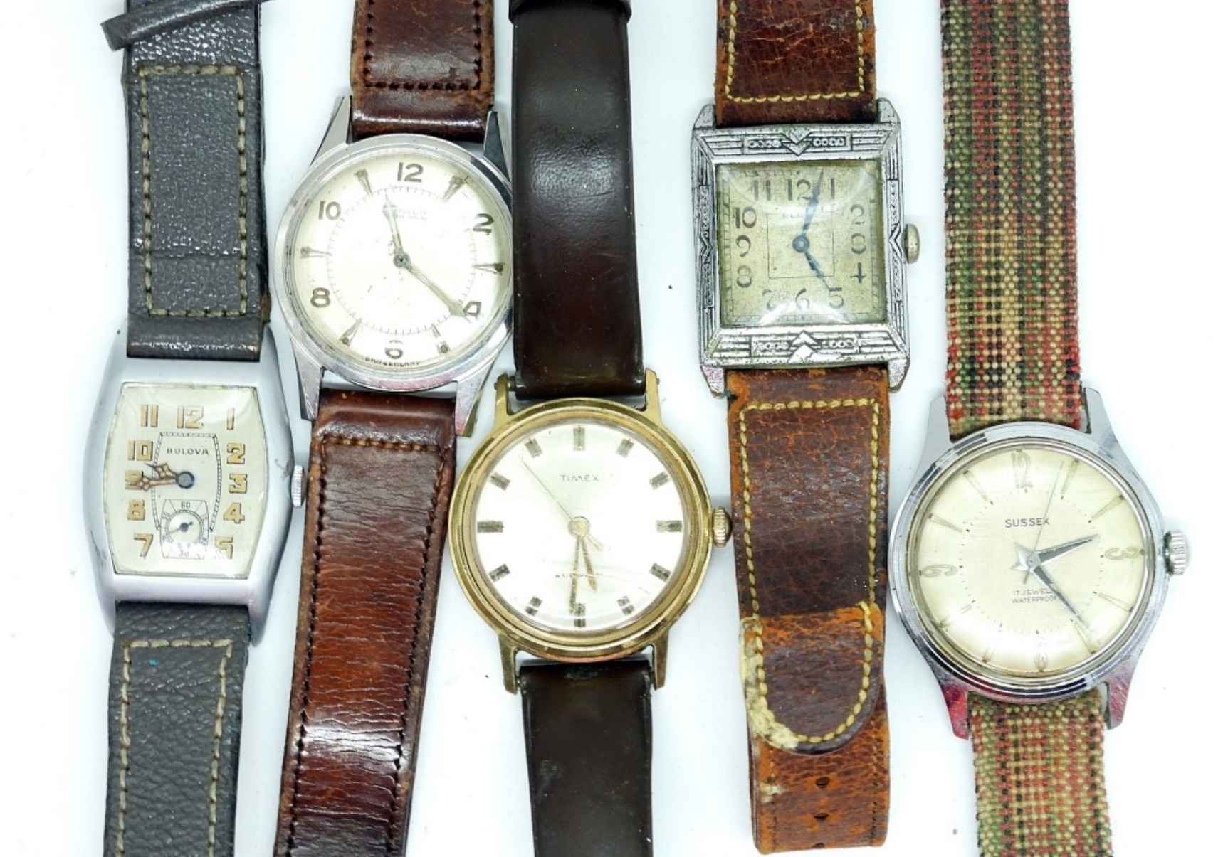 10 VINTAGE MEN’S LEATHER WATCHES. GRUEN, BULOVA, BENRUS, ELGIN, TIMEX, SUSSEX, (NOT TESTED AS TO WORKING OR NOT)
