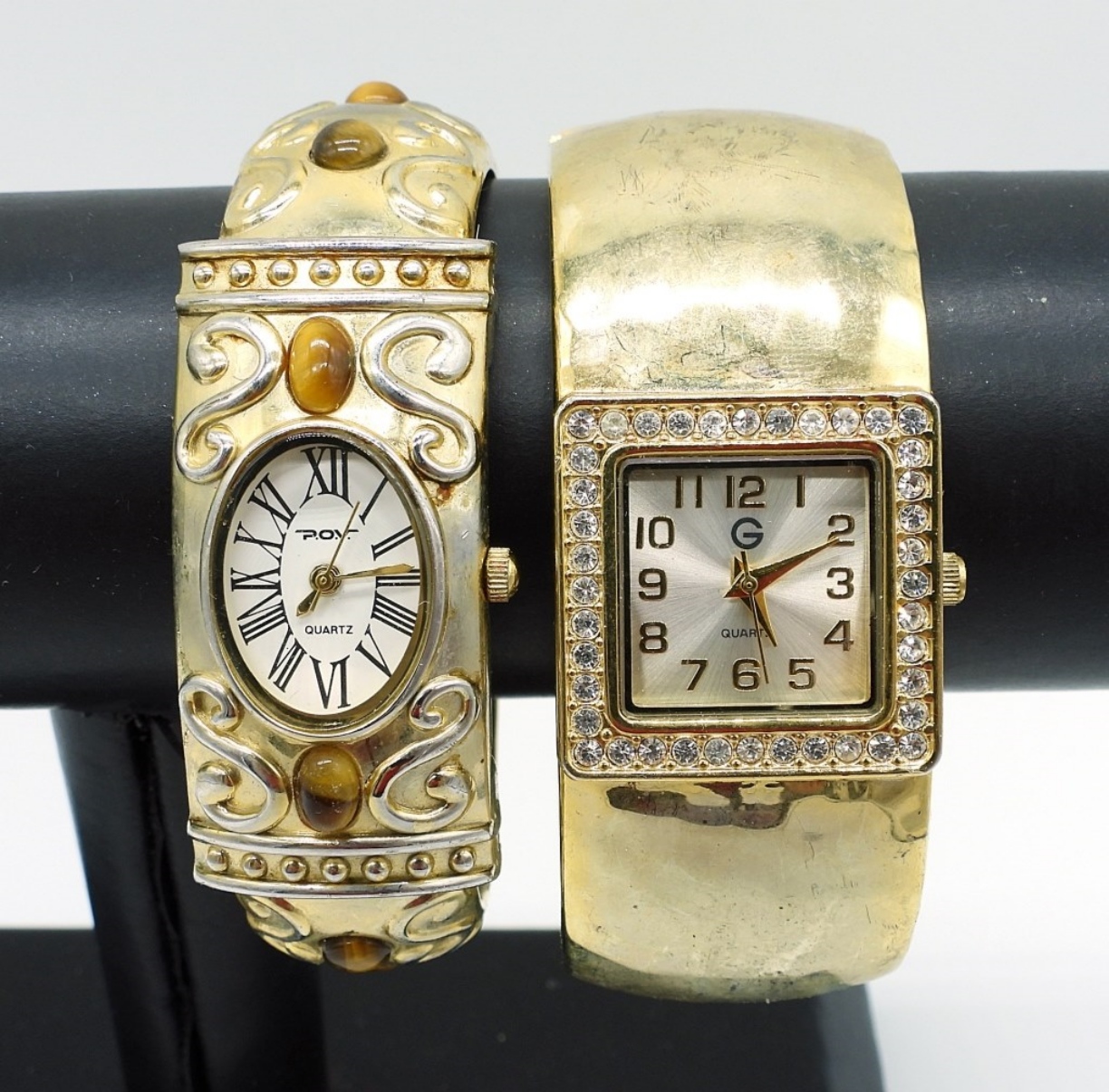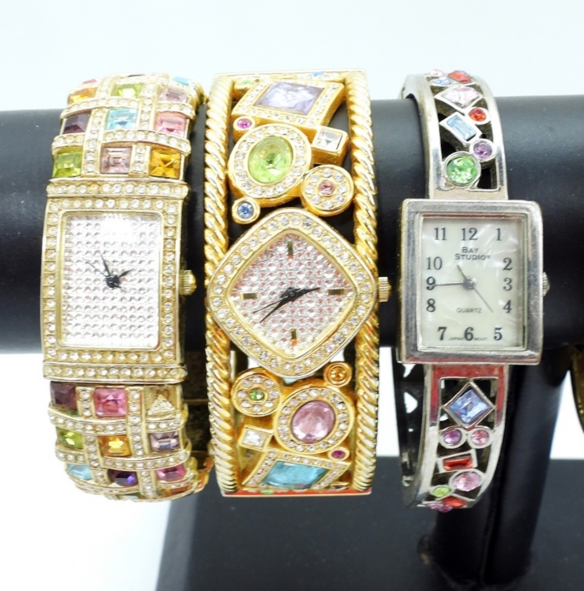 5 LADIES BRACELET WATCHES, GOLD AND SILVER TONE WITH GEMSTONES. (NOT TESTED AS TO WORKING OR NOT)