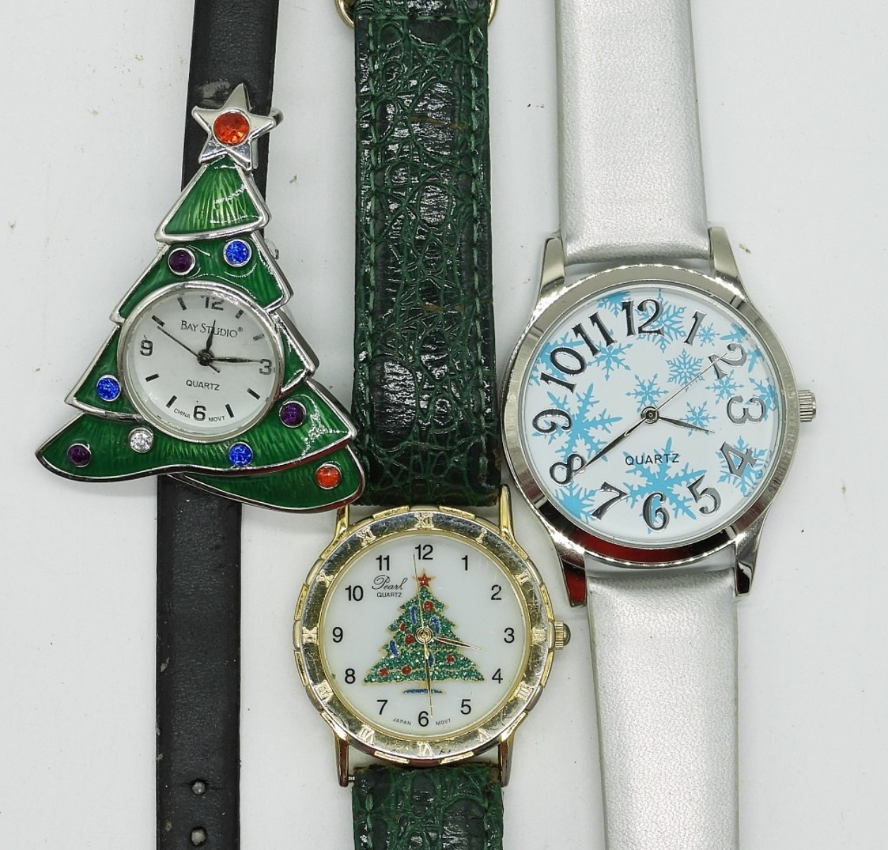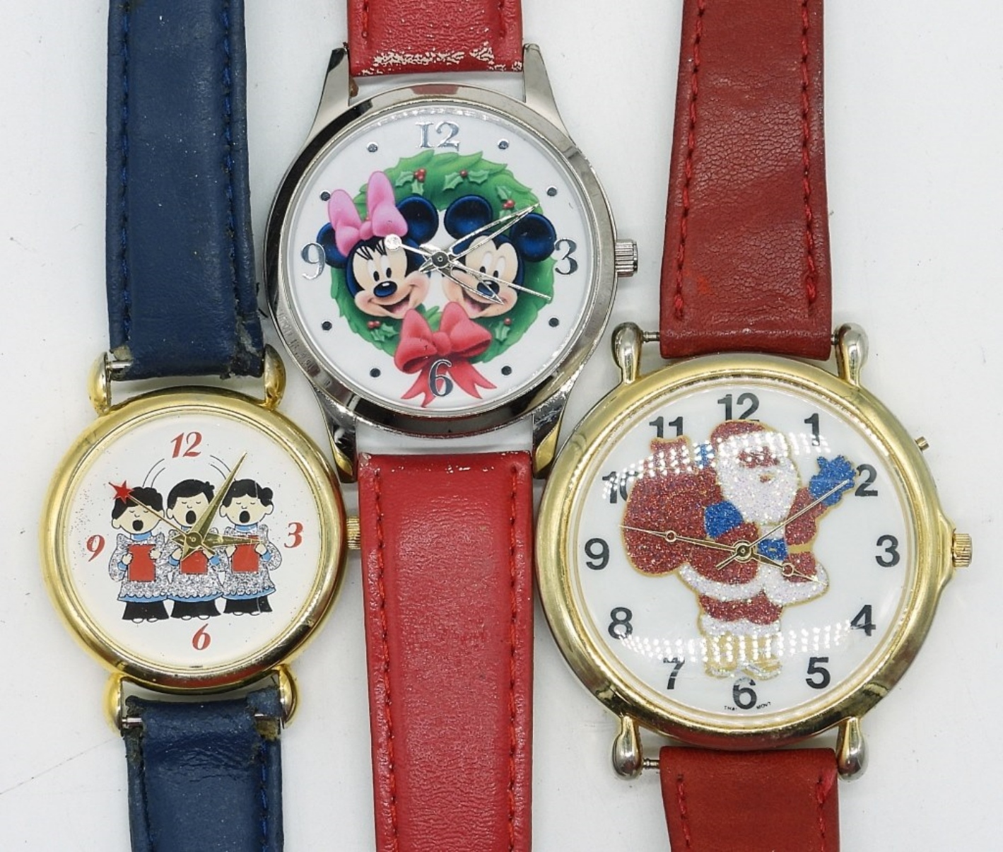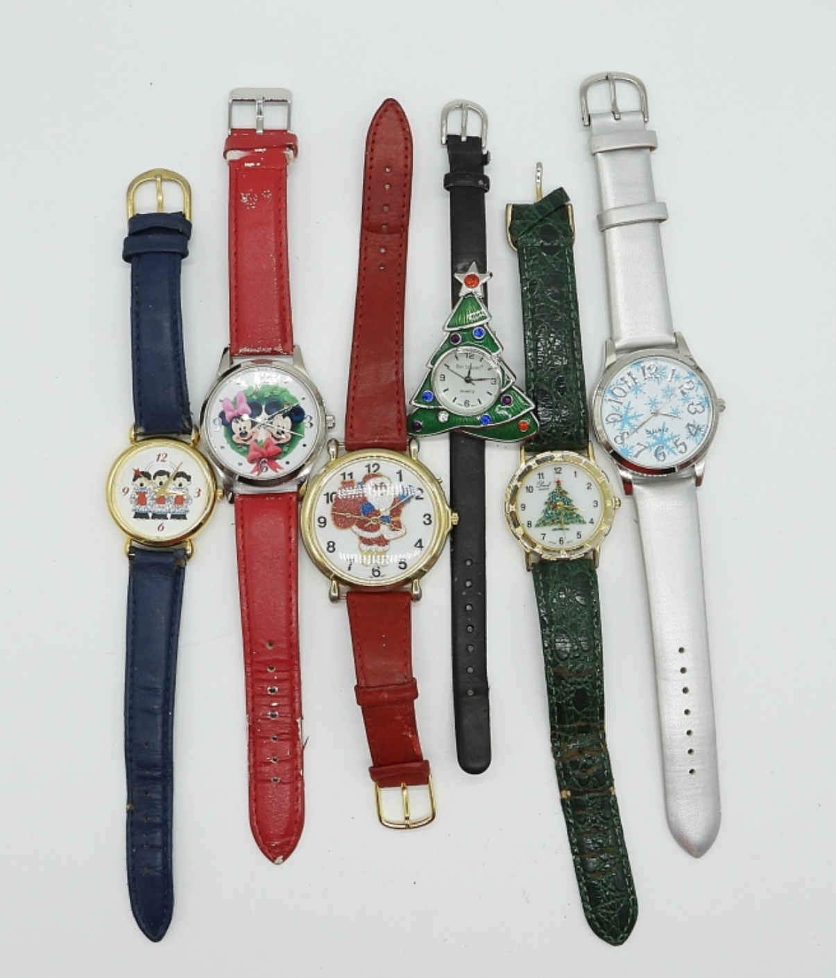 6 CHRISTMAS WATCHES WITH LEATHER BANDS. SEE PHOTOS. (NOT TESTED AS TO WORKING OR NOT)