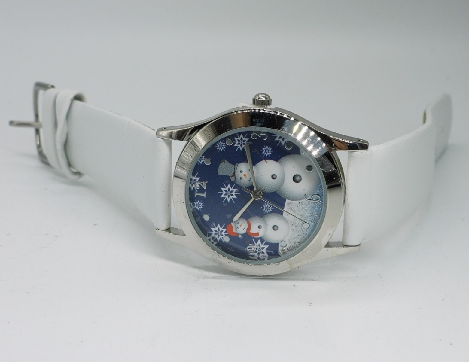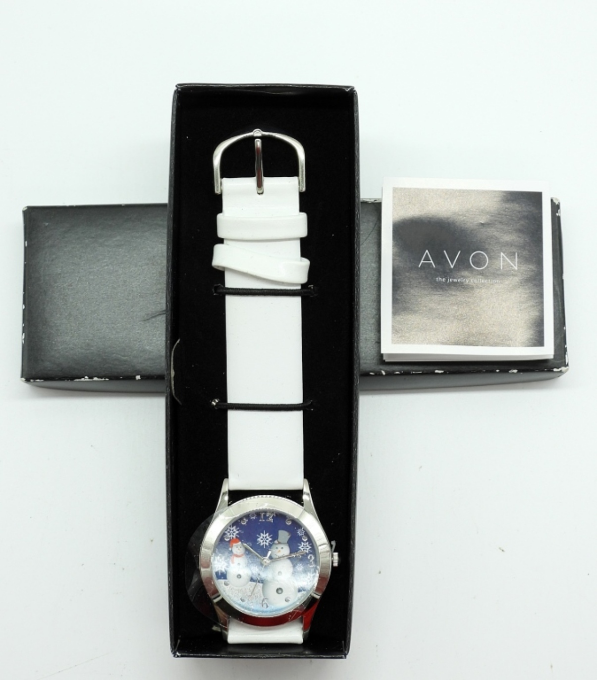 AVON ‘TIS THE SEASON’ SNOMAN WINTER WATCH WITH WHITE LEATHER BAND. LOOKS UNWORN. SEE PHOTOS. (NOT TESTED AS TO WORKING OR NOT)