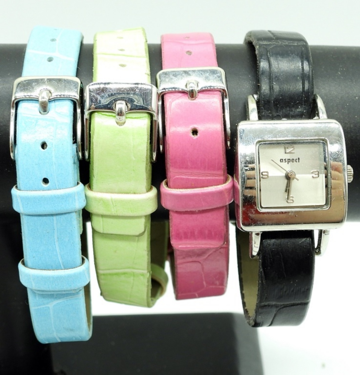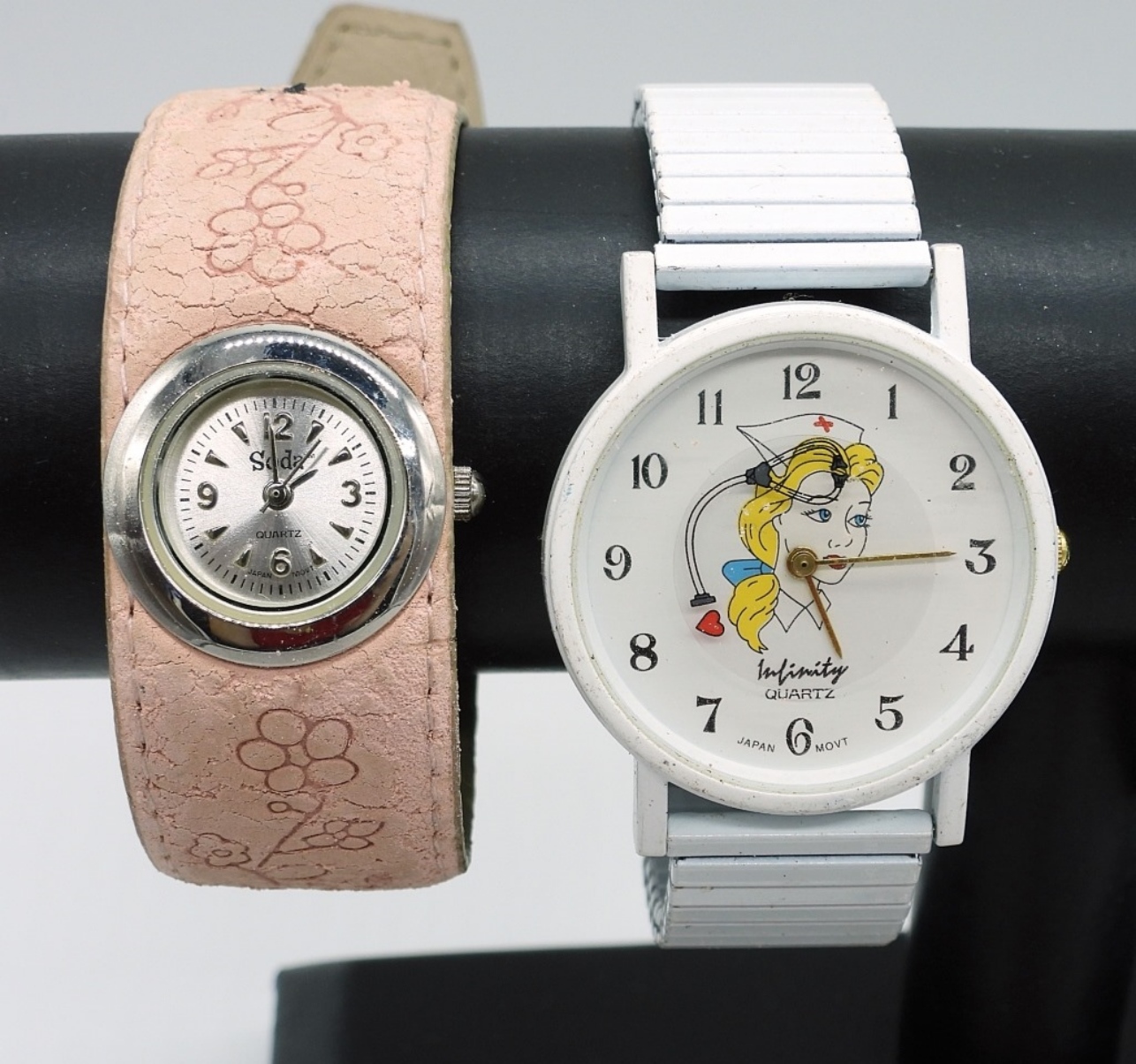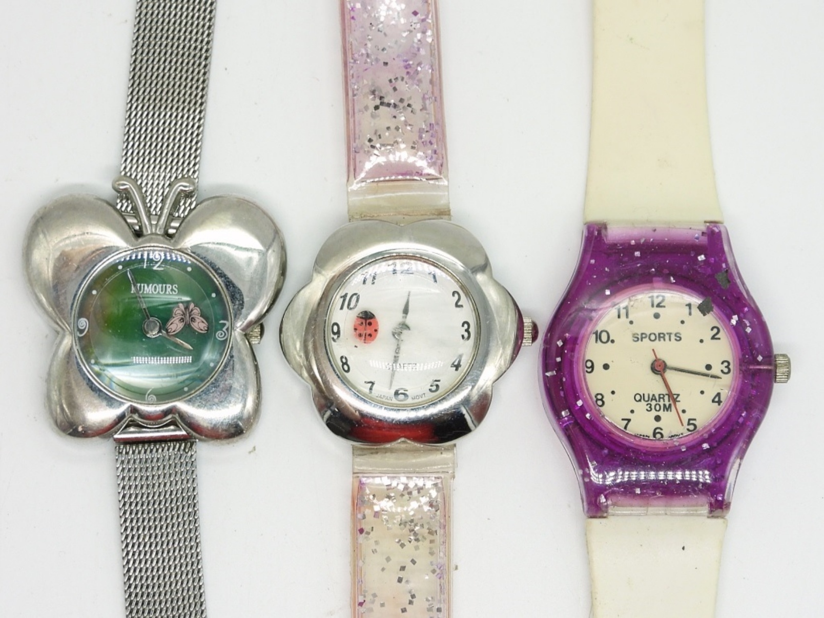 6 CHILDREN’S WATCHES. LADYBUG,BUTTERFLY, PINK FLORAL, NURSE BELLE & ONE WITH 4 INTERCHANGEABLE BANDS. SEE PHOTOS. (NOT TESTED AS TO WORKING OR NOT)