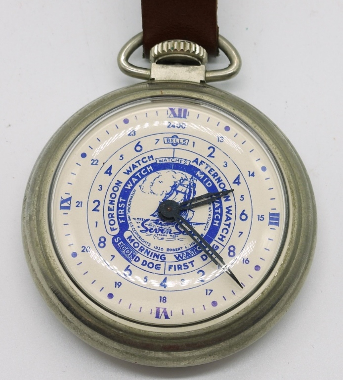 VINTAGE INGRAHAM SEVEN SEAS SHIPMATE NAUTICAL SAILOR POCKET WATCH. RUNS WHEN WOUND, DON’T KNOW IF IT KEEPS TIME. (NOT TESTED AS TO WORKING OR NOT)