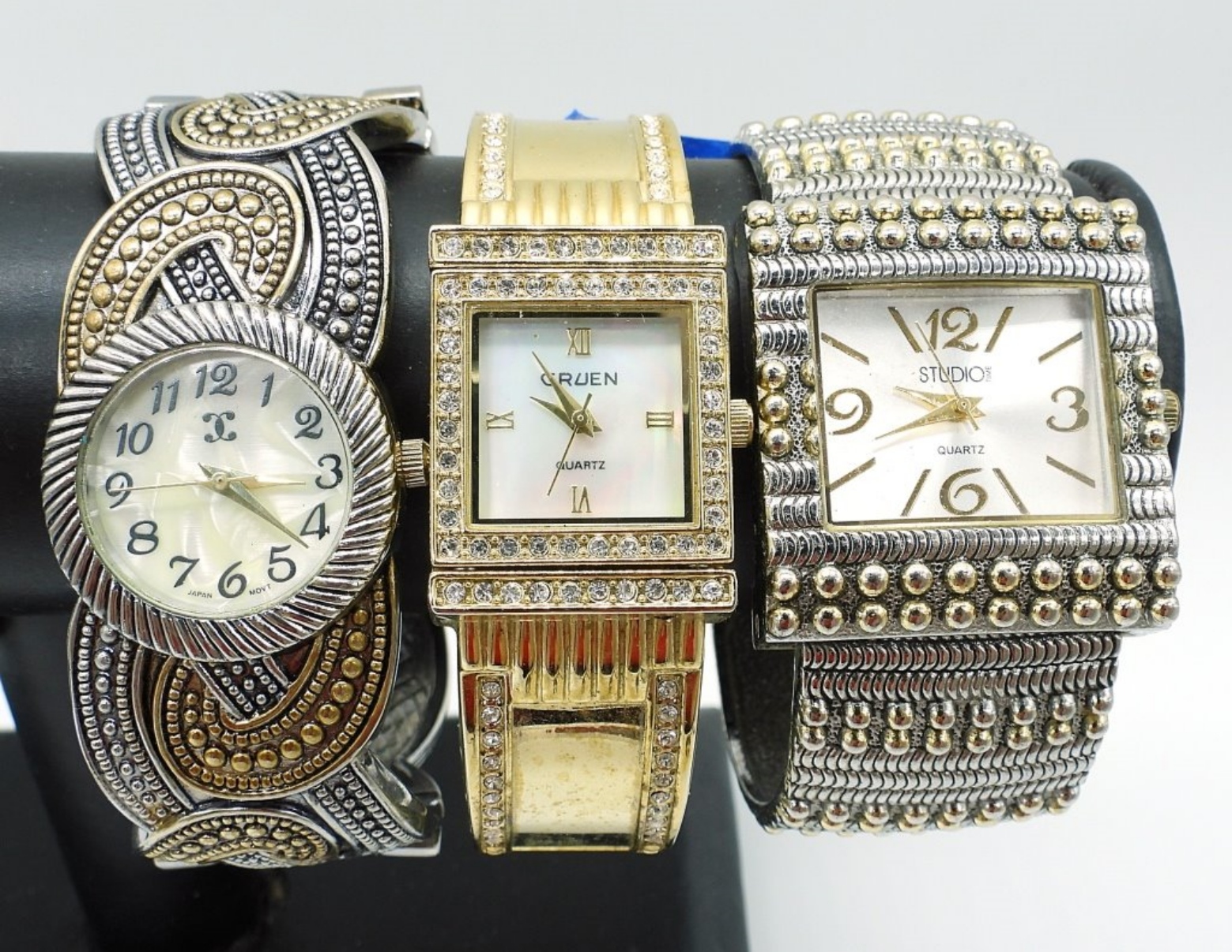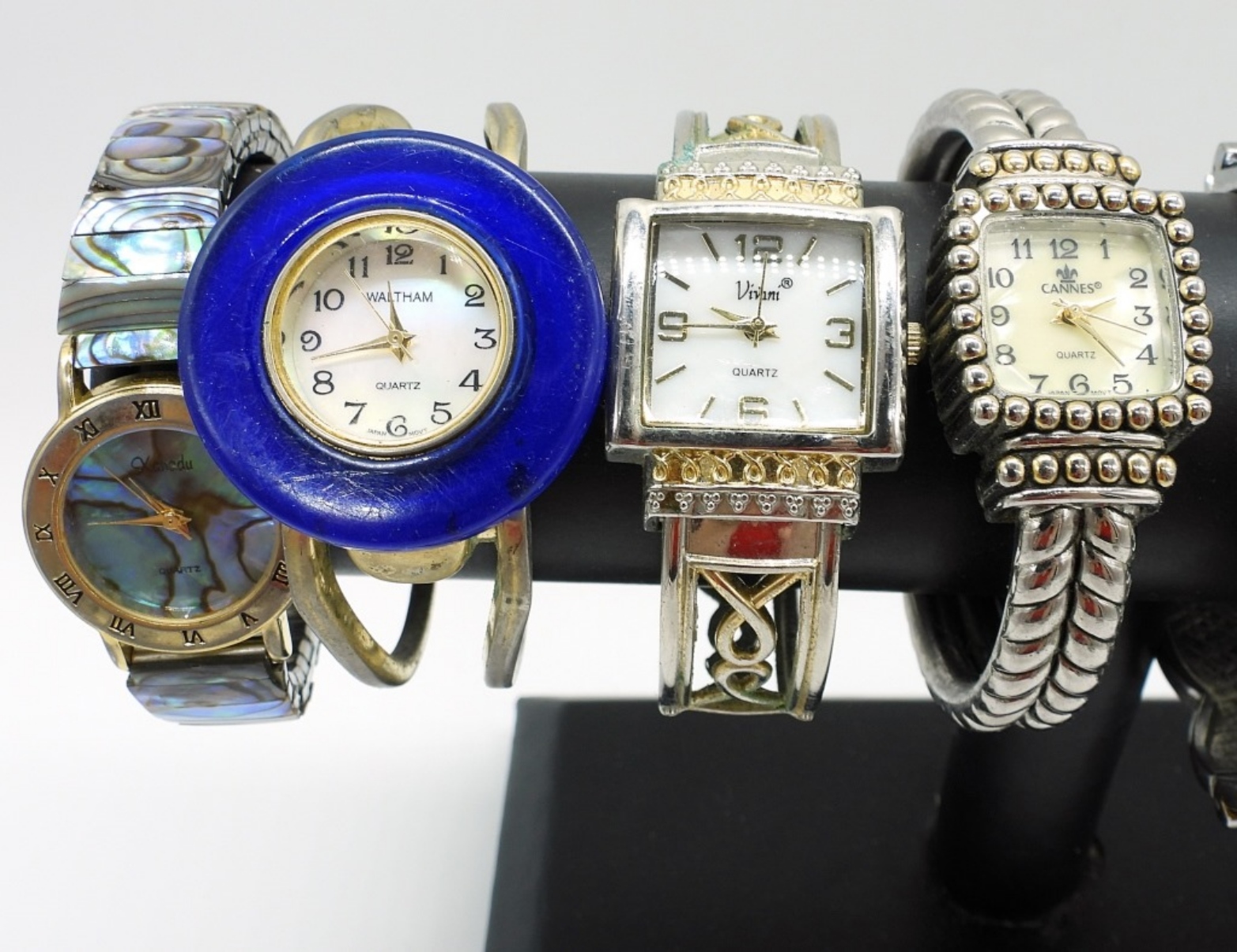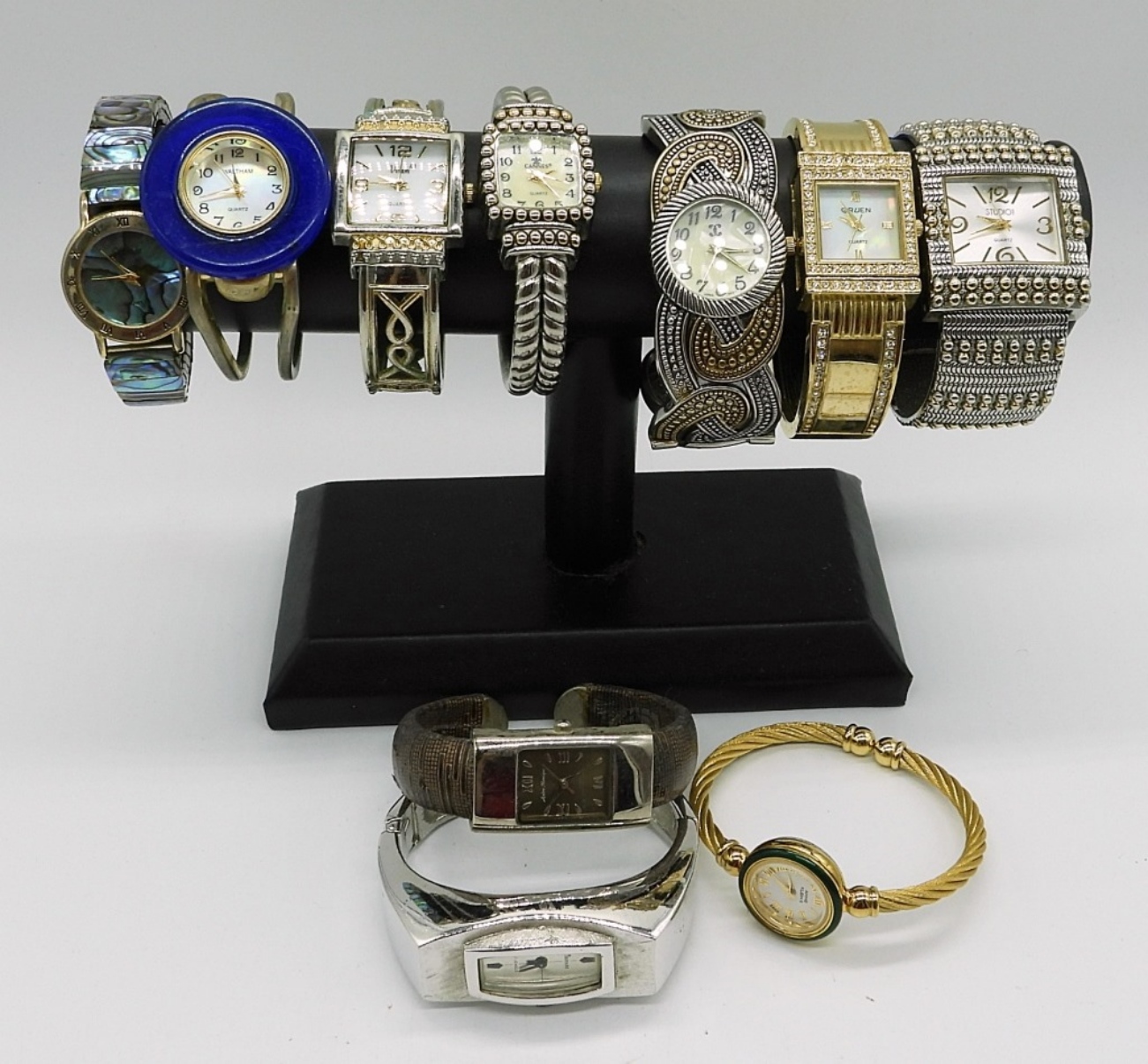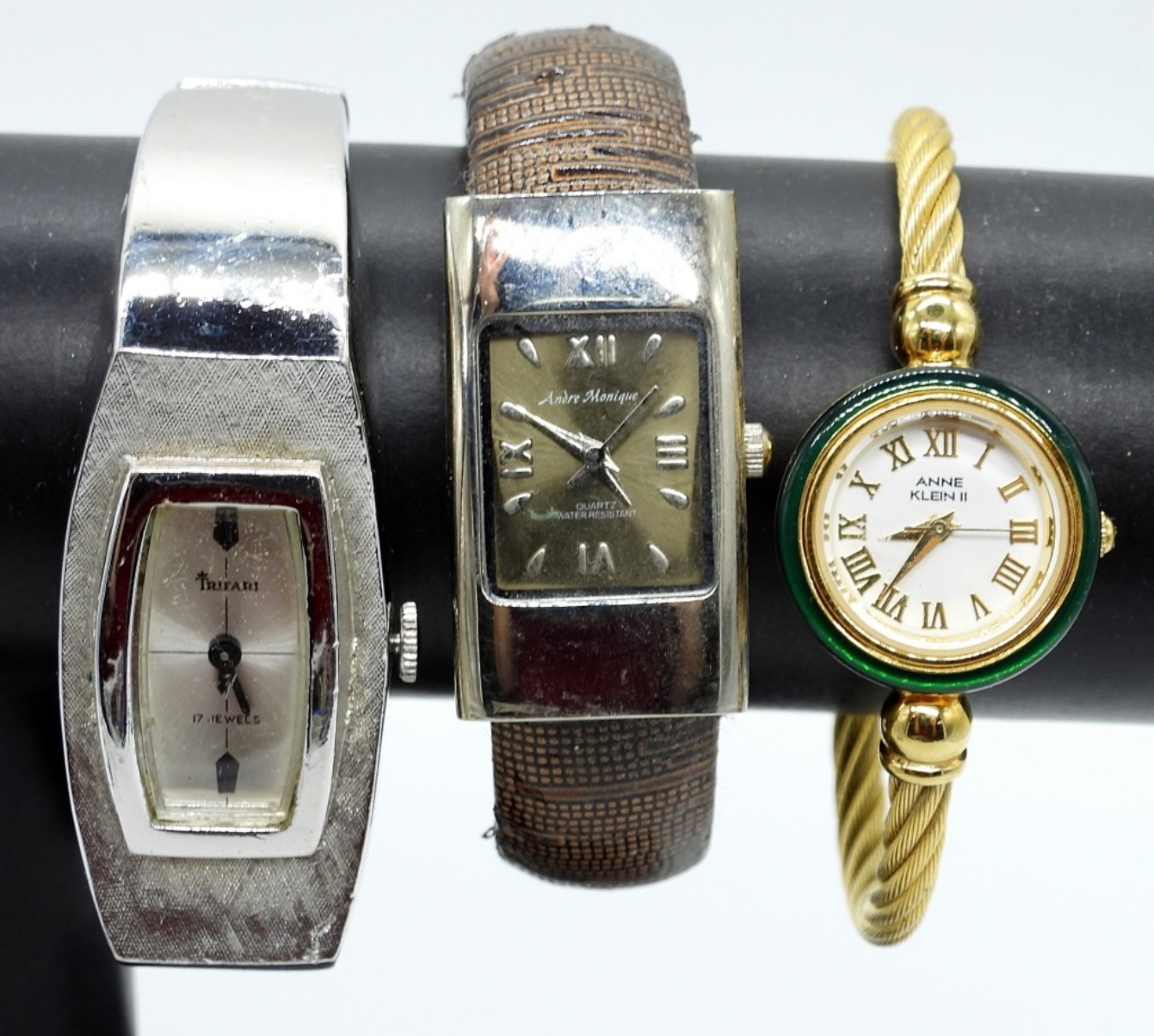 SILVER AND GOLD TONE CUFF BRACELET WATCHES. GRUEN, STUDIO, ANNE KLEIN, ANDRE MONIQUE, TRIFARI, VIVANI, CANNES, WALTHAM. SEE PHOTOS (NOT TESTED AS TO WORKING OR NOT)
