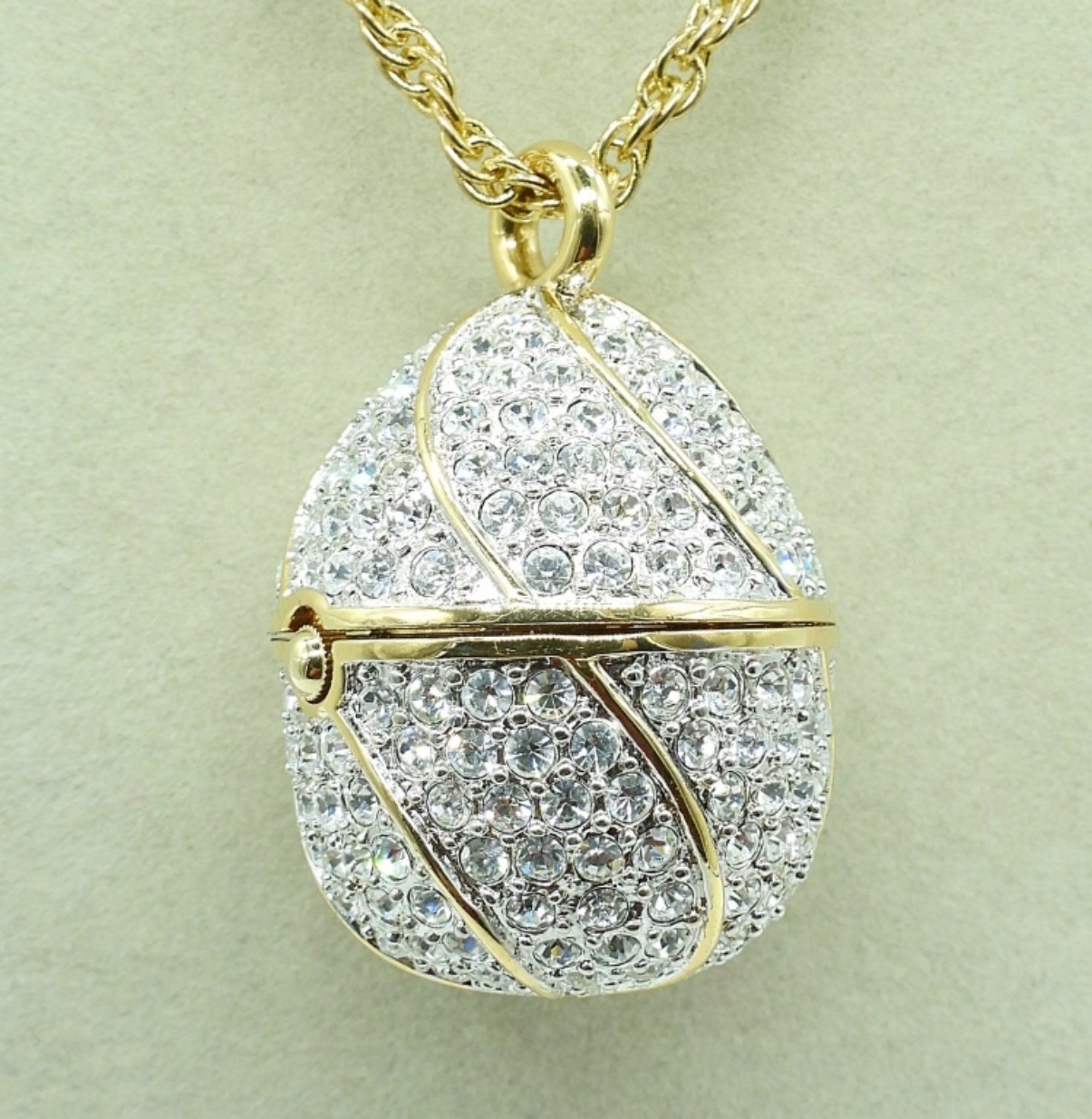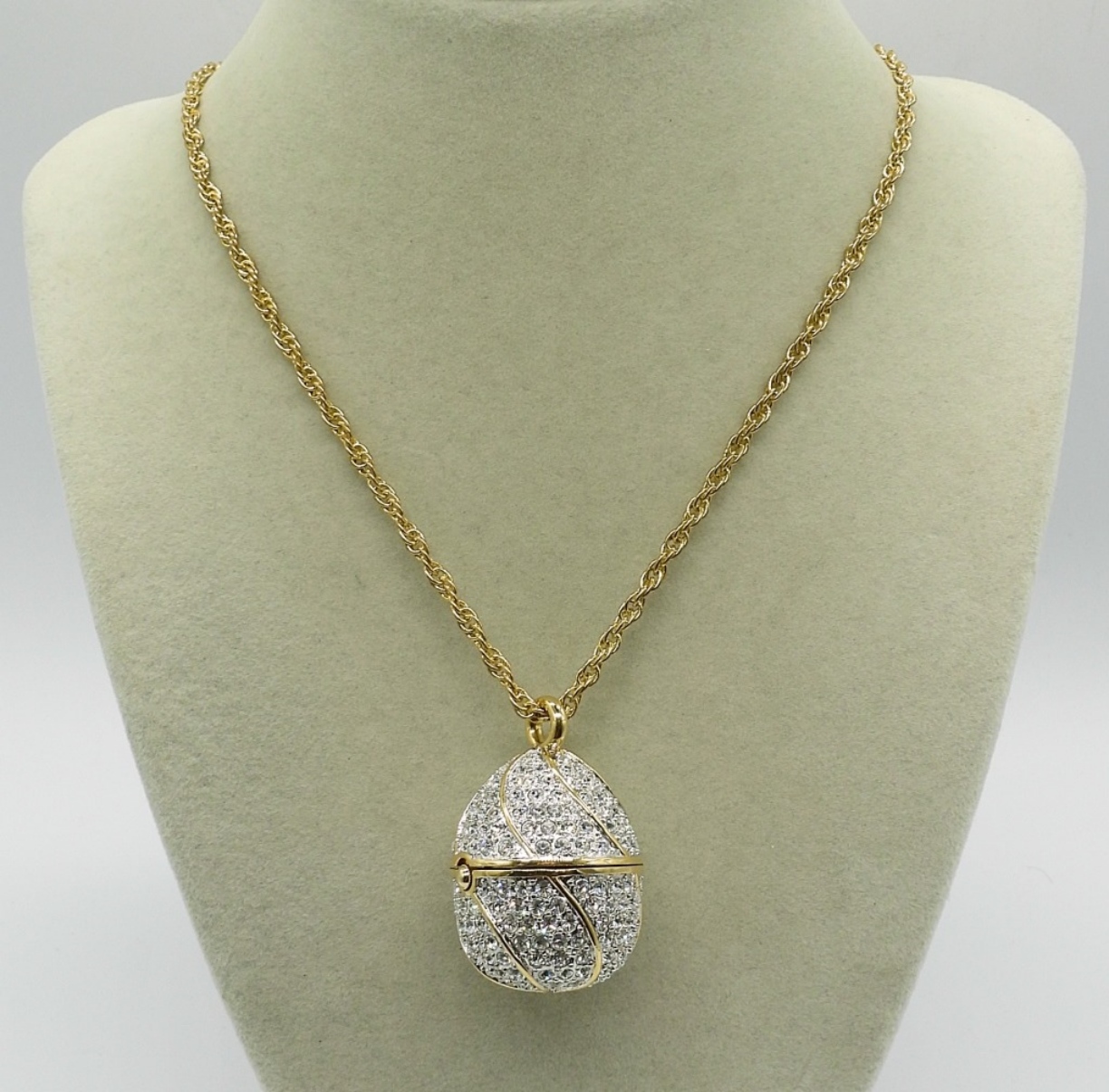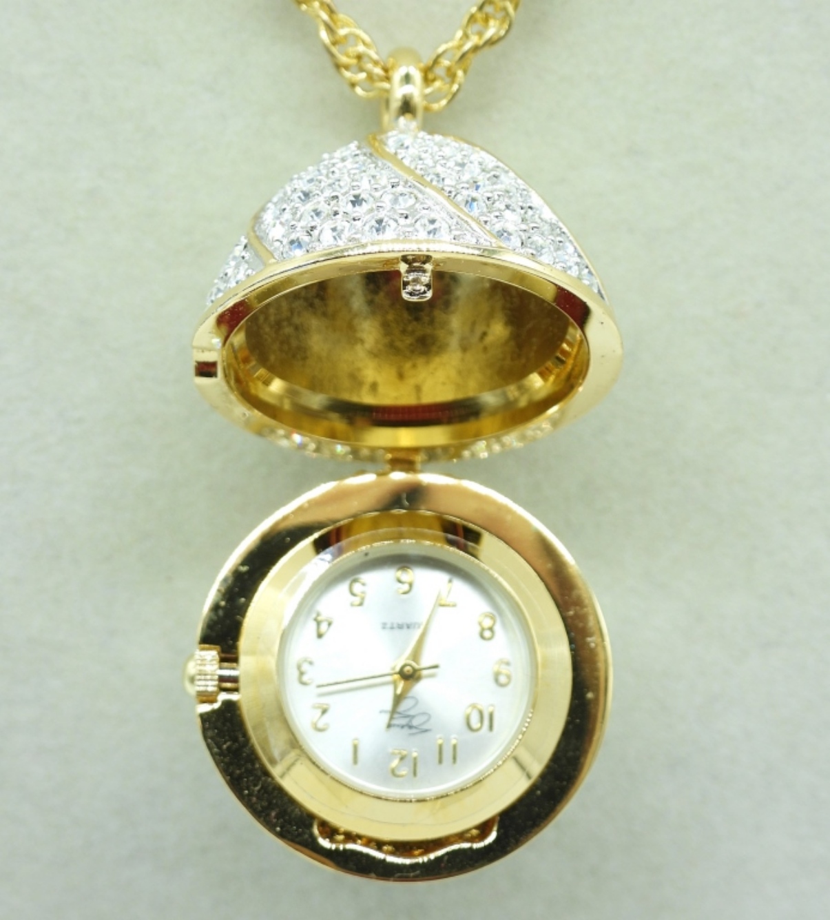 RARE SUZANNE SOMERS RHINESTONE GOLD TONE EGG WATCH PENDANT ON A 28″ CHAIN. VERY PRETTY! (NOT TESTED AS TO WORKING OR NOT)