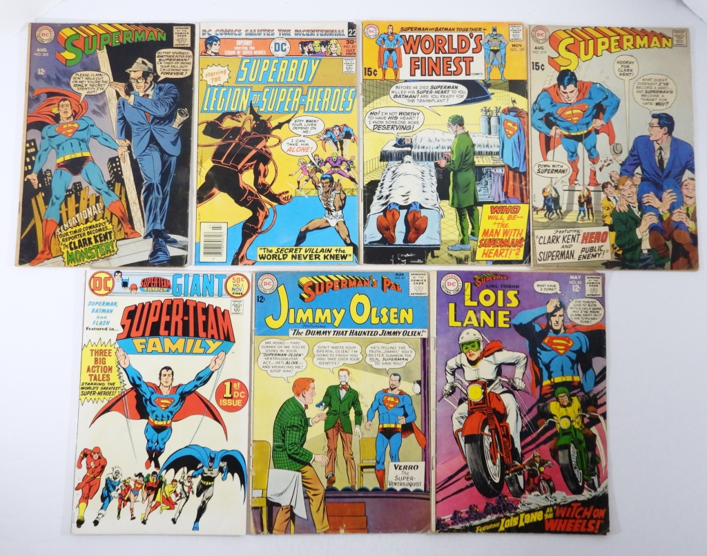 12C,15C AND 30C COMICS, GOOD OR BETTER, #218 SUPERBOY LEGION OF SUPER-HEROES, WORLD’S FINEST #189, SUPERMAN #219,209 , #67 SUPERMAN’S PAL JIMMY OLSEN, SUPERMAN’S GIRLFRIEND LOIS LANE #83, SUPER-TEAM FAMILY