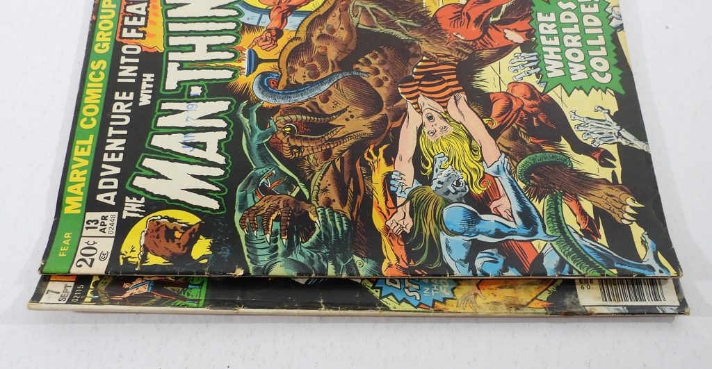 MARVEL ADVENTURE INTO FEAR WITH THE MAN-THING #13 1972 (VG) “WHERE WORLDS COLLIDE”. MARVEL SKULL THE SLAYER #7 1976 “DUNGEON OF BLOOD” (GOOD).