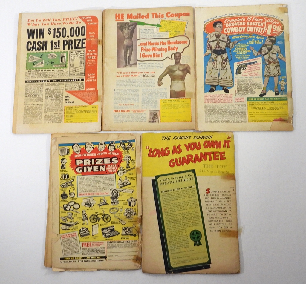 1952 PRIZE COMICS WESTERN # 94 (FAIR) SEVERIN AND ELDER – 1954 FRONTLINE COMBAT #15 (FAIR) – 1955 STRONG MAN “THE DEADLY HOUR” (FAIR) – 1952 PAUL TERRY’S COMICS #92 (FAIR) – 1949 SCHWINN INFORMATIVE COMIC (FAIR).